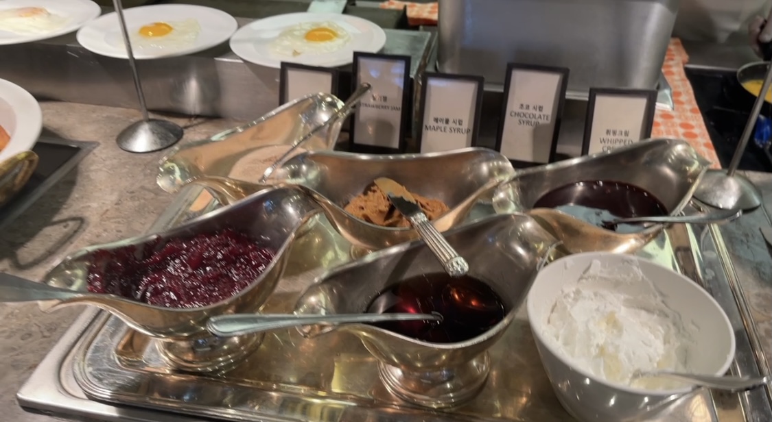 딸기잼, 땅콩잼, 메이플시럽, 생크림 등등