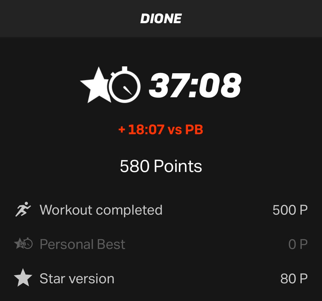탈라사를 하던 가락이 있어서 디오네가 다소 힘들긴 해도 쉼없이 주욱주욱 진행했더니 10분 안에 1라운드는 마칠 수 있었다. 전체적으로 탈라사보다 갯수가 늘어나니 앞뒤 버피시간은 격차가 벌어질 수 밖에 없다