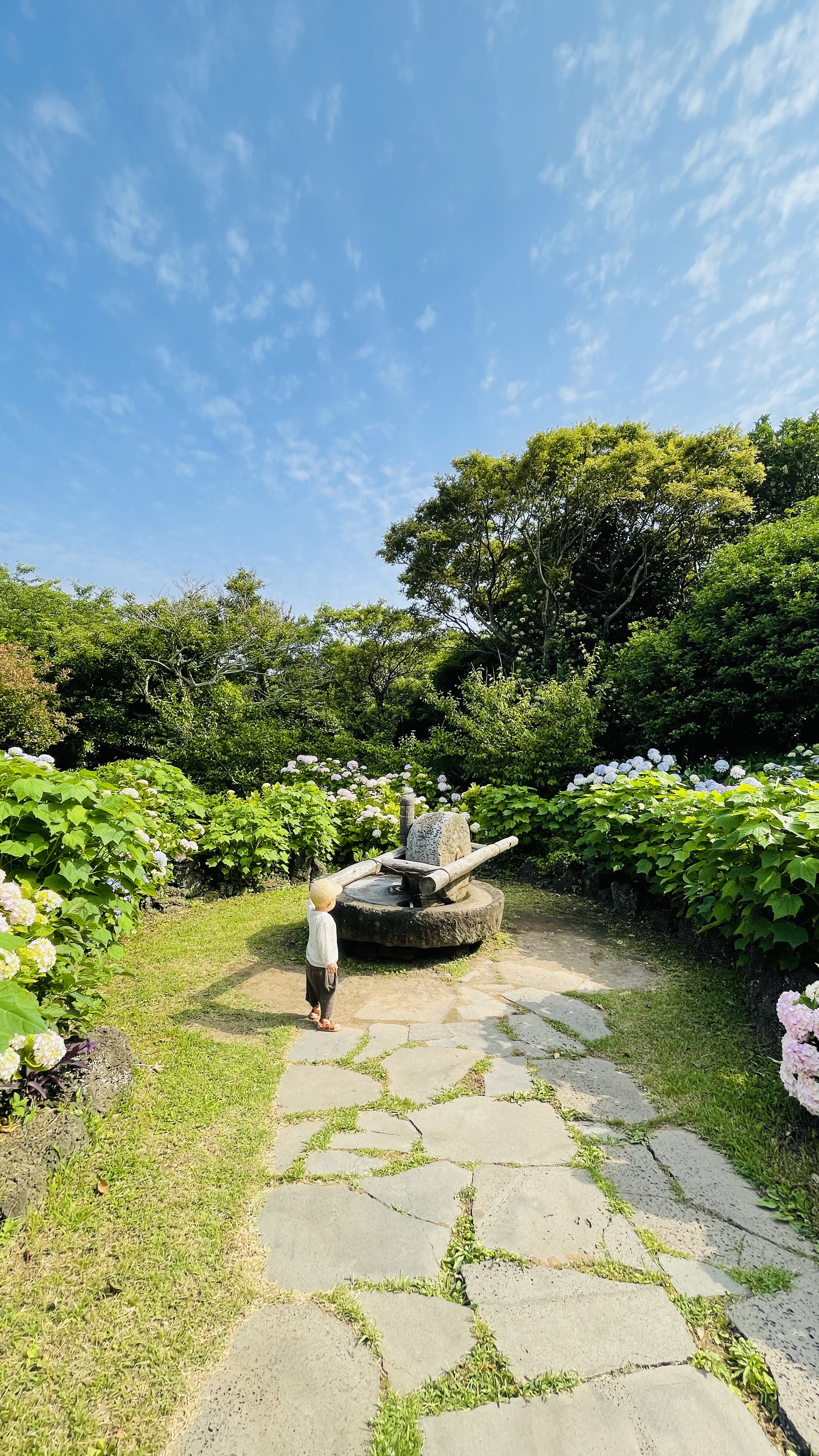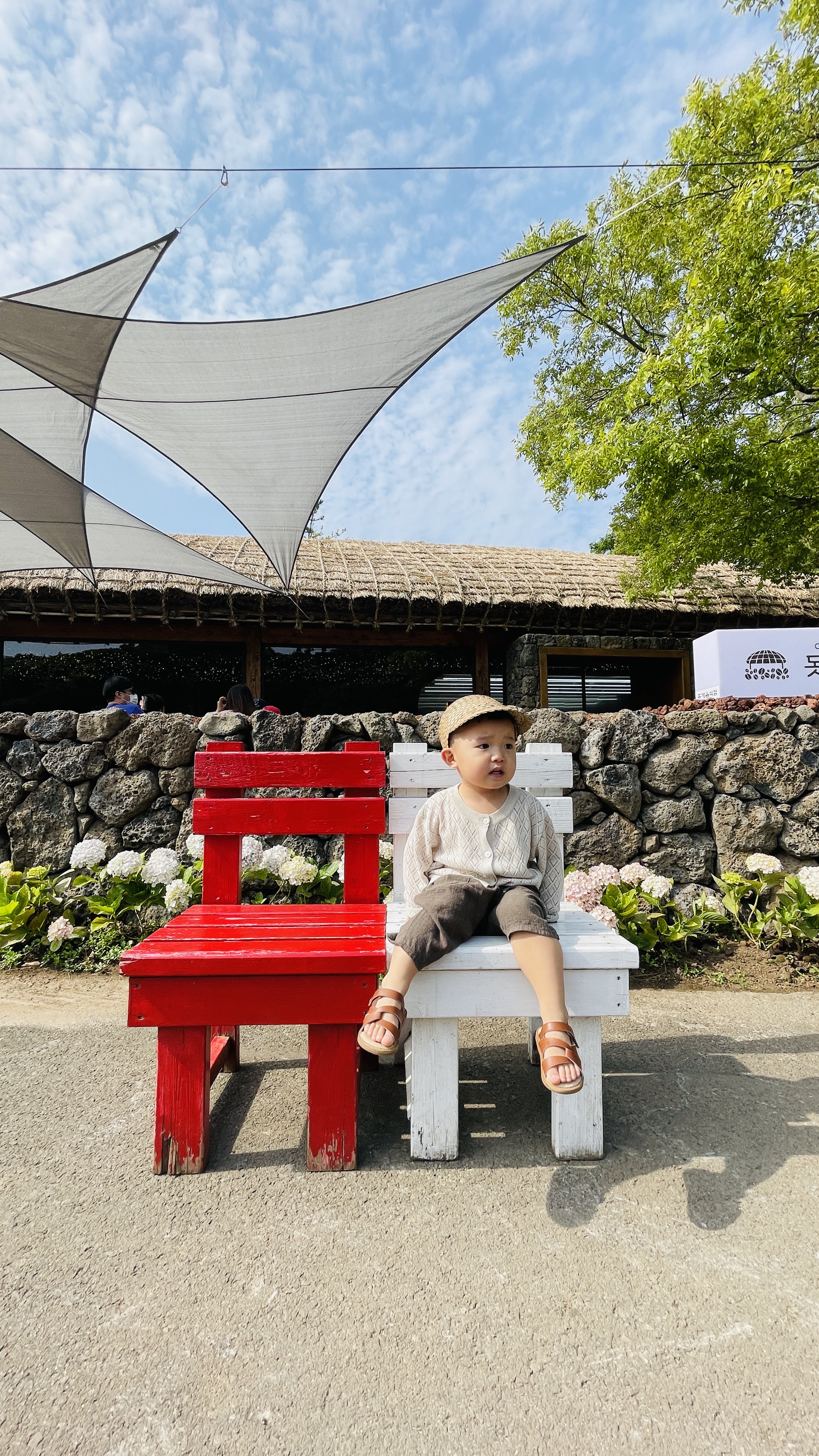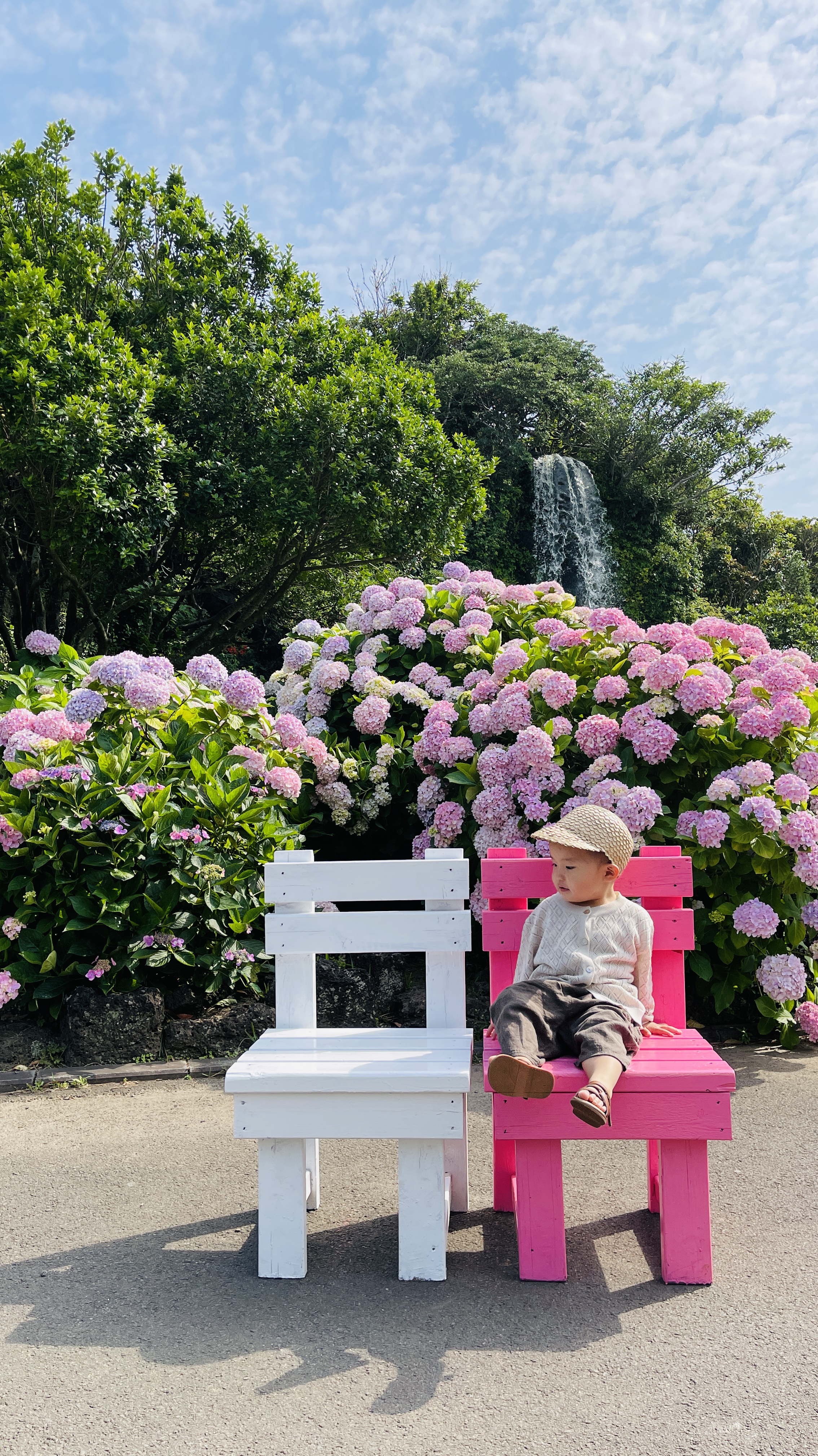입구부터 사진 찍기 좋은 포토존이 잘되어 있더라구요. 라온이가 좋아하는 핑크핑크 의자도 있고 마침 수국이 제철이라 뒷배경도 이쁘더군요.