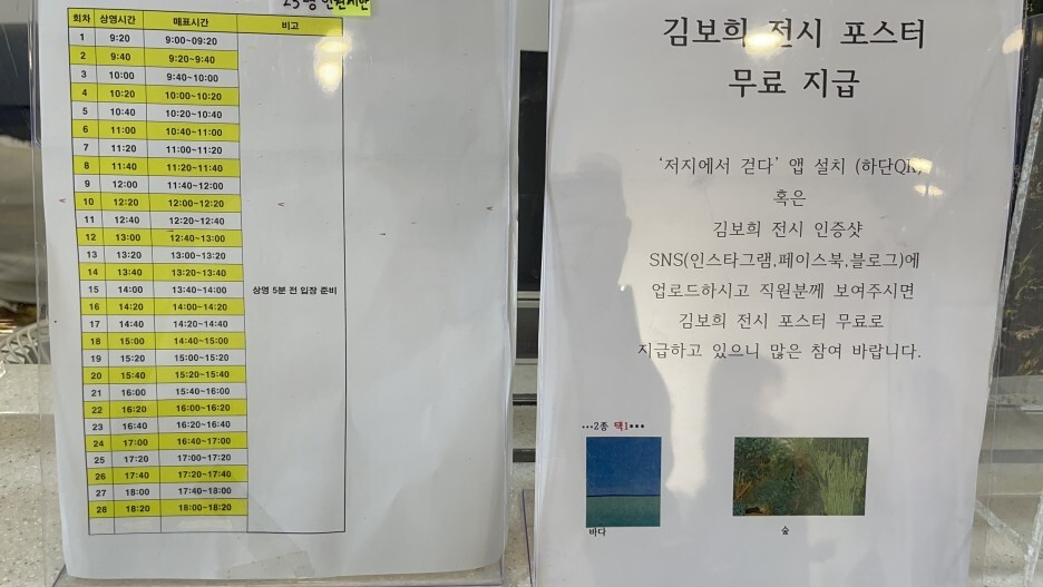 공공수장고의 미디어아트. 영상 시간표와 김보희 작가의 작품 포스터를 지급하는 행사가 진행중이다.