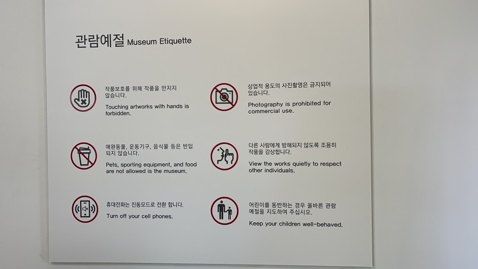 보통의 미술관 유의사항과비슷하다. 작품을 함부로 만지지 않고 다른사람의 관람에 방해 주지 않기, 애완동물 반입 금지 등이다. 사진촬영은 가능하지만 안전상의 이유로 삼각대 등의 보조장치 반입은 불가하다고 하니 참고하시길.
