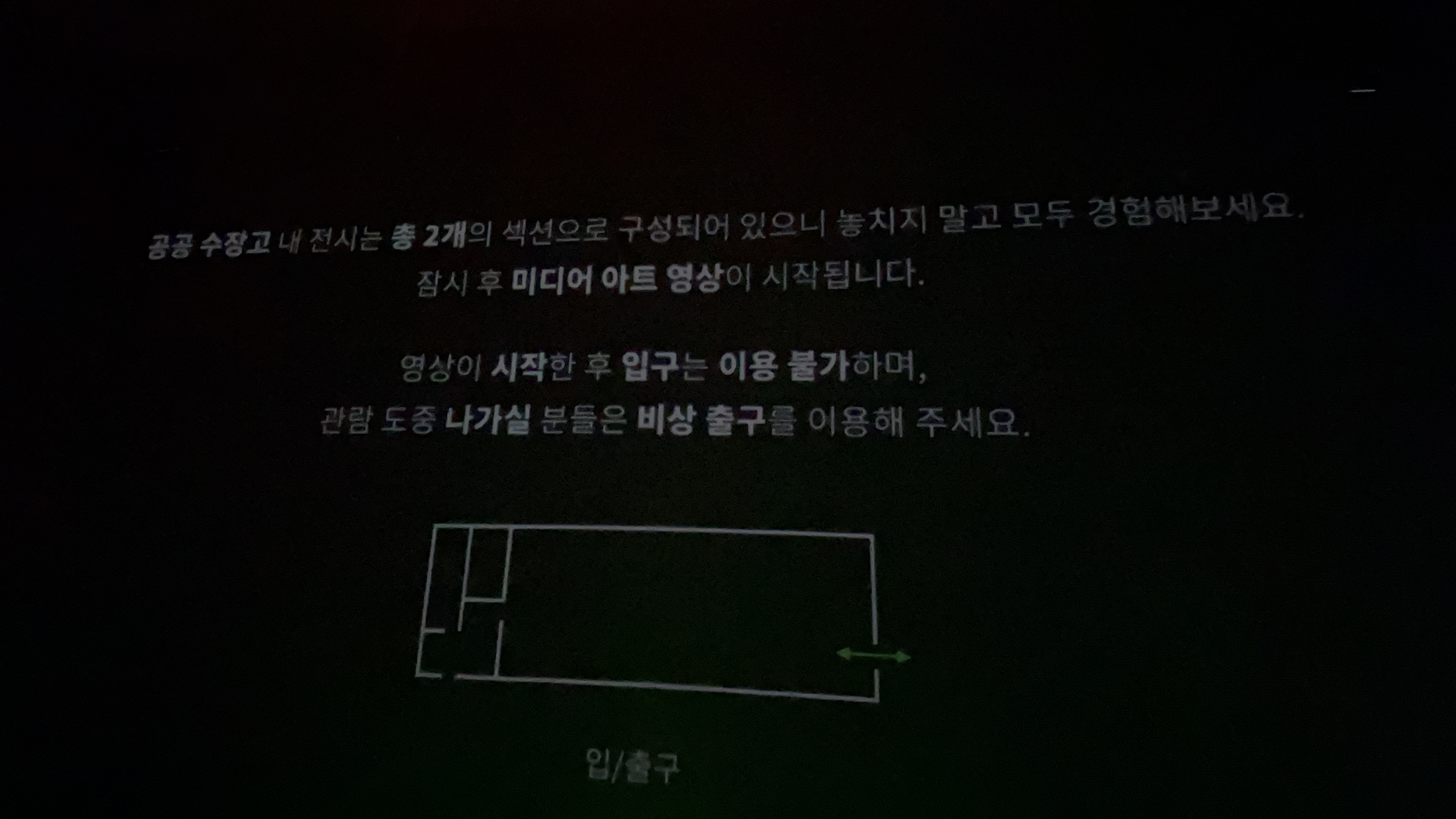 영상 안내와 유의사항. 플래쉬만 터트리지 않는다면 사진촬영은 가능하고 벽을 치게 되면 영상오류가 날 수 있다고 하니 아이를 동반한 경우라면, 조심 또 조심해야 할 것 같다.