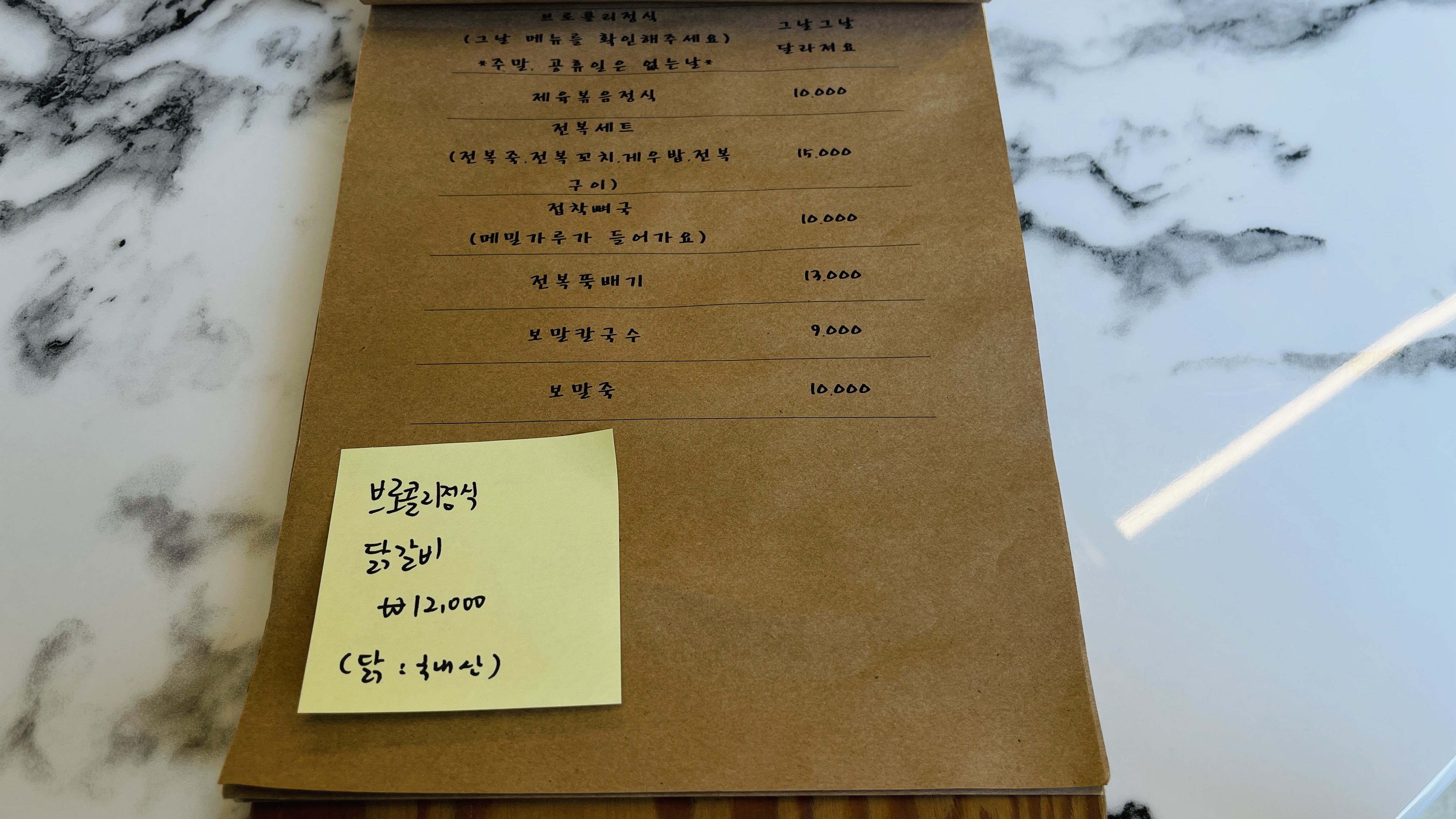 요일마다 바뀌는 메뉴. 메뉴판에 포스트잇으로 오늘의 정식을 표시해 준다. (주말, 공휴일에는 정식메뉴 미운영)