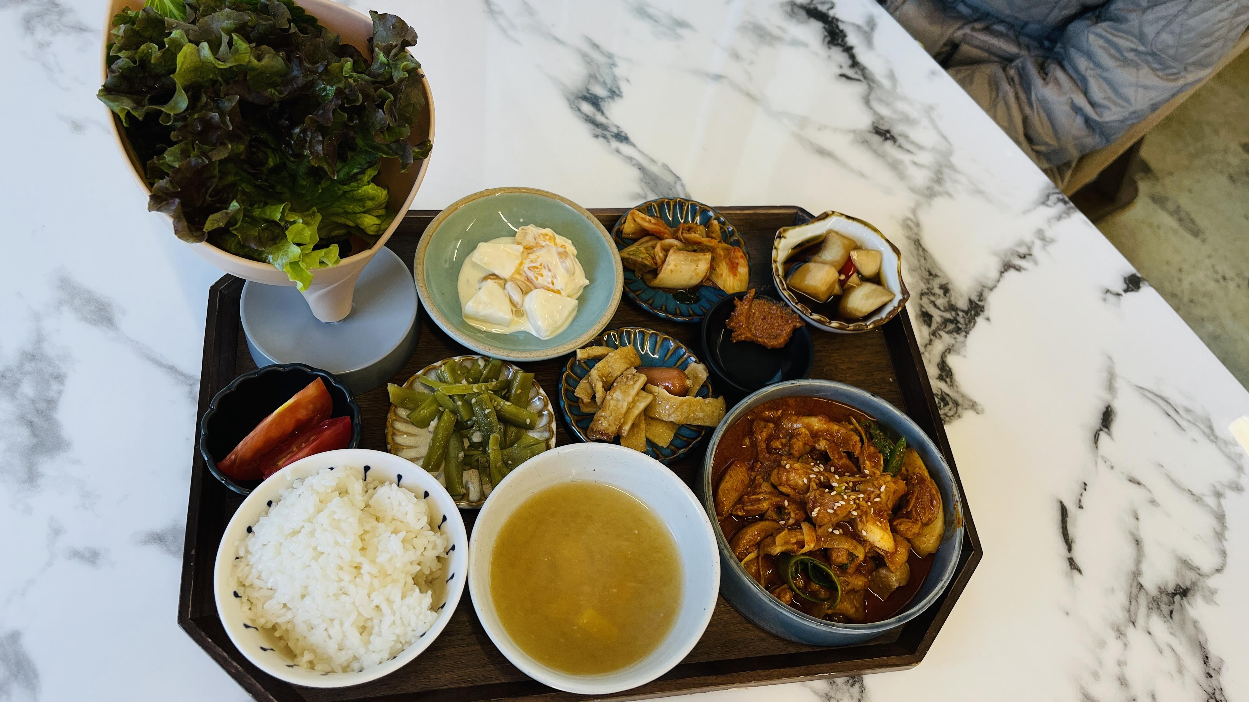 따뜻한 밥 한공기와 맑은 된장국, 그리고 메인요리 닭갈비와 식감이 좋은 궁채나물과 어묵비엔나, 김치와 양파장아찌 그리고 쌈과 디저트 토마토와 샐러드! 한상 풀코스 요리다.