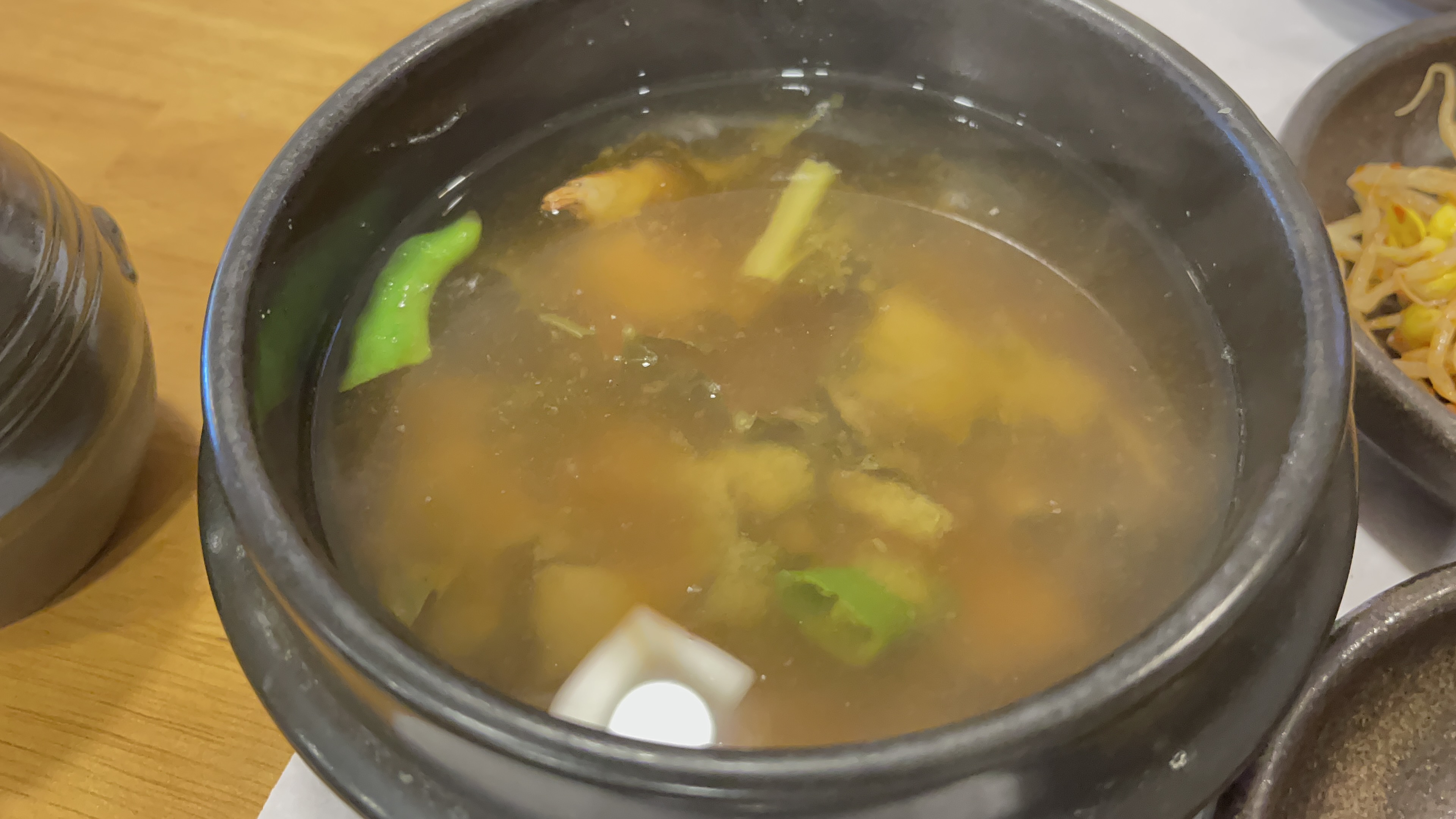 정체모를 무침과 부드러워서 라온이가 먹기 딱좋은 계란찜과 약간 매콤하다는 맑은 된장국(매운거 좋아하는 사람에겐 그냥 된장국) 그리고 쌈과 고추.. *청량고추를 달랬는데 없다해서 그냥 먹었더니 오이고추같은 녀석이 아주 매콤하다!! 오.. 매력적이야!
