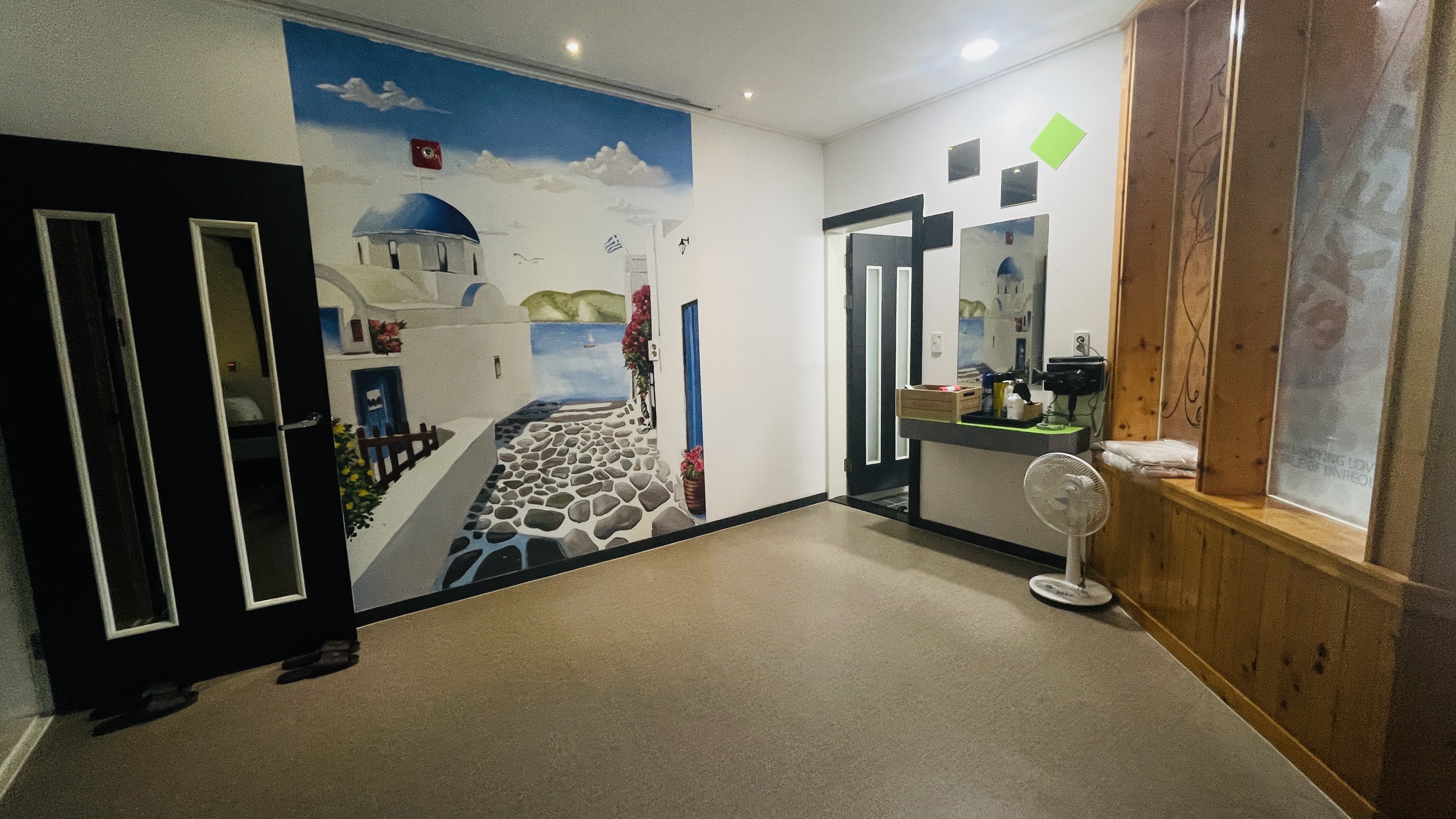산토리니 벽면 위쪽에서 빔프로젝트 스크린이 내려온다. 스크린은 객실에 비치된 리모콘으로 조절가능하다.