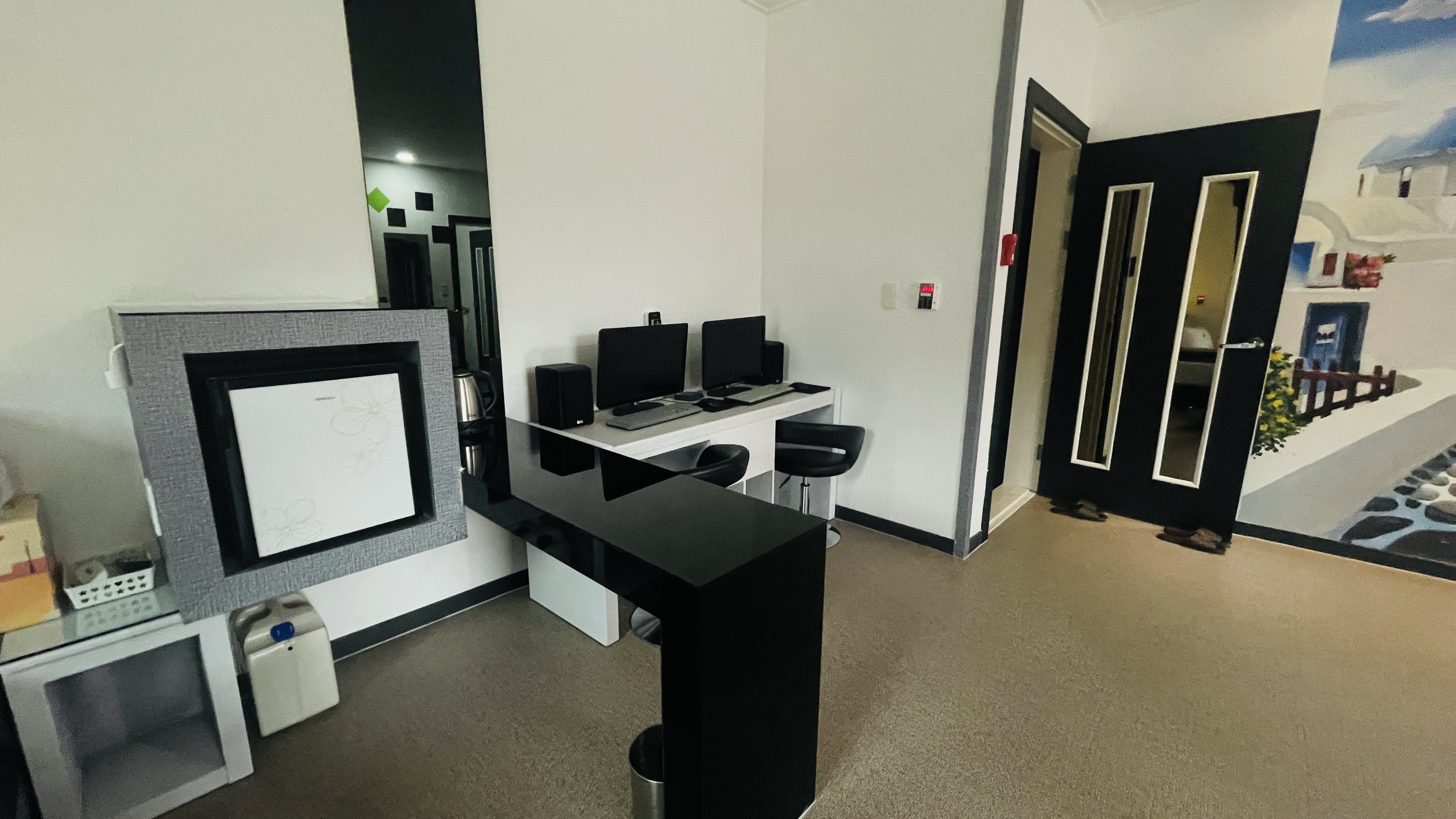 내부에는 냉장고와 커플PC가 준비되어 있으며 PC와 빔프로젝트가 연결되어 있어 영화관람 시 활용하면 되고 우퍼스피커가 있어서 음량도 빵빵하다!