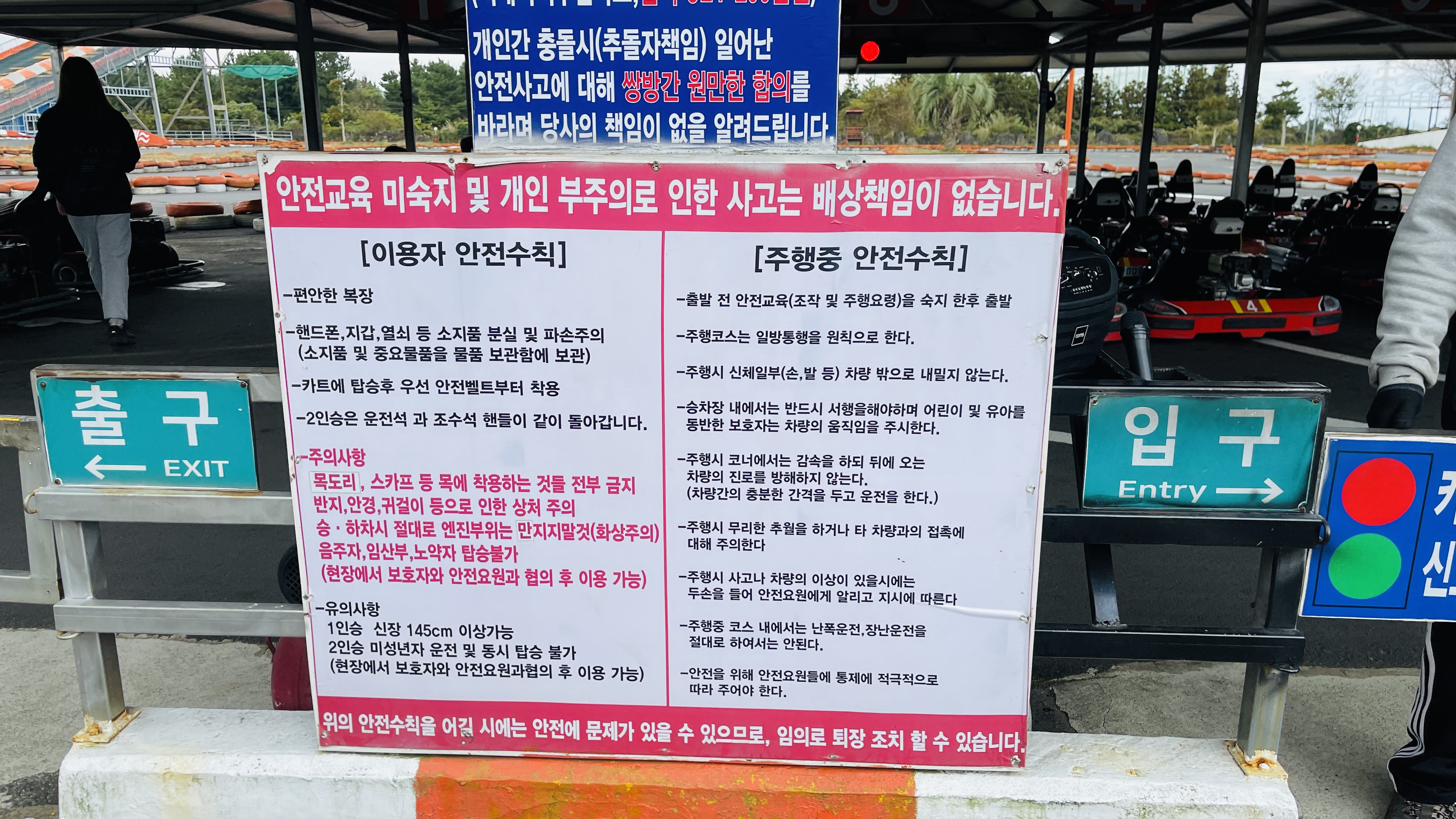 카트레이싱 대기 중. 사람이 많아서 코스방향이 다른 것인지 아니면 장거리라서 이 방향으로 타는 것인지는 잘 모르겠지만 일단 이렇게 앉아서 직원의 유의사항을 경청한다. 아이와 탑승 시에 보호자는 왼쪽, 아이는 오른쪽에 앉으면 된다고 한다.