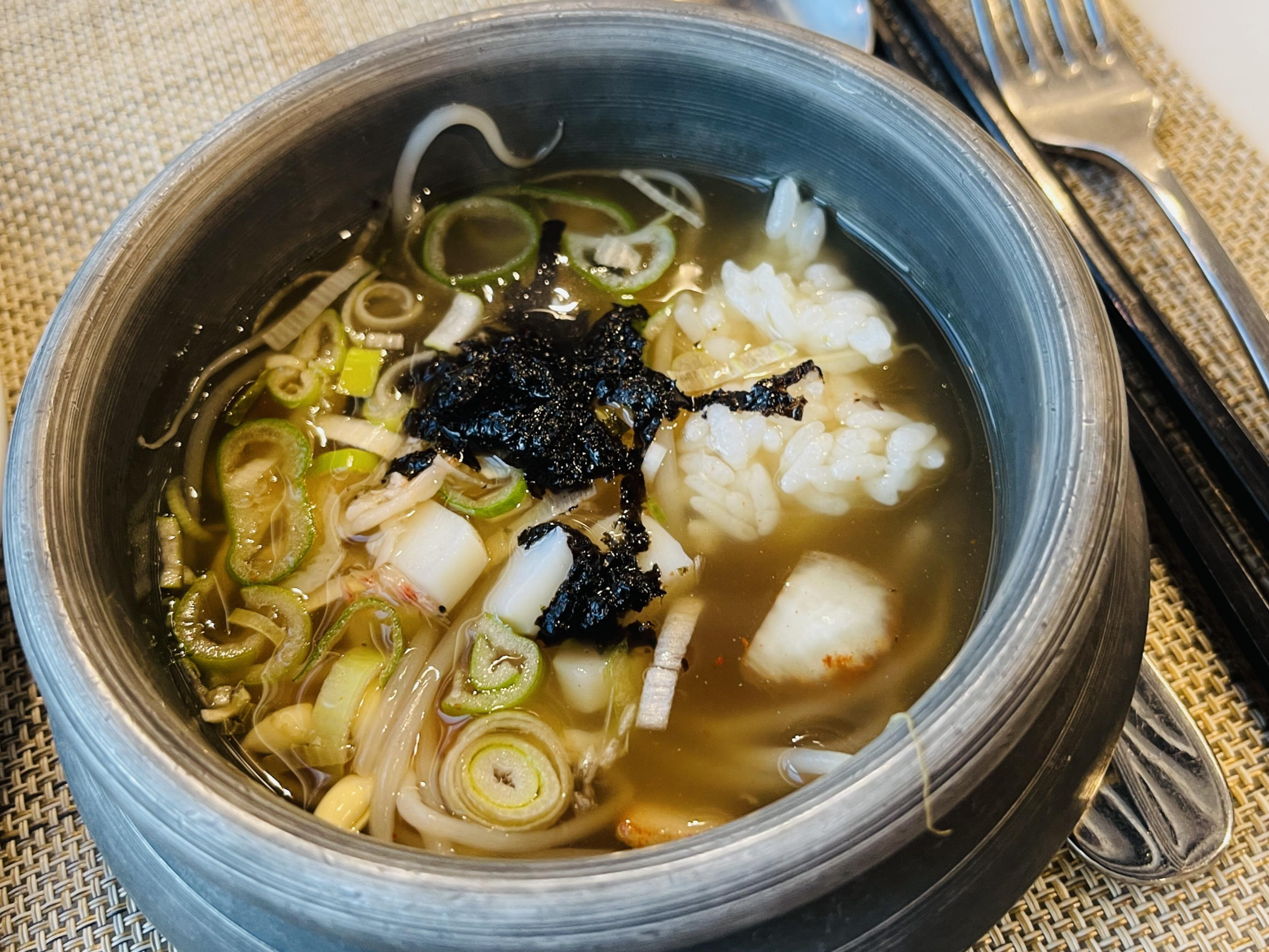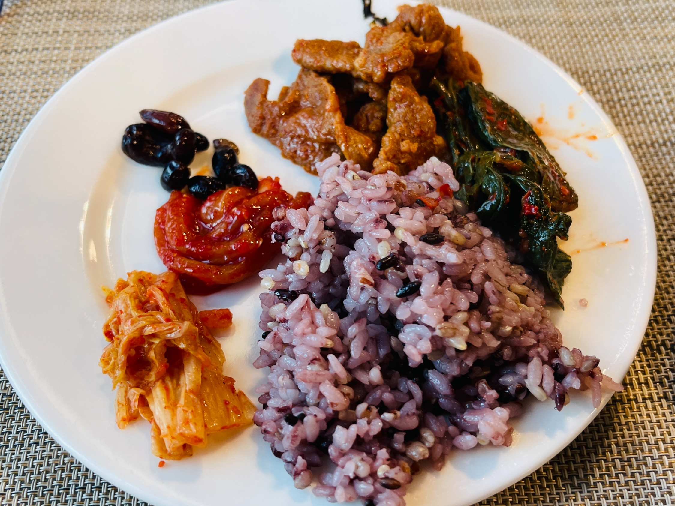 한식으로 바꿔서 갓김치와 견과류자반, 오징어 젓갈과 제육볶음에 콩나물국밥까지 먹고,