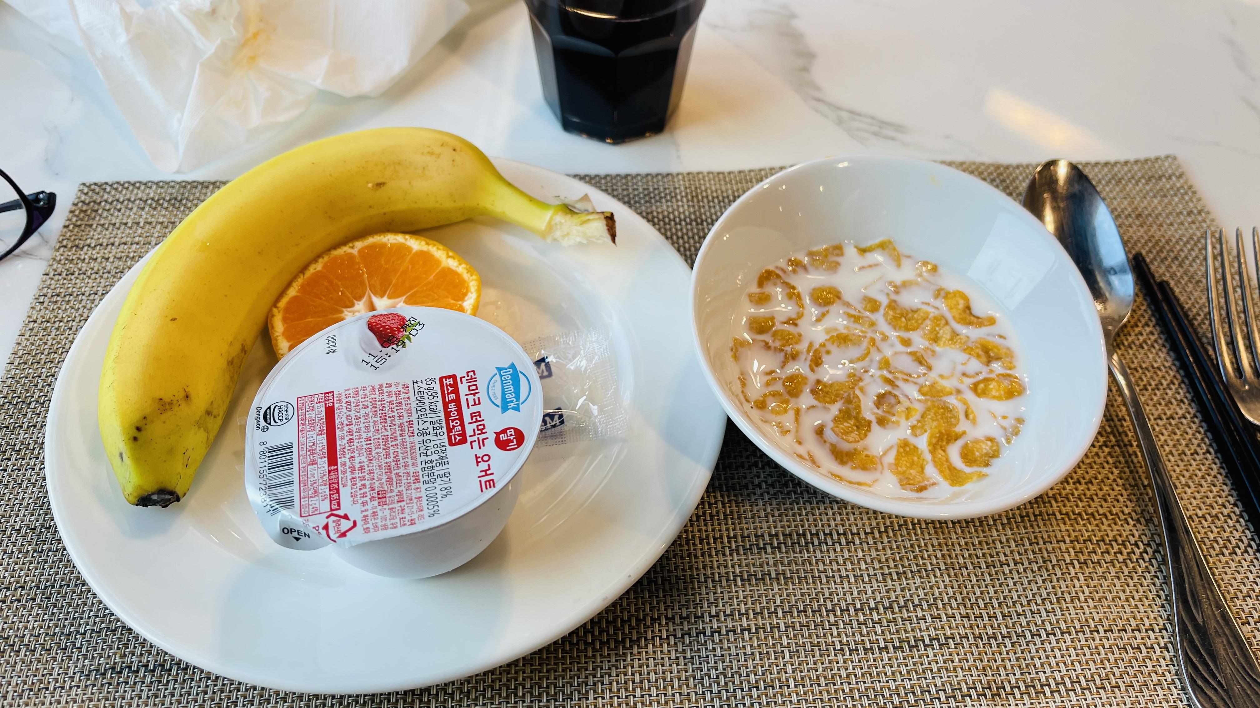 후식으로 과일과 요거트 그리고 시리얼까지 말아 먹고 간단하게 조식 마무리!