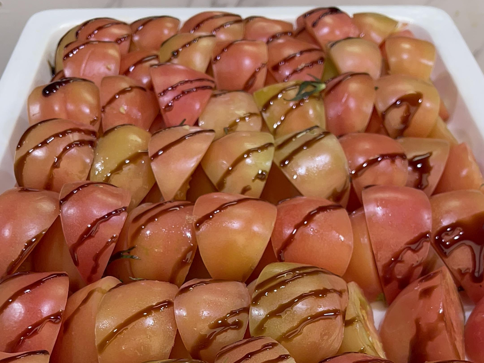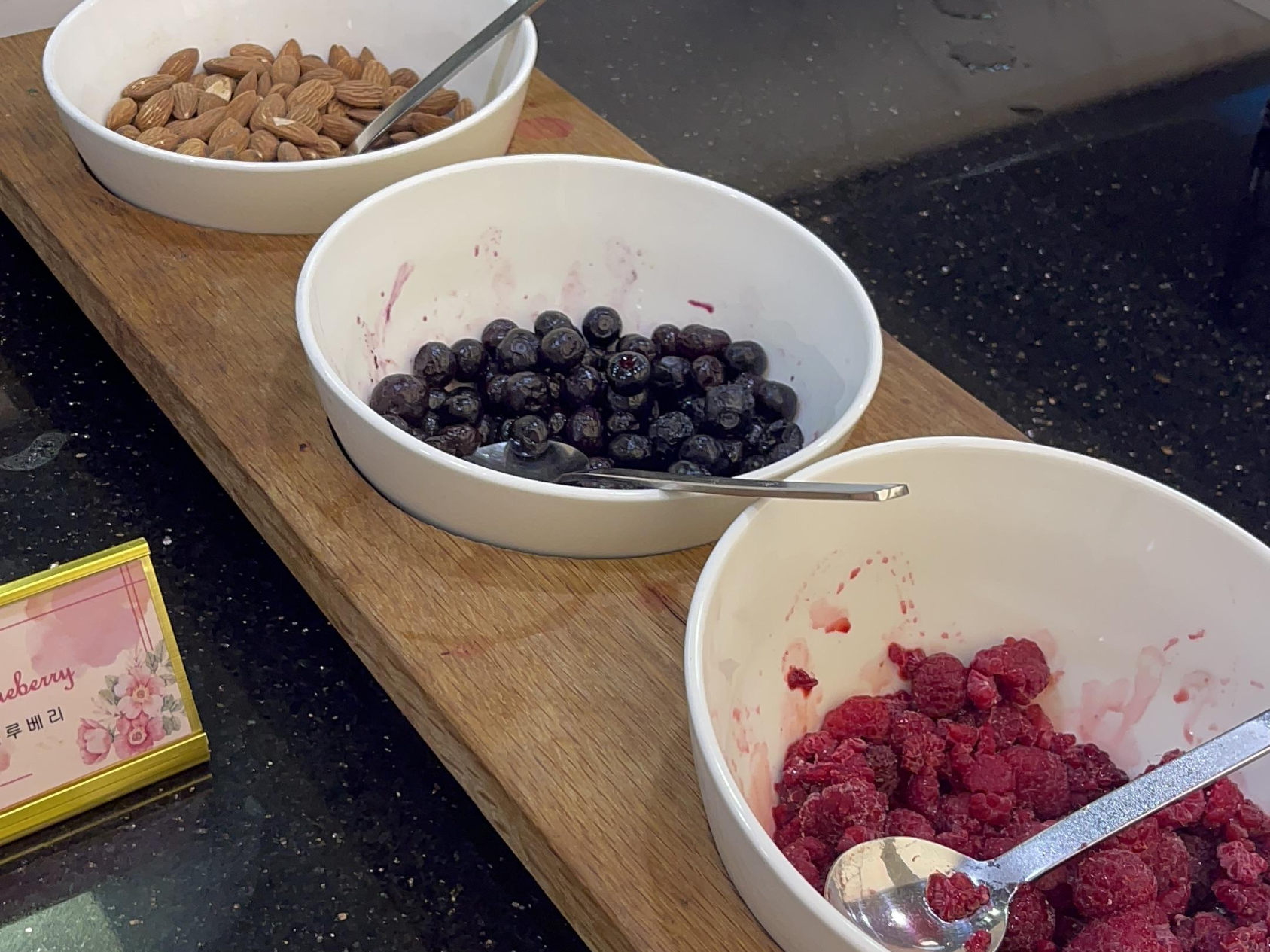 무언가가 뿌려진 토마토인데 토마토맛이 훨씬 강해서 소스는 무엇인지 모르고 먹었다. 아몬드와 블루베리, 복분자 삼총사도 준비되어 있다.