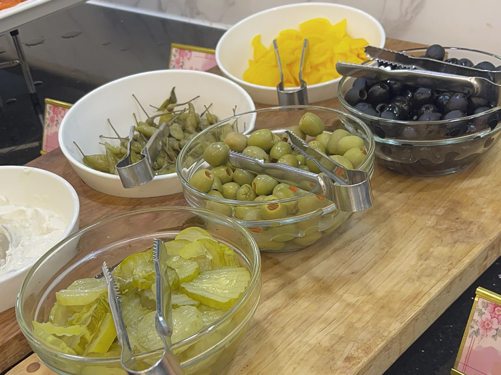 훈제연어는 흐물흐물한 식감, 그런대로 먹을만 하긴 했고 올리브나 피클, 단무지 등은 곁들일 수 있게 준비되어 있다.