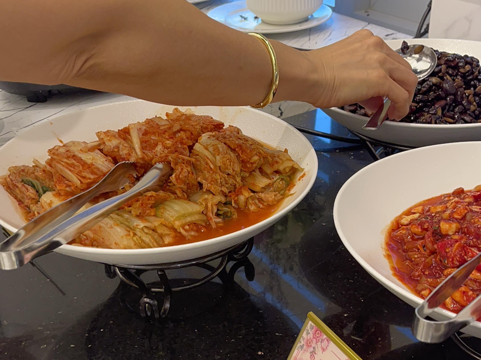 특이하게 콩자반이 아니라 견과류자반이다. 견과류를 좋아해서인지 이런 음식은 반갑다. 오징어 젓갈은 말해 무엇하랴! 배추김치는 신김치마냥 침샘을 자극해서 좋다.