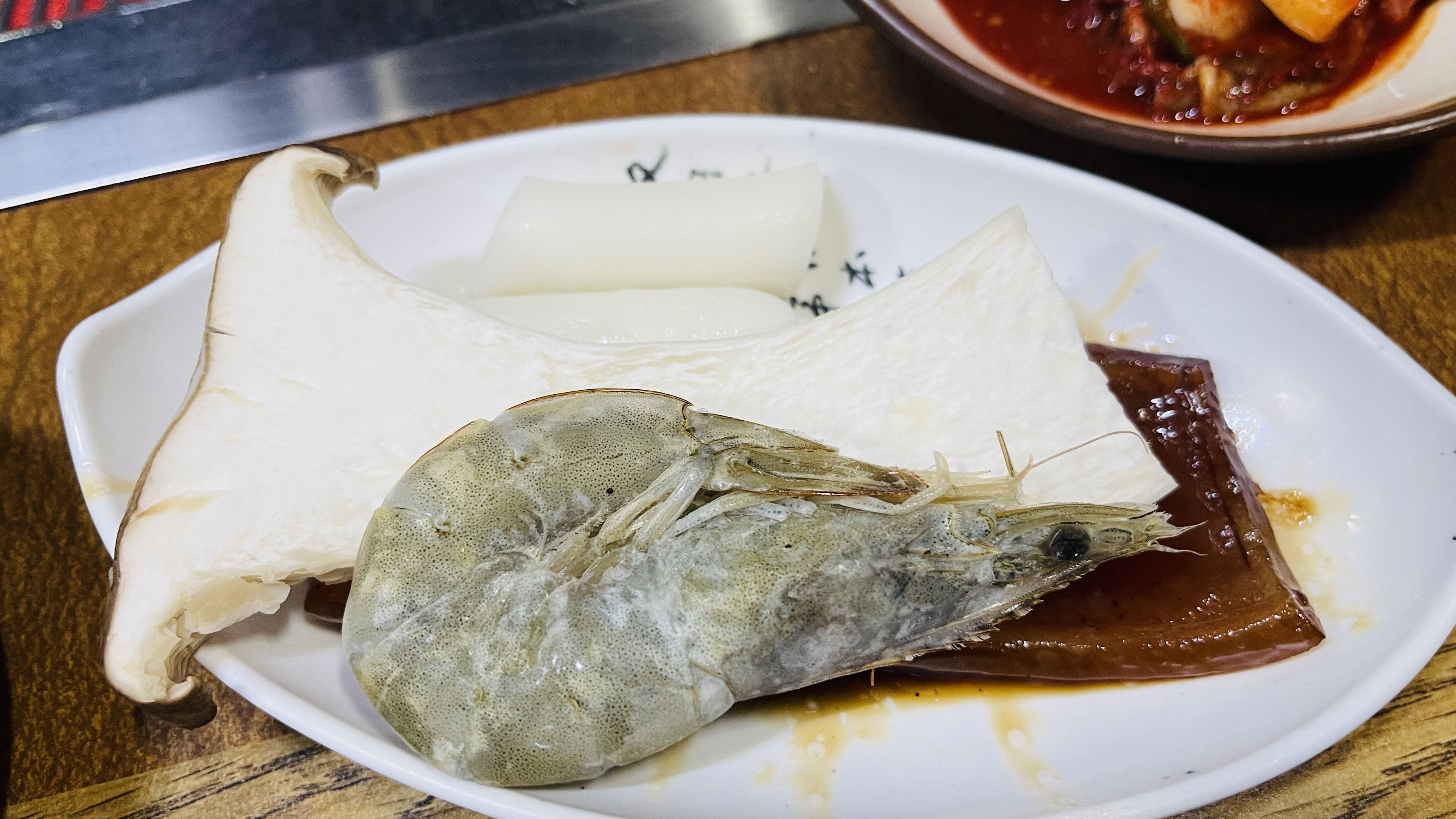 서비스로 나오는 계란찜 굿! 라온이는 계란찜만으로 1공 뚝딱! 계란찜 추가는 기본!(추가는 2,000원) 원래 양념오징어구이와 돼지껍데기였는데 요즘은 냉동새우가 서비스로 나온다. 고기를 구우면서 같이 구워먹으면 됨.