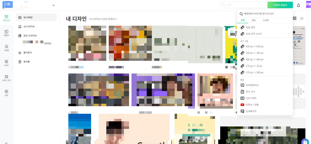 로그인을 하게 되면 우측 상단에 디자인 만들기라는 버튼이 보이며, 해당버튼을 누를 경우, 원하는 스타일과 규격을 만들 수 있고, 최근에 사용한 규격들도 표시가 된다. 스크롤을 내리면 정말 다양한 형태의 디자인을 선택할 수 있으니 본인이 제작하려는 용도에 맞게 선택해주면 된다. 일단, 오늘은 블로그썸네일을 만들기 위함이니 정사각형 카드뉴스 스타일로 하기 위해 1080X1080 기본 사이즈로 선택해보기로 한다. 사이즈는 추후 수정 가능하다.