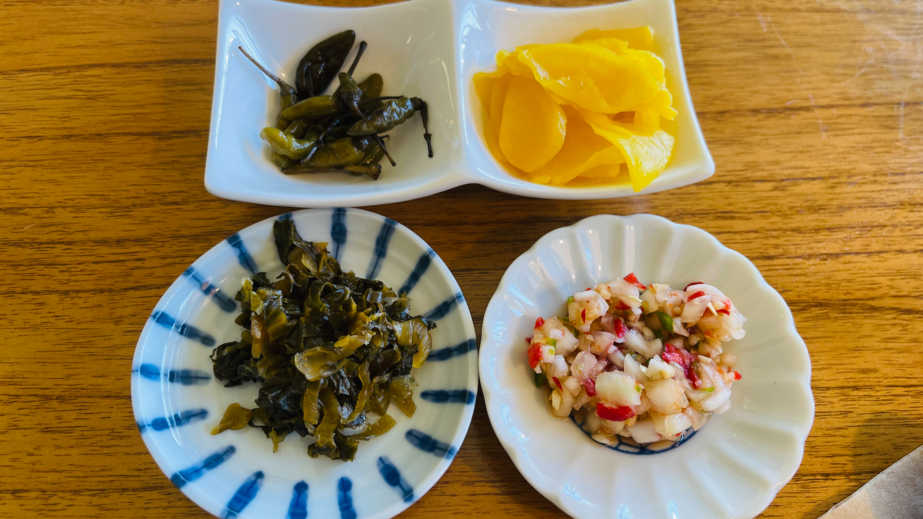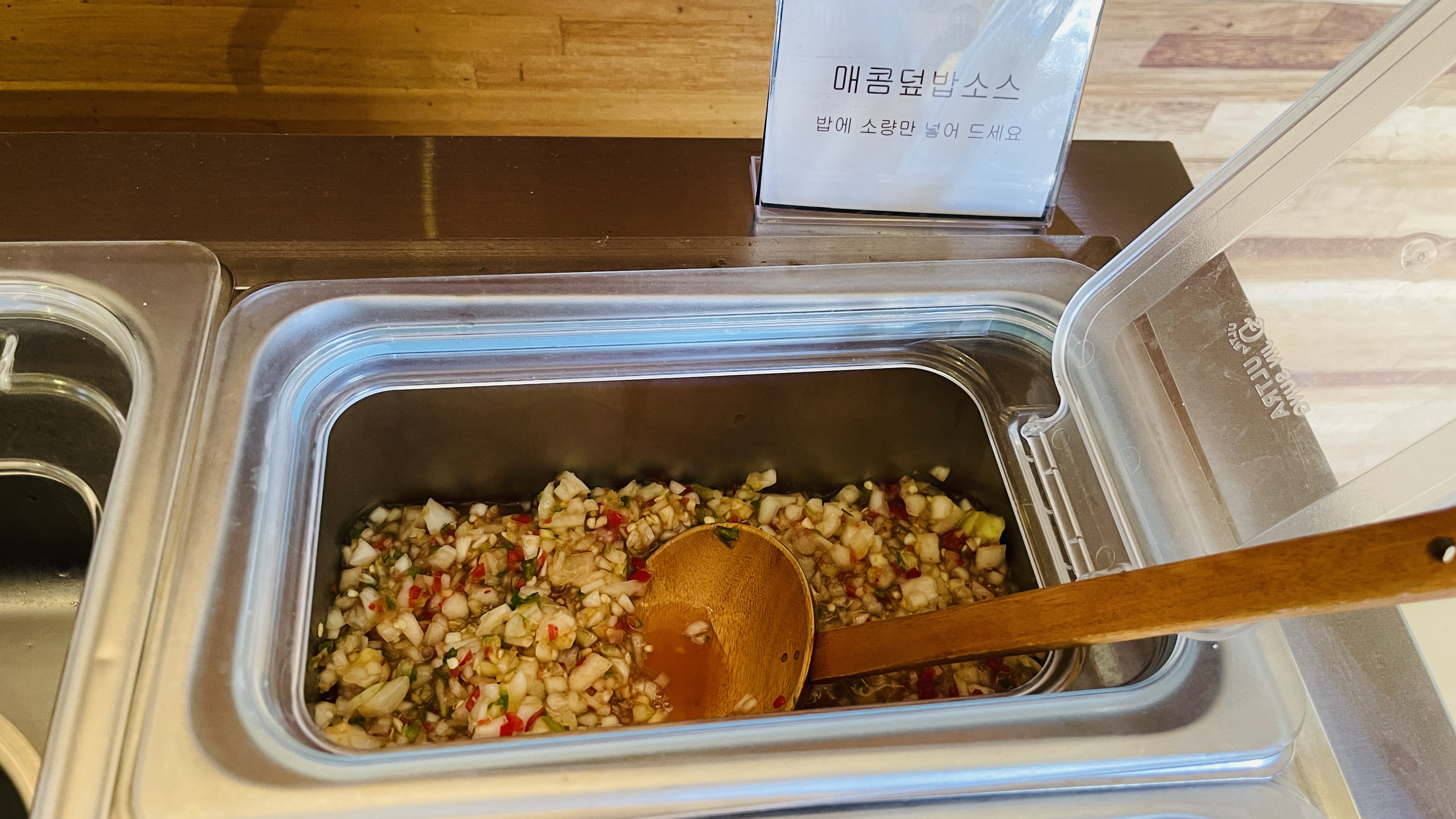 밑반찬은 셀프바를 이용하여 직접 떠야 한다. 밑반찬은 4가지 종류가 준비되어 있는데, 매콤덮밥소스와 일본식 갓김치와 꼬들단무지와 산고추절임.