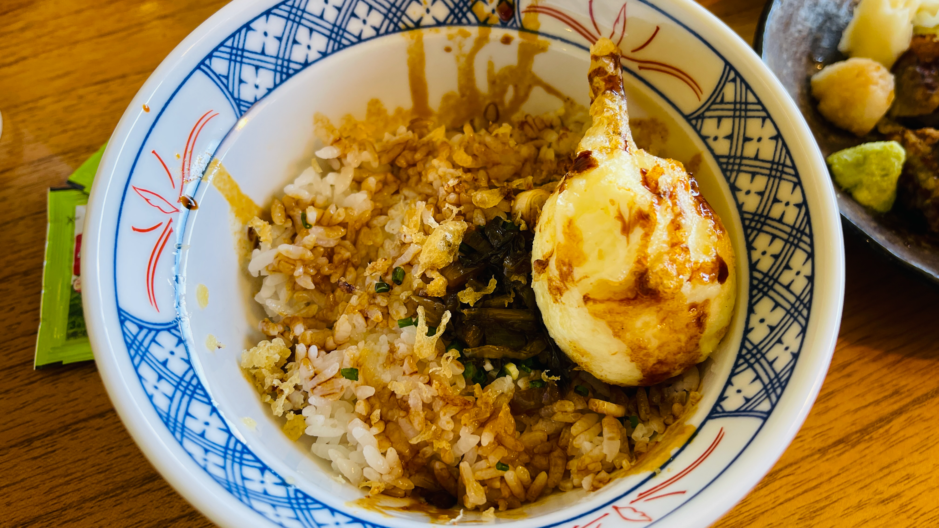 모든 튀김을 걷어내니 밥이 드디어 모습을 드러냈다. 온천계란이라고 이름 붙여진 반숙 계란이 보인다. 밥양은 정말 적다. 나와 같은 대식가에겐 아주 작은양이기 때문에 리필을 해야될 수도 있다. 그런데 튀김양이 많아서 천천히만 먹는다면 은근 배는 불러오는 편이다.