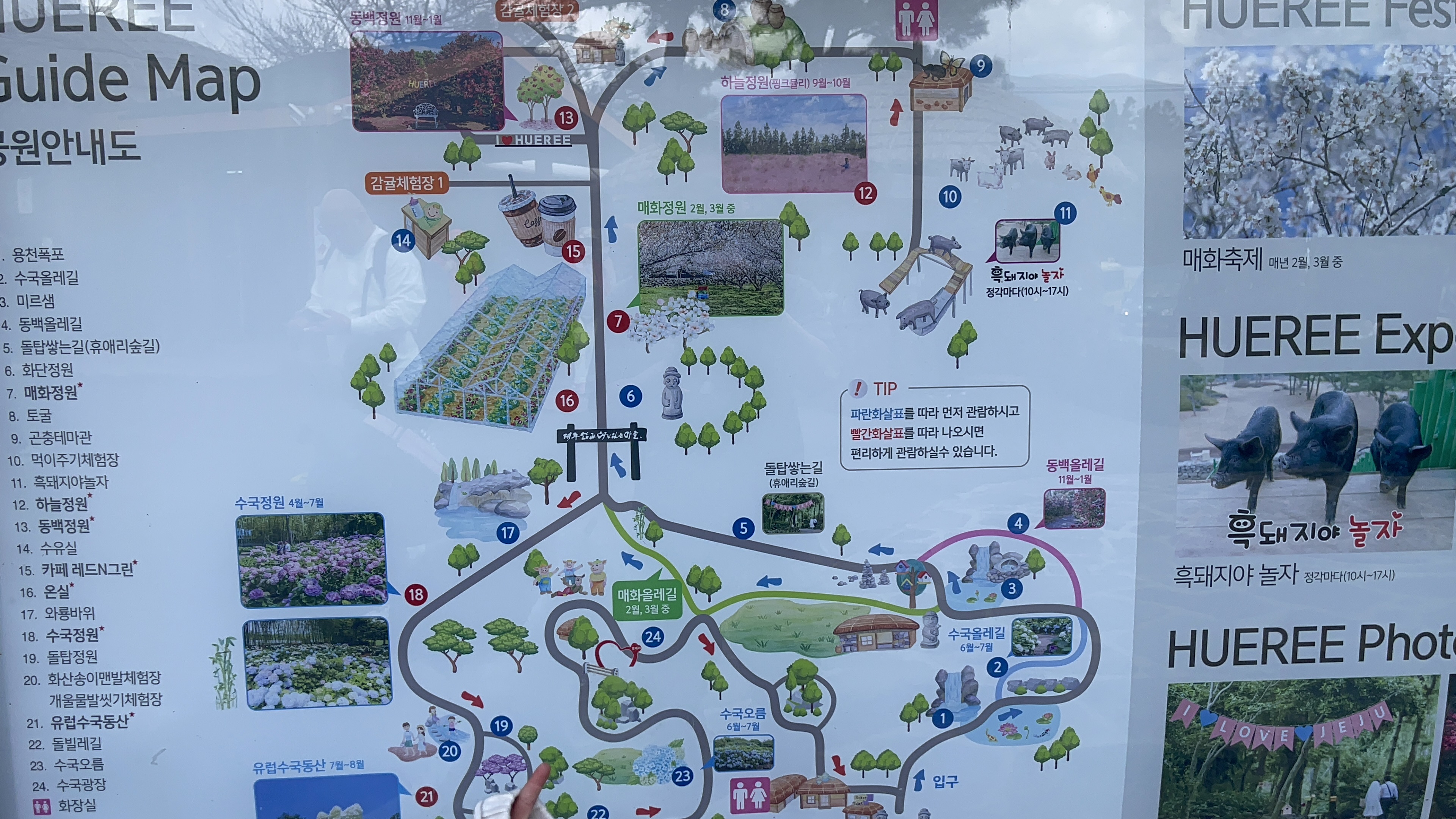 수국시즌에 휴애리 광고가 올라와 그 시기에만 가볼만한 곳인가 했는데, 수국 이외에 매화, 동백, 핑크뮬리를 비롯해 흑돼지 등 동물도 관람할 수 있는 곳이다. 지도를 보던 라온이는 '아빠! 돼지 보러가자!'라며 앞장서 본다. 휴애리는 꽃 축제 시즌에 맞춰가면 정말 좋을 것 같다. 꽃 축제기간은 다음과 같다.