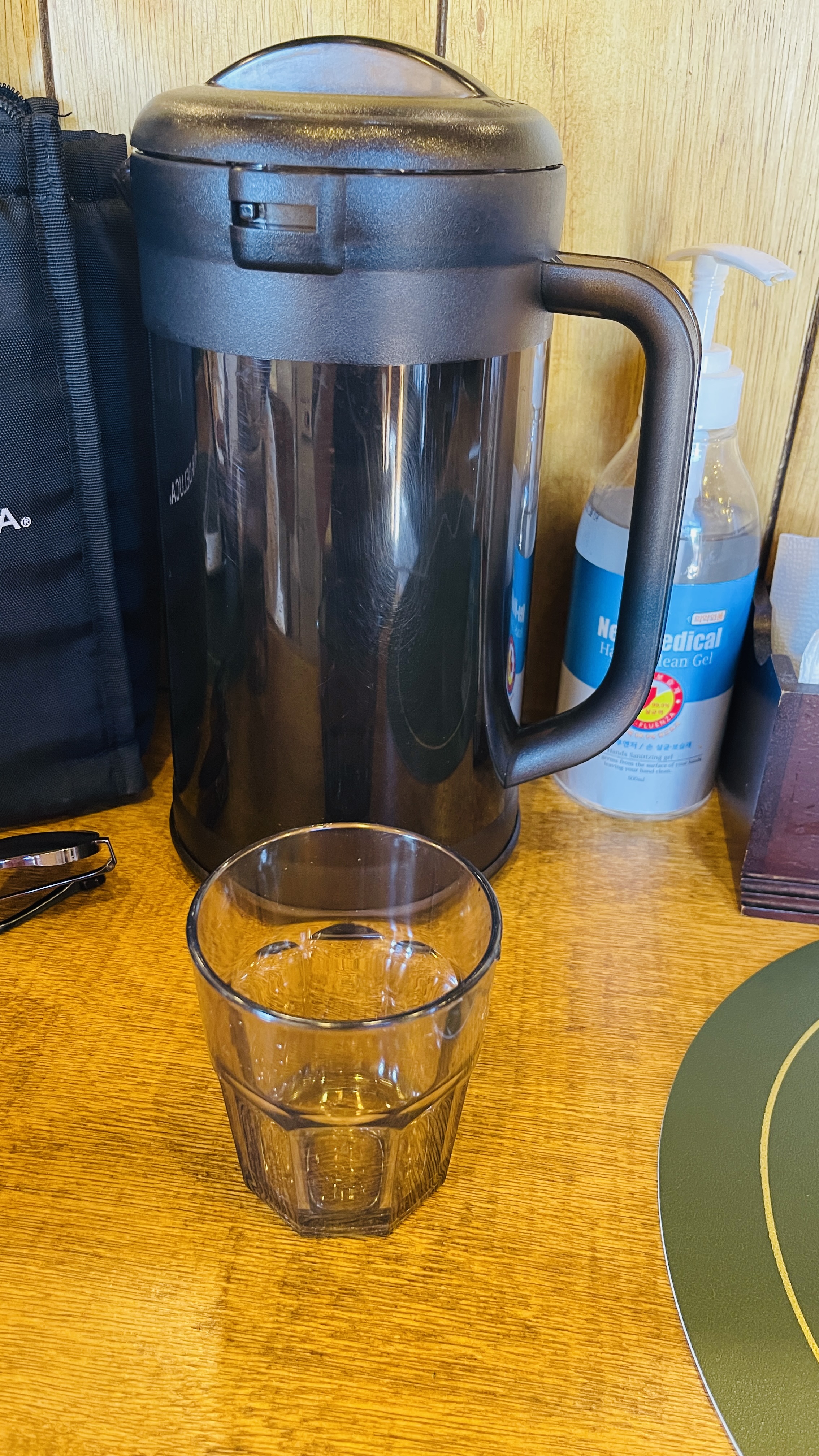휴애리가 인근에 있다보니 구경을 하고 주변맛집을 찾아온 여행객들이 대부분이었다. 카운터 석에 라온이와 나란히 앉았다. 후추와 시치미, 젓가락과 냅킨 등이 준비되어 있고, 물은 직접 따라먹게끔 되어 있는데, 나름 일본식 가게의 방법인 듯한 모습처럼 보인다. 물이 너무 시원해서 깜놀!
