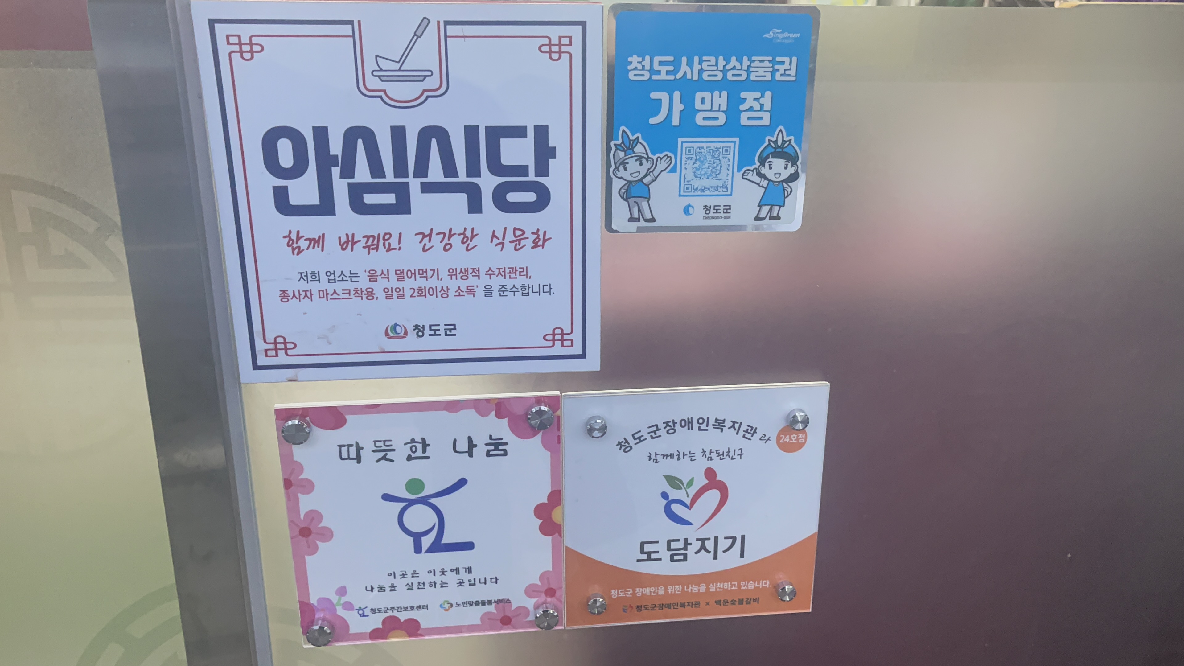 청도군에서 인증한 안심식당. 이웃과 따뜻한 나눔까지 하는 착한 식당으로 인증받은 명패가 붙어있다.