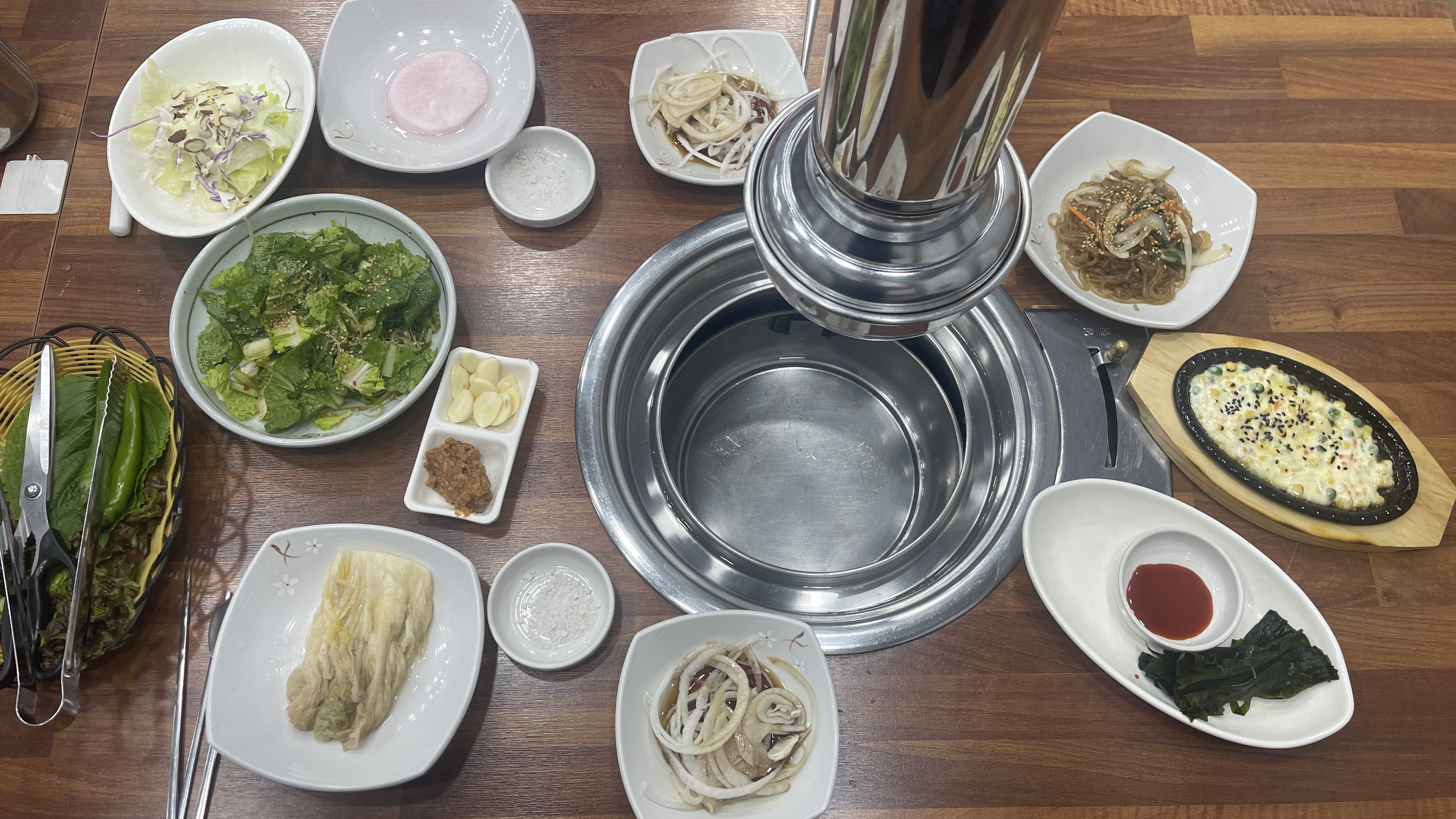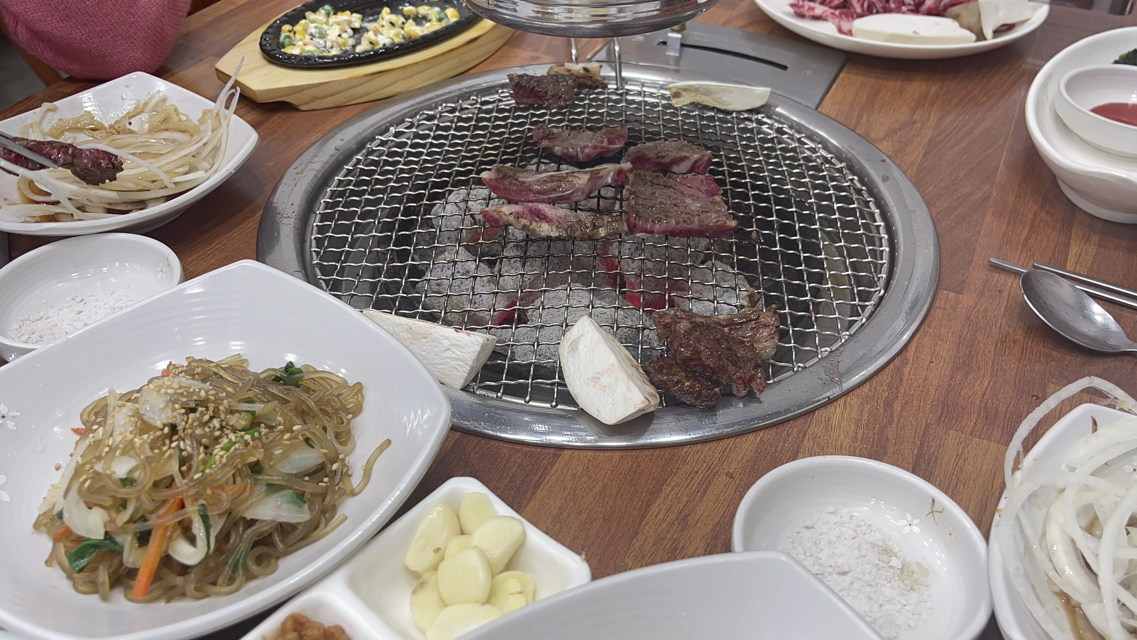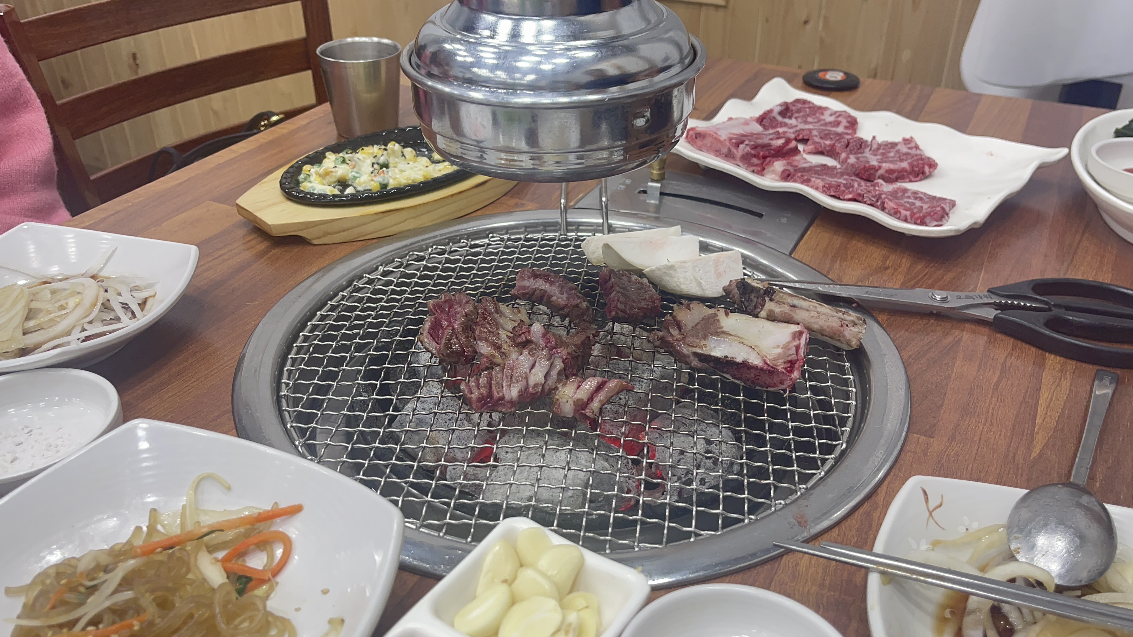 아쉬운 마음을 잡채와 묵은지 추가로 달래면서, 갈비살을 구워보기 시작한다.