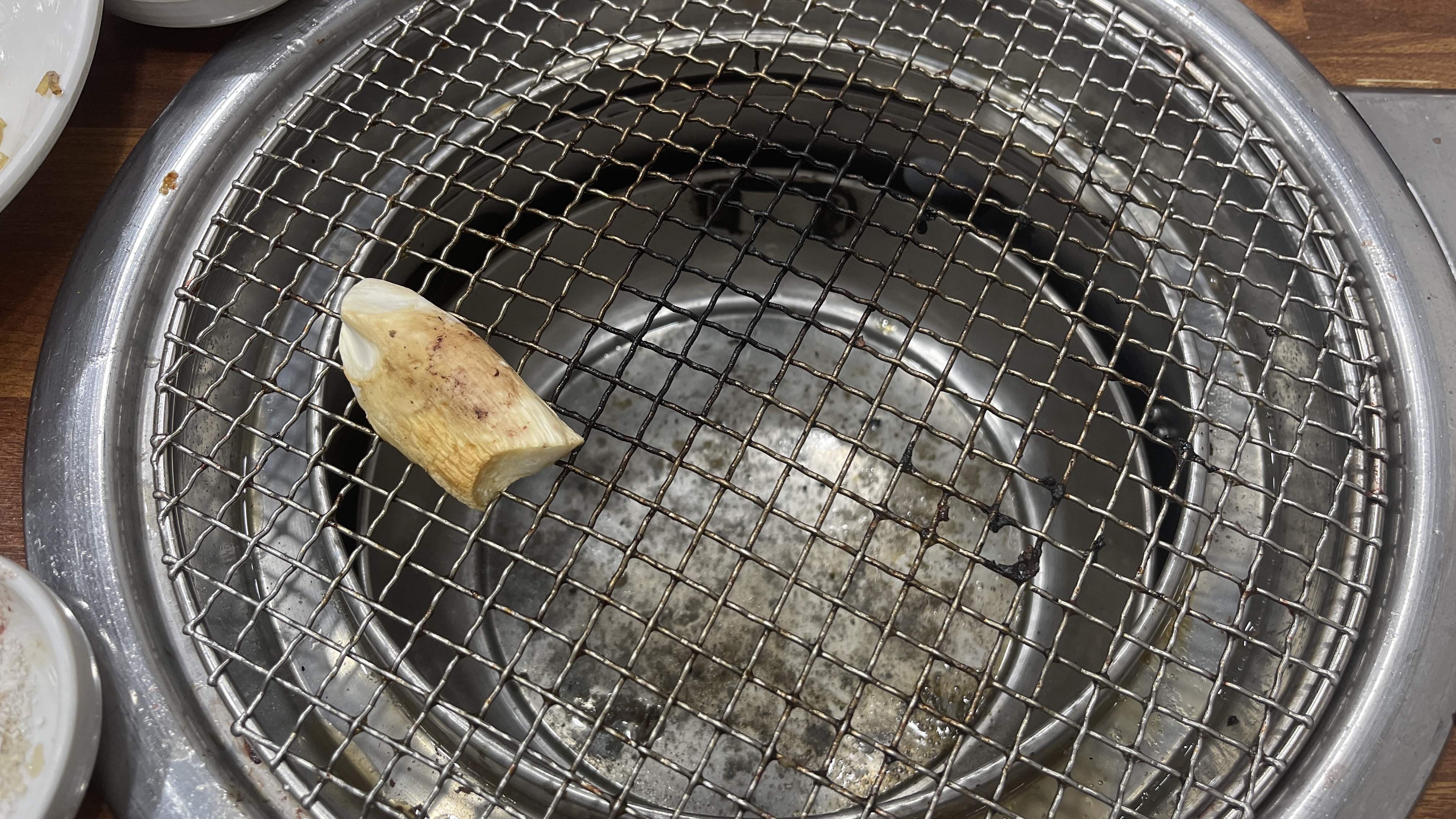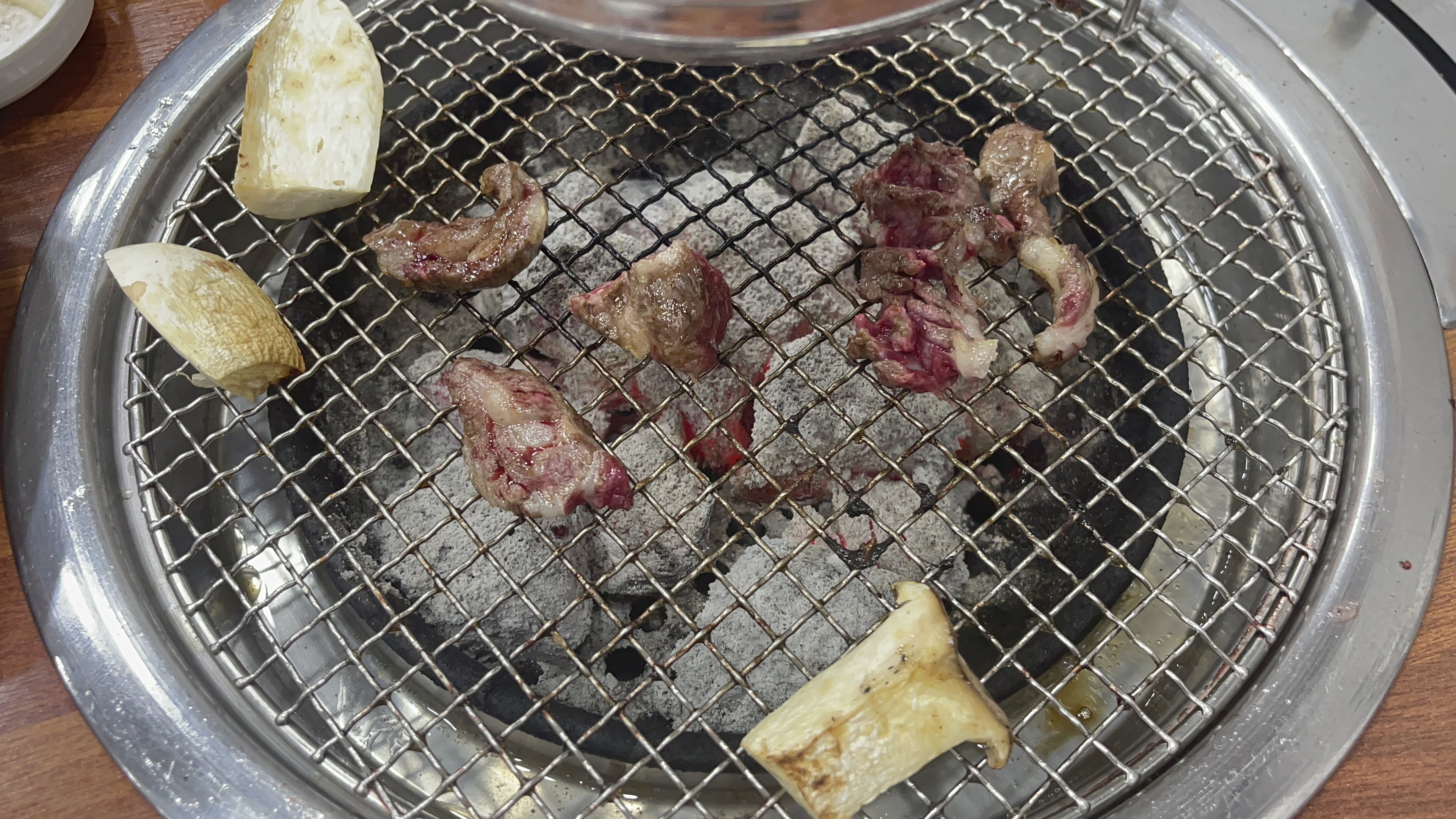 구워진 고기를 옆으로 치우고 마지막 남은 한덩어리를 화로 위에 올려놓았다.