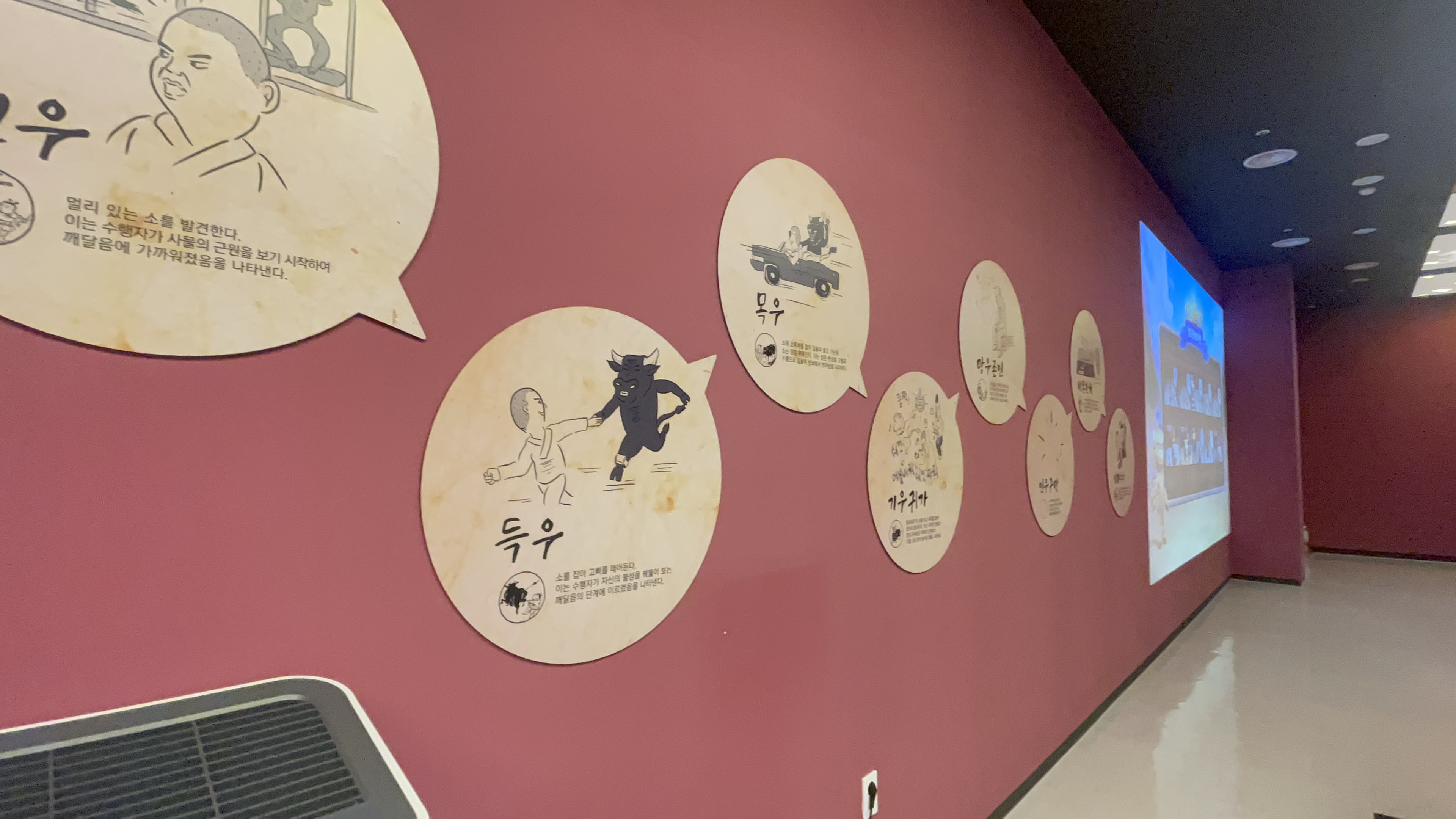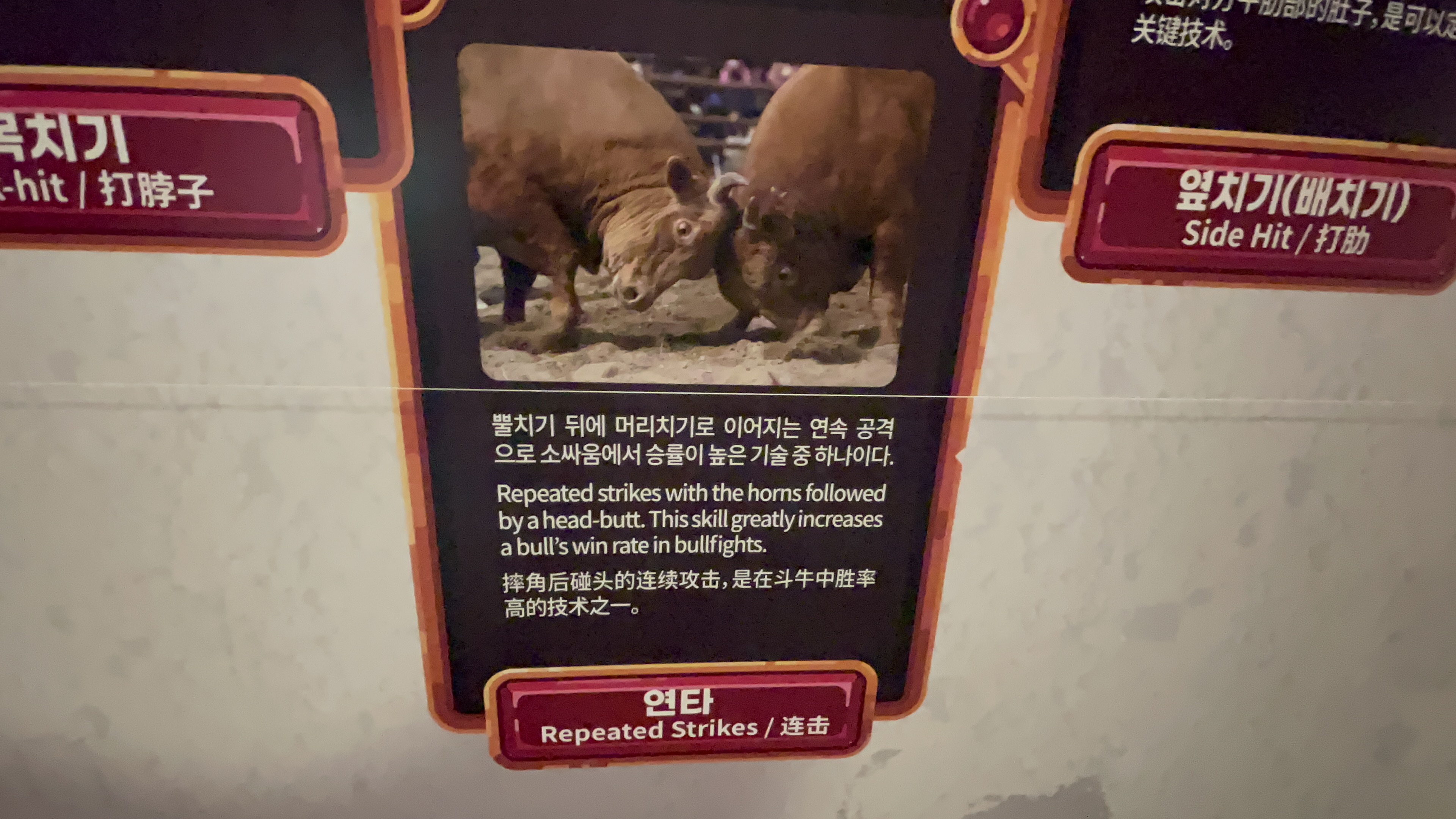 다음 공간으로 접어드니 소싸움이 한참인 영상이 흘러나온다. 마치 소싸움 경기장에 있는 것 마냥 장내 아나운서의 실감나는 경기중계도 흘러나온다.