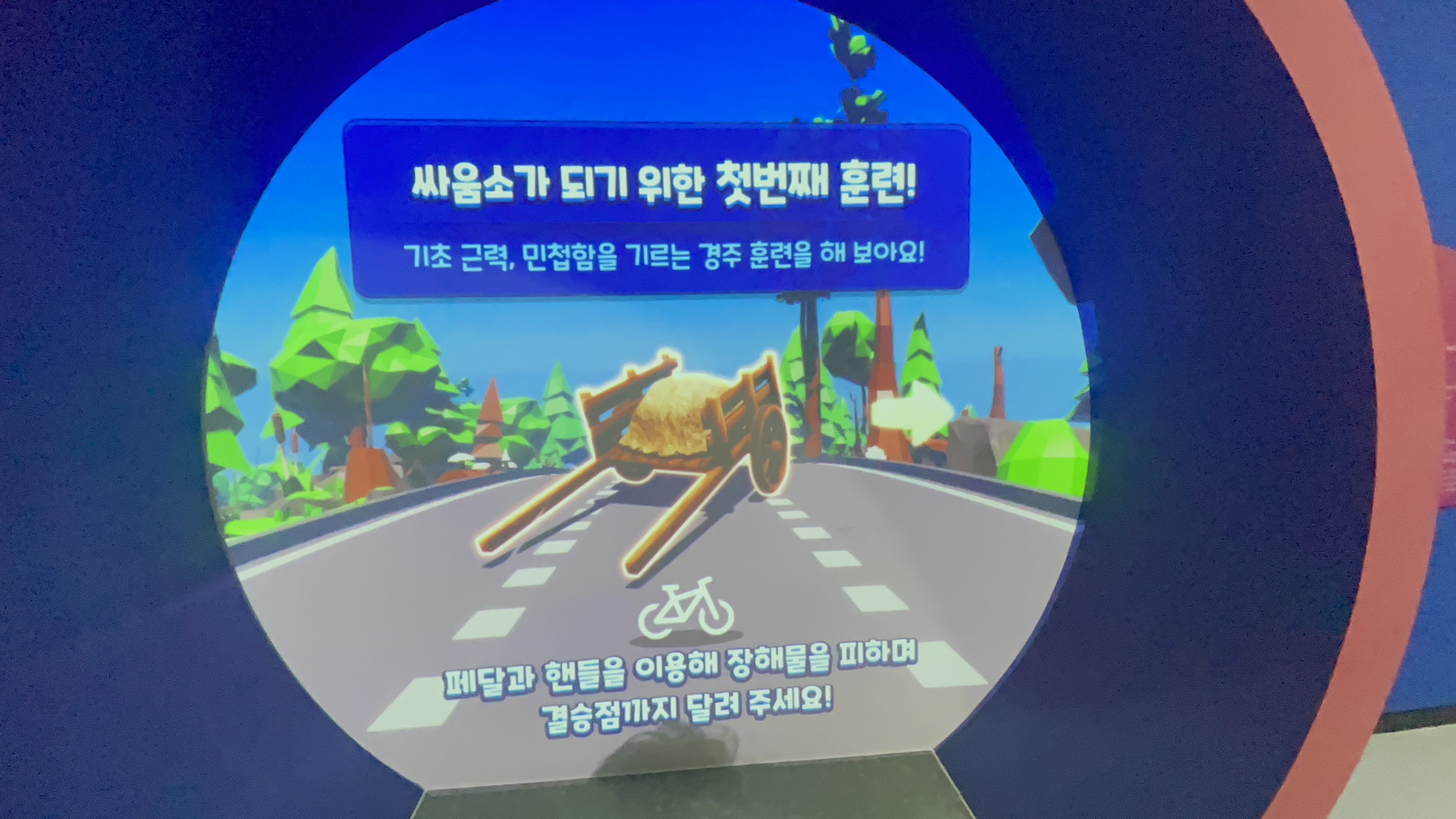 청도 아이와 가볼만한 곳을 아직도 찾고 있다면, 무조건 소싸움미디어체험관이다! 2층엔 아이들이 놀만한 거리가 너무 많다. 소모양을 한 자전거 페달을 밟으며 요리조리 장애물을 피해가는 이 게임! 재미지다.