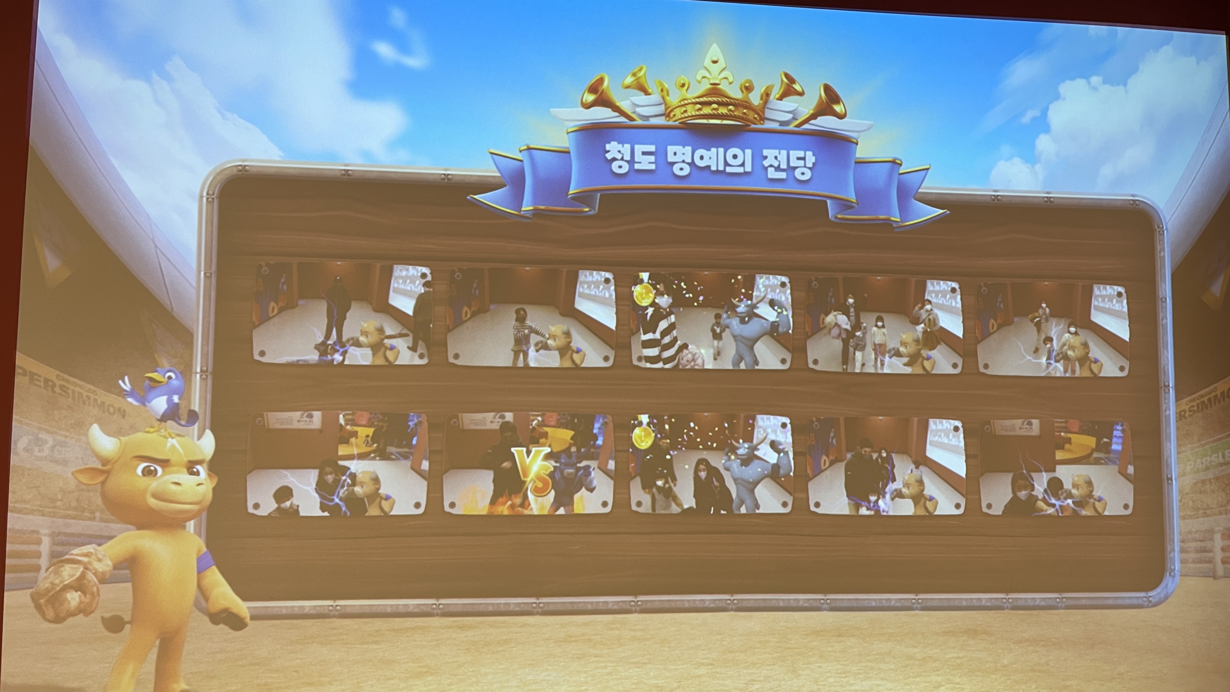 아이들이 아주 신기해할만한 청도관련 로고들이 천장에서부터 바닥으로 쏘아져 내려오며 수시로 바뀌고 있었다. 소싸움의 고장! 청도반시의 고장! 새마을운동의 고장!