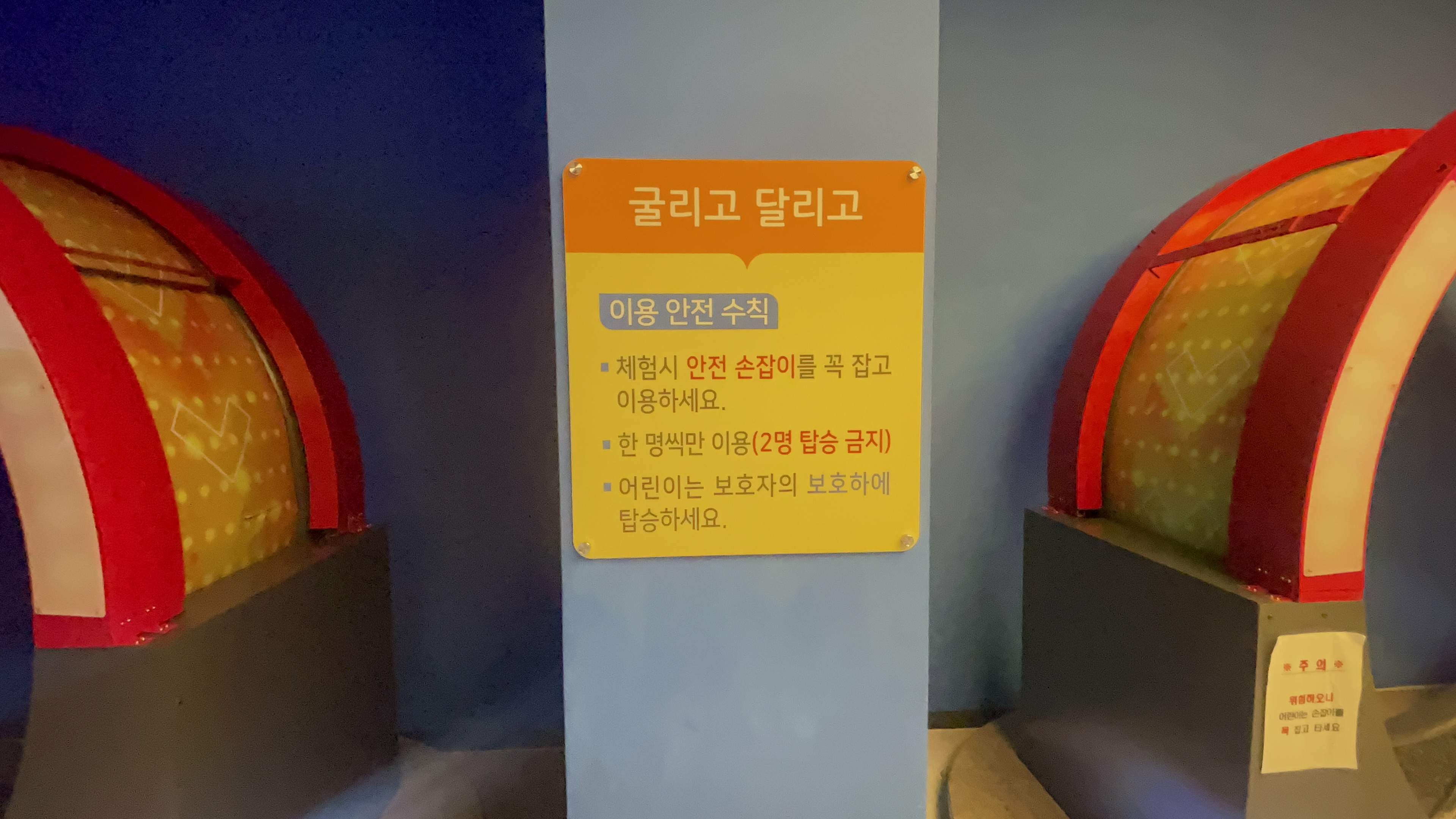 굴리고달리고. 마치 다람쥐쳇바퀴마냥 원통 안에 사람이 들어가서 걷거나 달리기 시작하면 원통이 회전하는 놀이기구이다. 안전을 위해서 손잡이는 반드시 잡고 있어야 하고, 1명만 탑승해야 한다. 직접해보니, 상당히 회전이 빨라서 어른도 넘어질 수 있으니 조심하며 탑승해야 할 것 같다.
