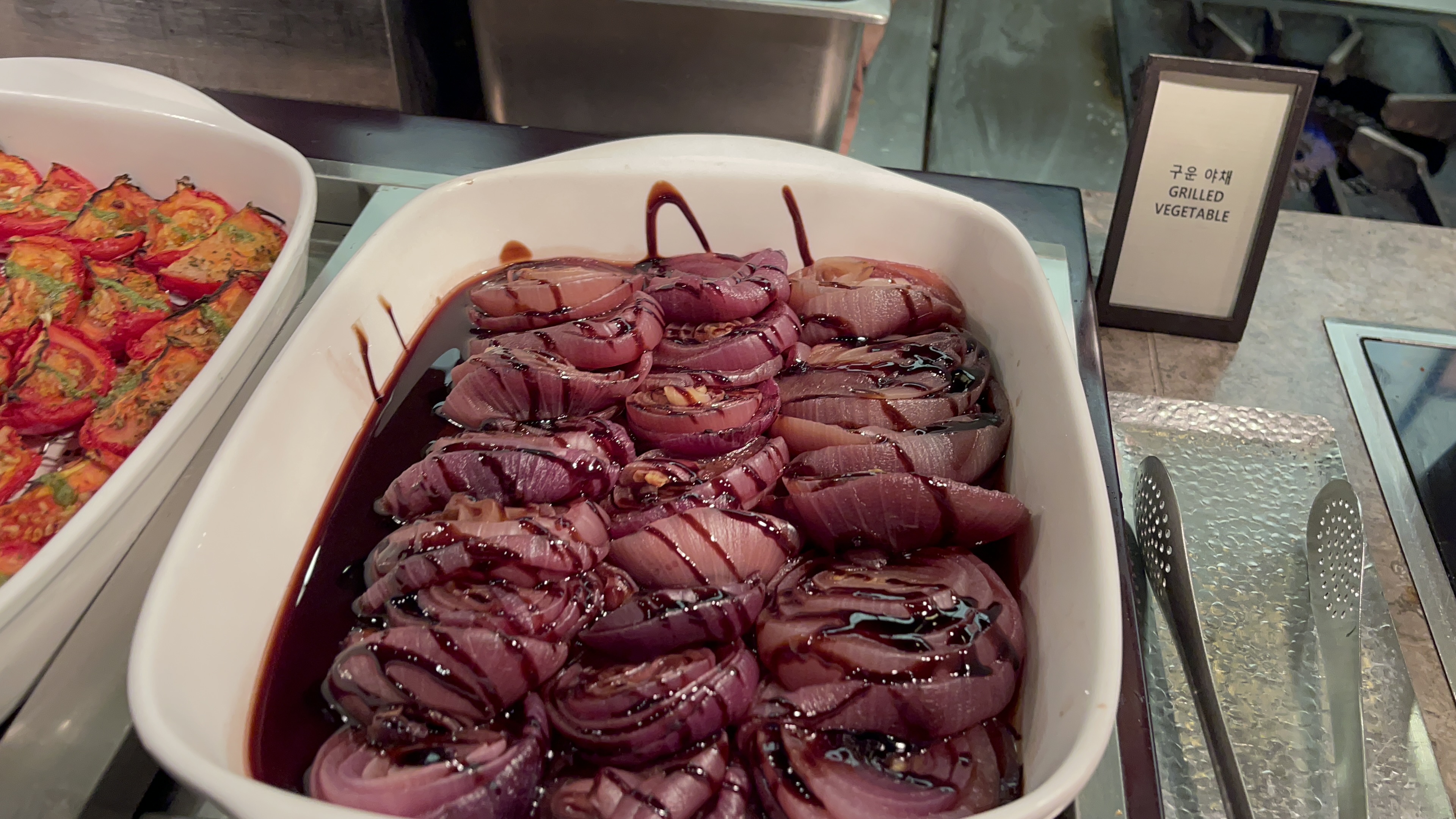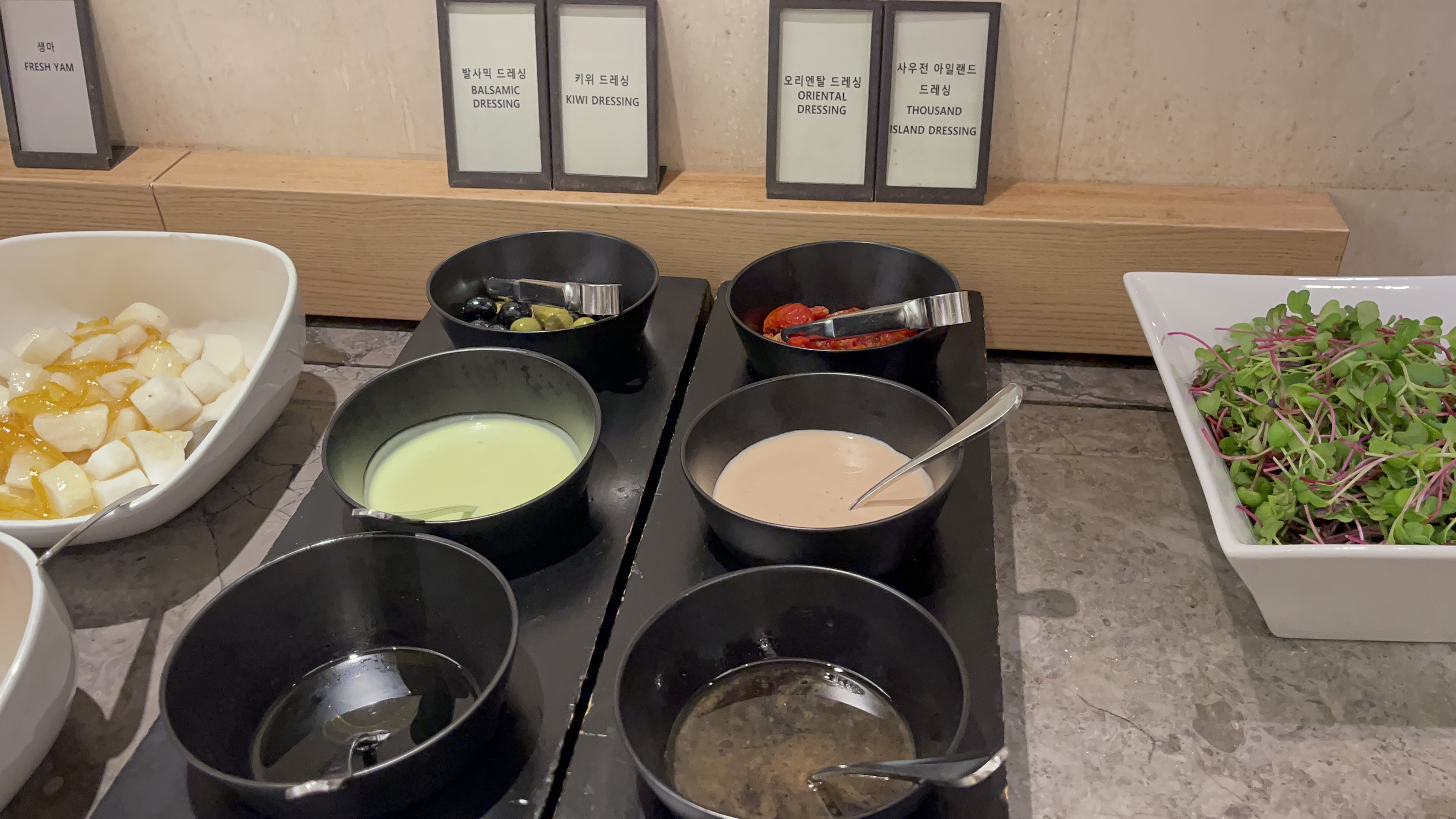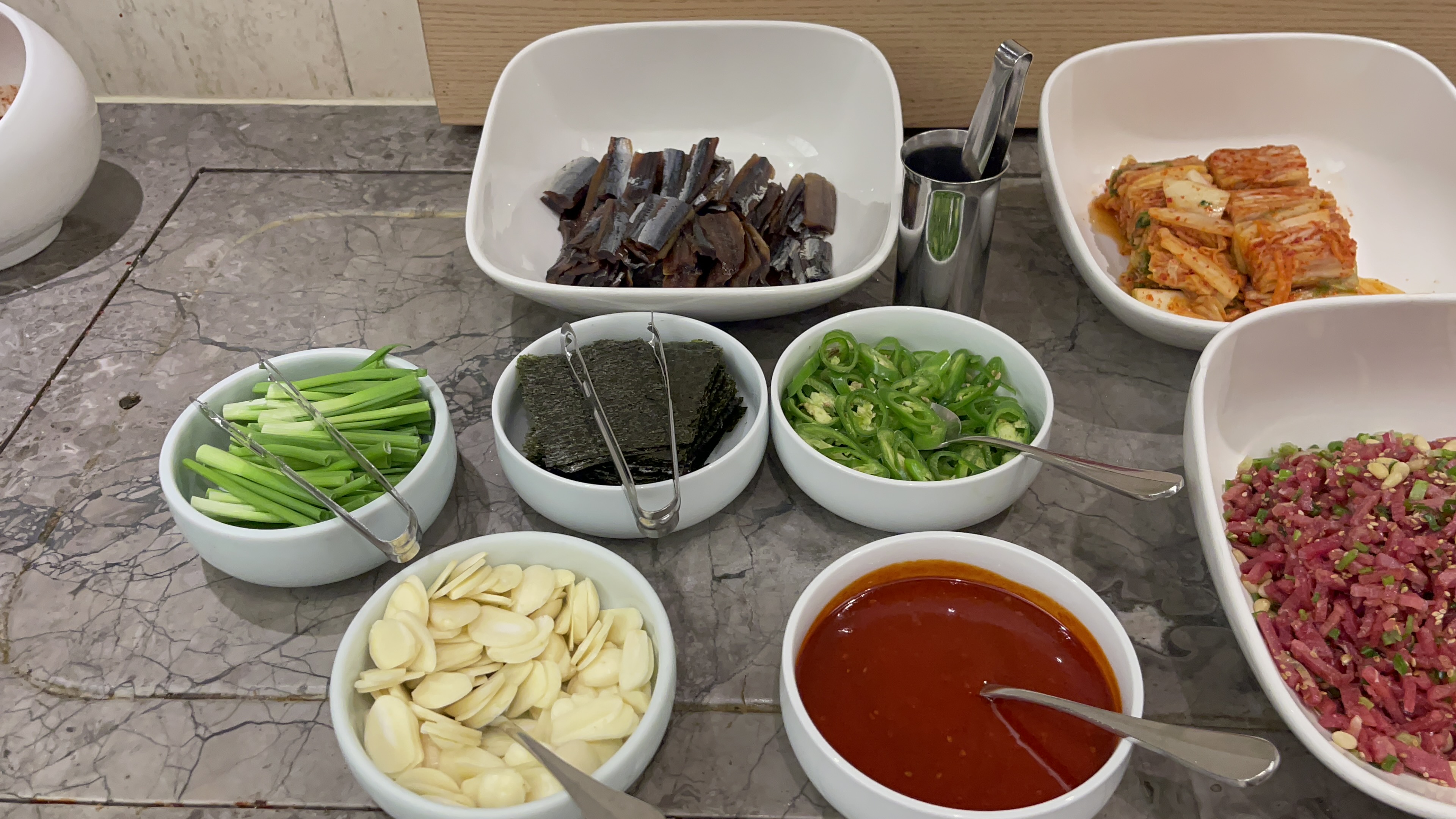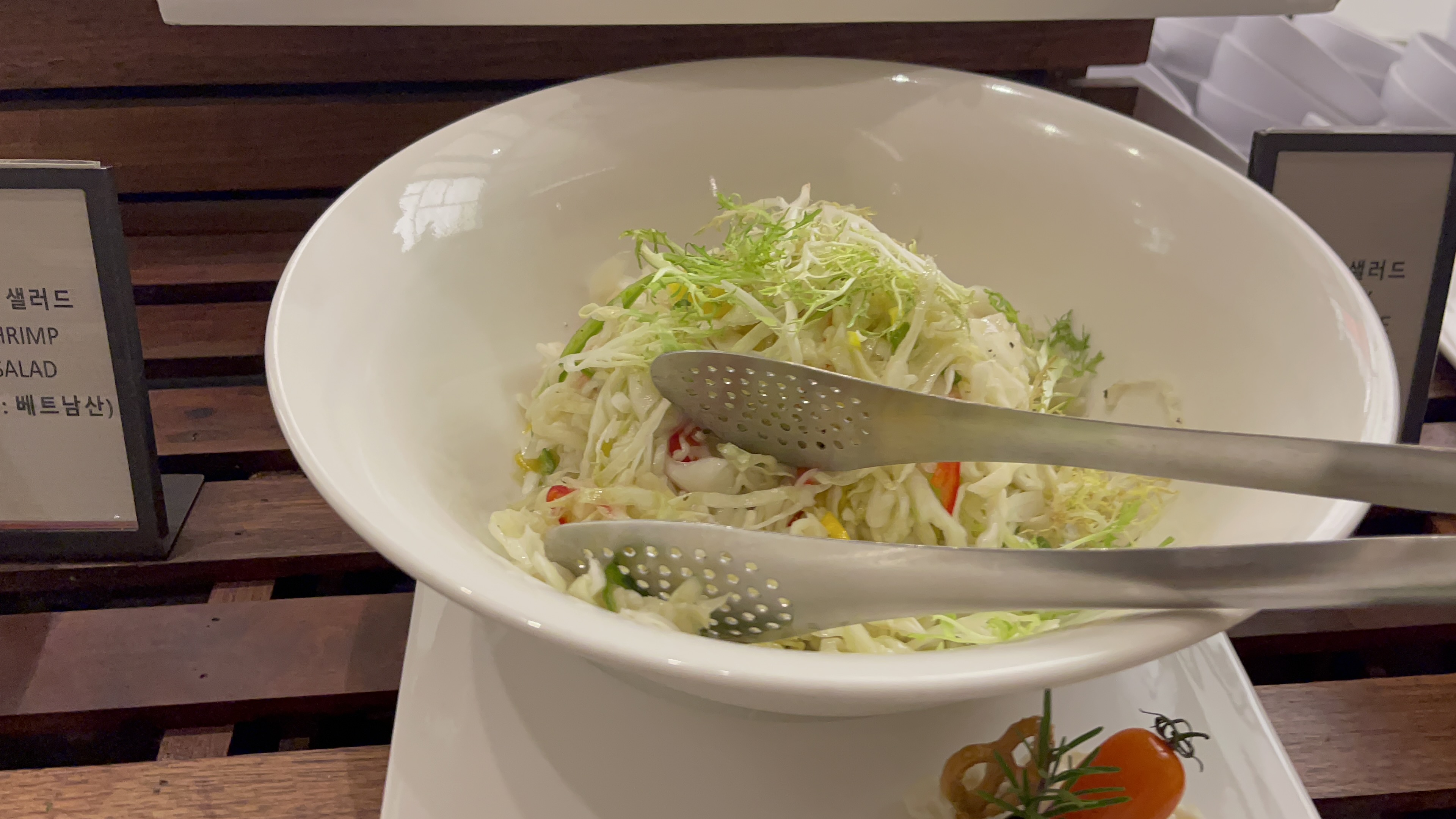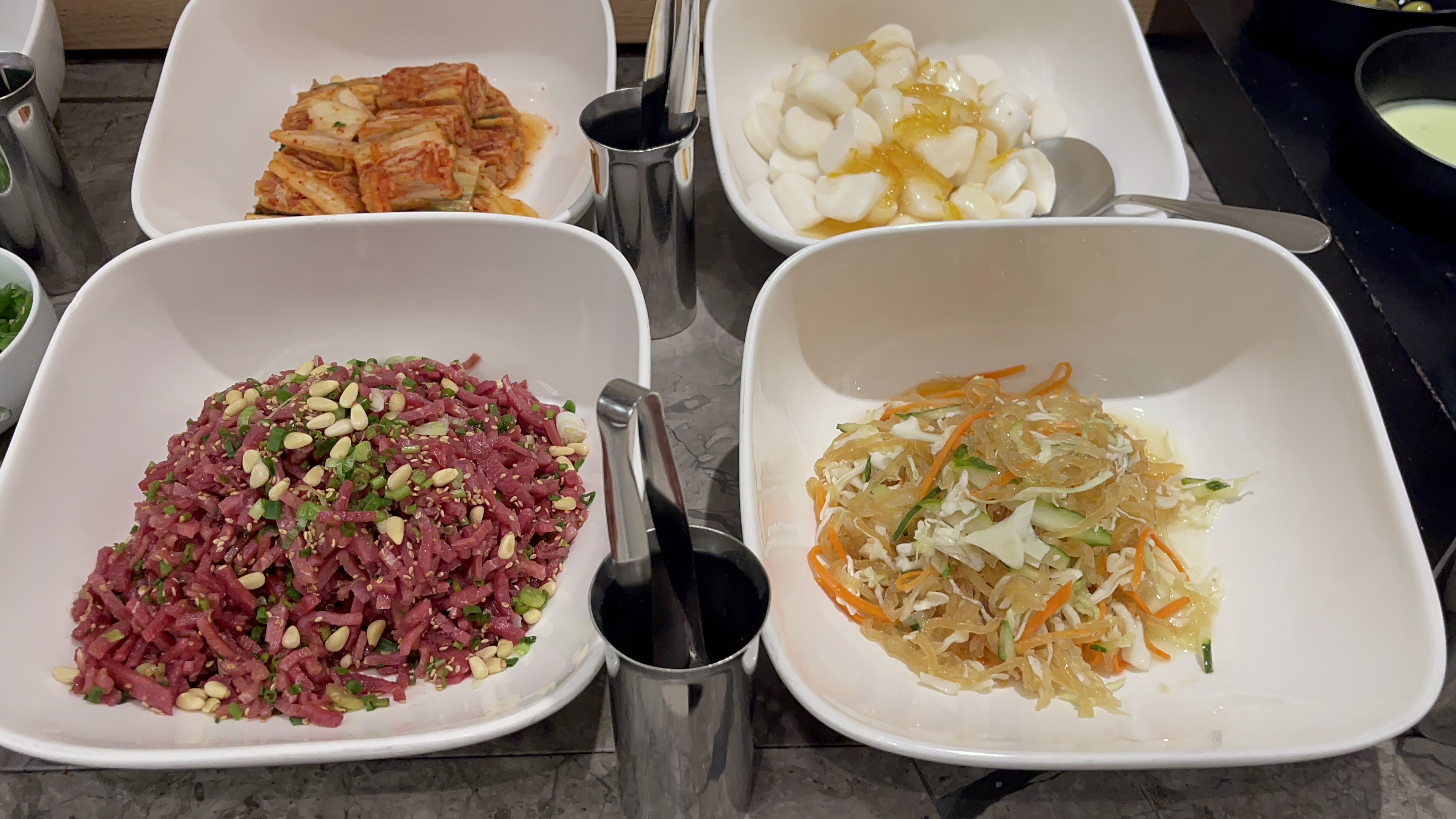 한식코너엔 김치와 마 샐러드. 육회와 해파리냉채가 있는데, 건강을 위해서 마 샐러드는 한번 정도 먹어주면 좋을 것 같고, 육회는 계속 퍼담아 먹어도 좋을 맛인데.. 오늘은 약간 짭쪼름함이 강했다.