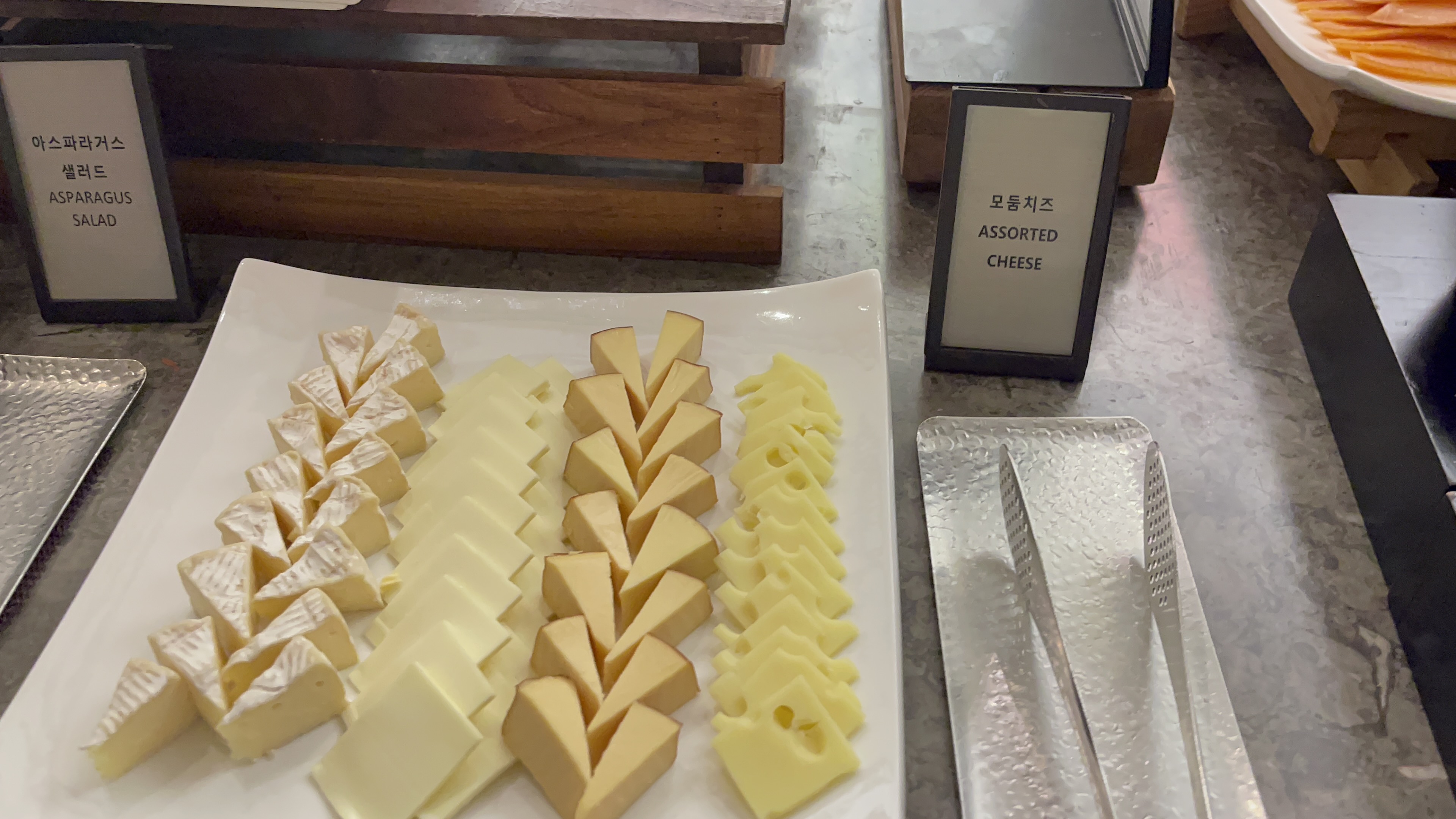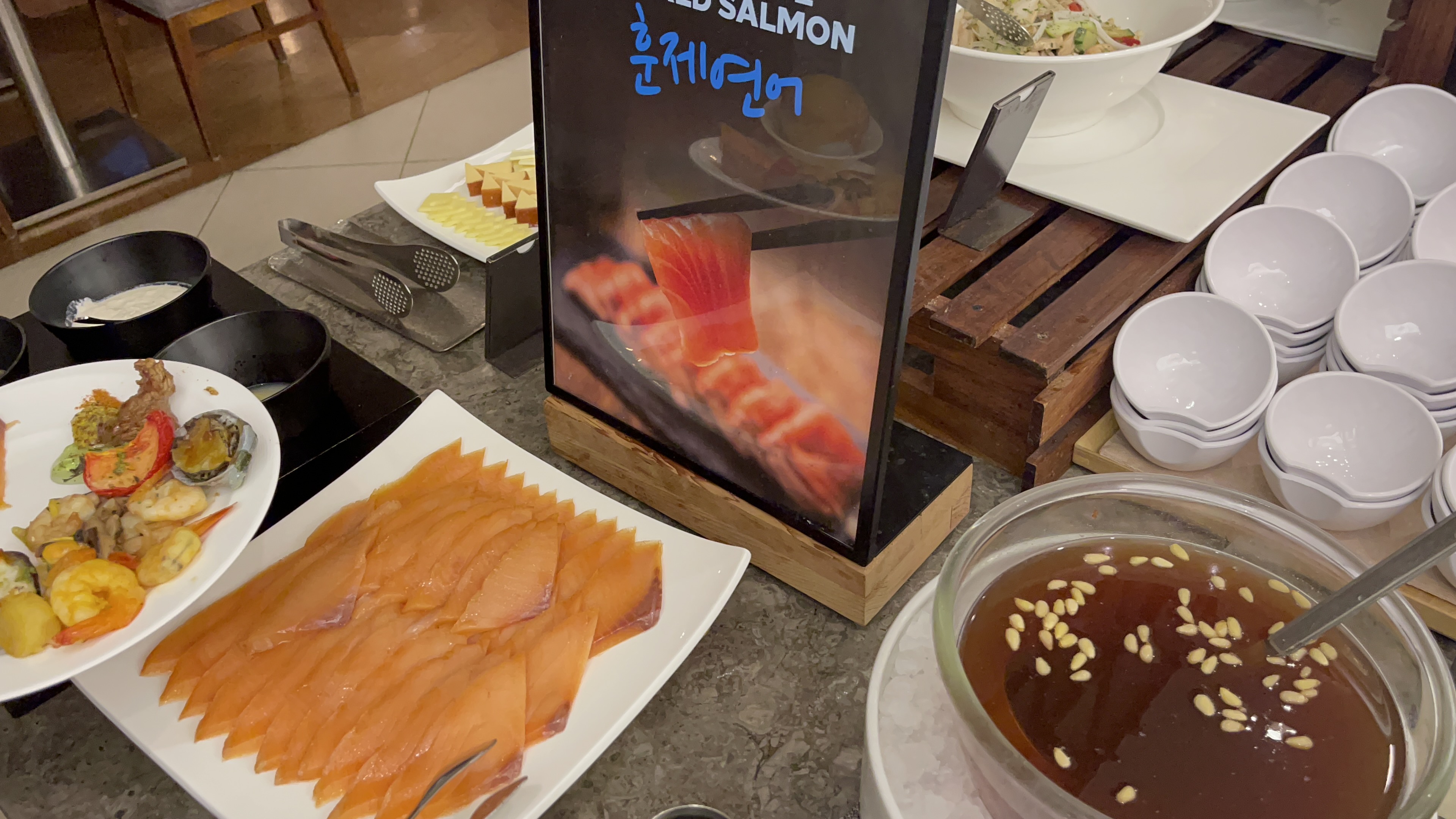 모듬치즈와 훈제연어. 치즈는 좋아하는 종류가 있어서 좋긴 한데, 훈제연어는 생각보다 별로였다는 지인들의 얘기에 먹어보지 않고, 회코너에 준비되어 있는 연어만 먹었다.