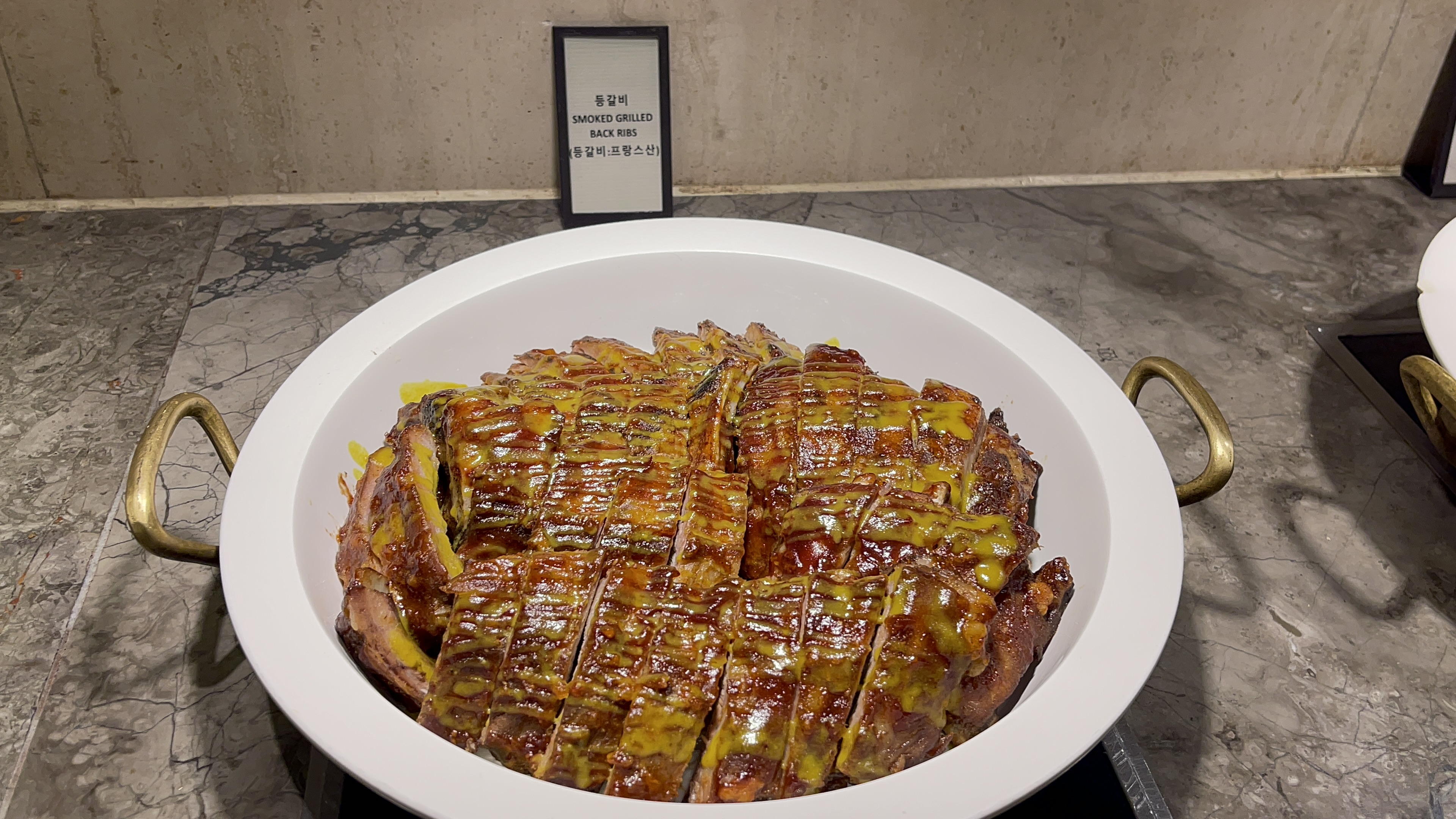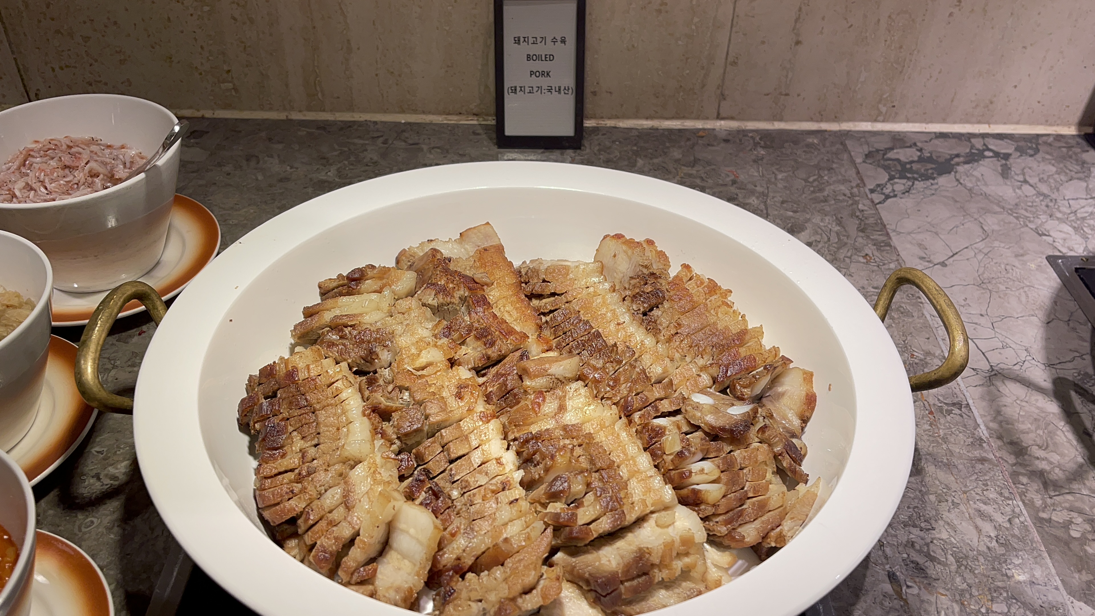 삼겹살구이. 호텔뷔페에선 약간 생소한 음식이긴 한데, 얇은 삼겹살을 한동안 갈구했던 나로서는 참 반가운 음식이다. 쌈장과 곁들이면 아주 좋은 맛. 다른 음식들을 고려하지 않는다면 여러번 퍼다 먹고 싶었다.