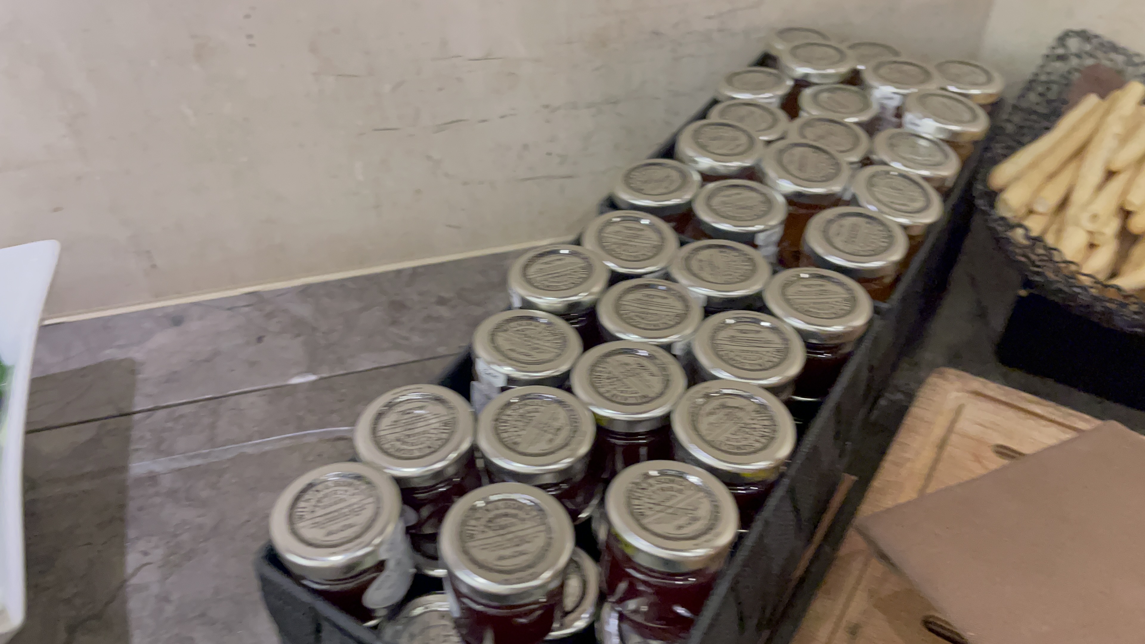 몇가지 민짜 맛의 빵들과 잼류가 준비되어 있다.