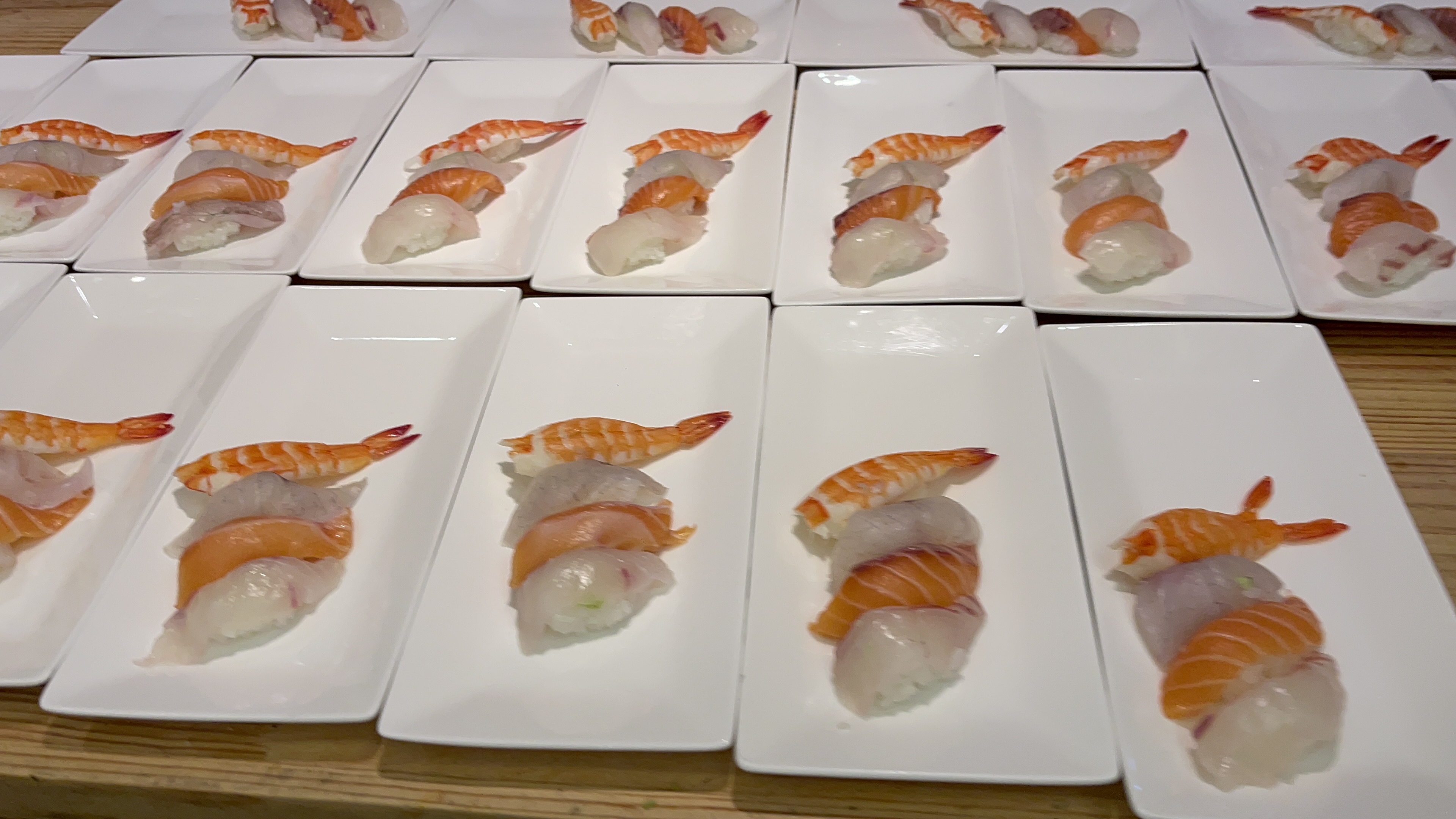 초밥코너. 놓여져 있는 것으로 가져가도 되지만, 원하는 부위로 요청을 해도 담아주시는 것 같았다. 밥량이 적당해서 먹을만하다. 연어, 광어, 농어, 새우 4가지 종류로 준비된다.