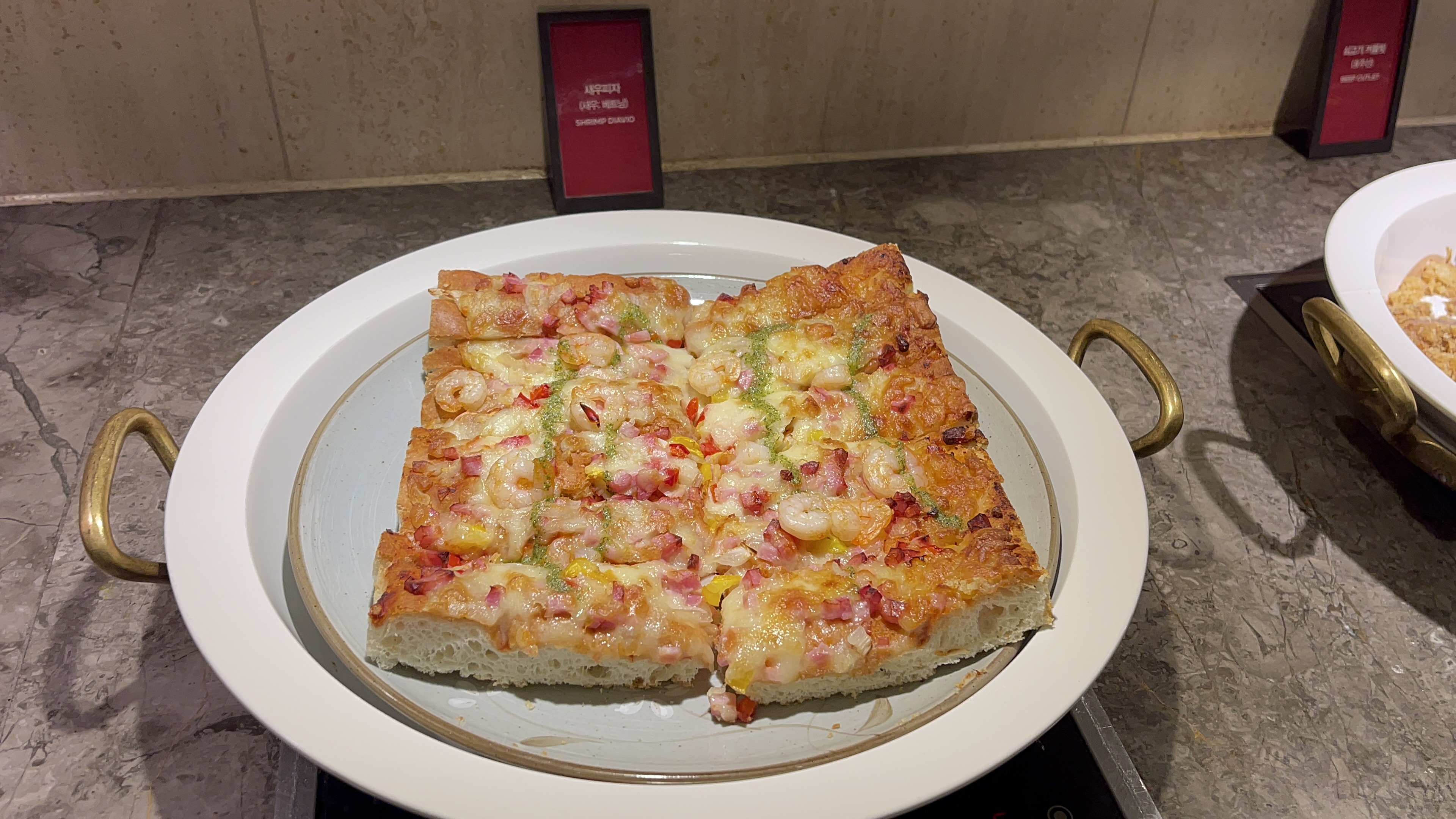 새우피자. 두툼한 미국식 피자스타일인데 두꺼운 것 치고는 부드러운 도우식감과 새우토핑이 아주 잘 어울러져 맛있다. 여러번 퍼먹고 싶지만 금방 배가 들어찰 것 같아 약간 자제해야 되는 음식.