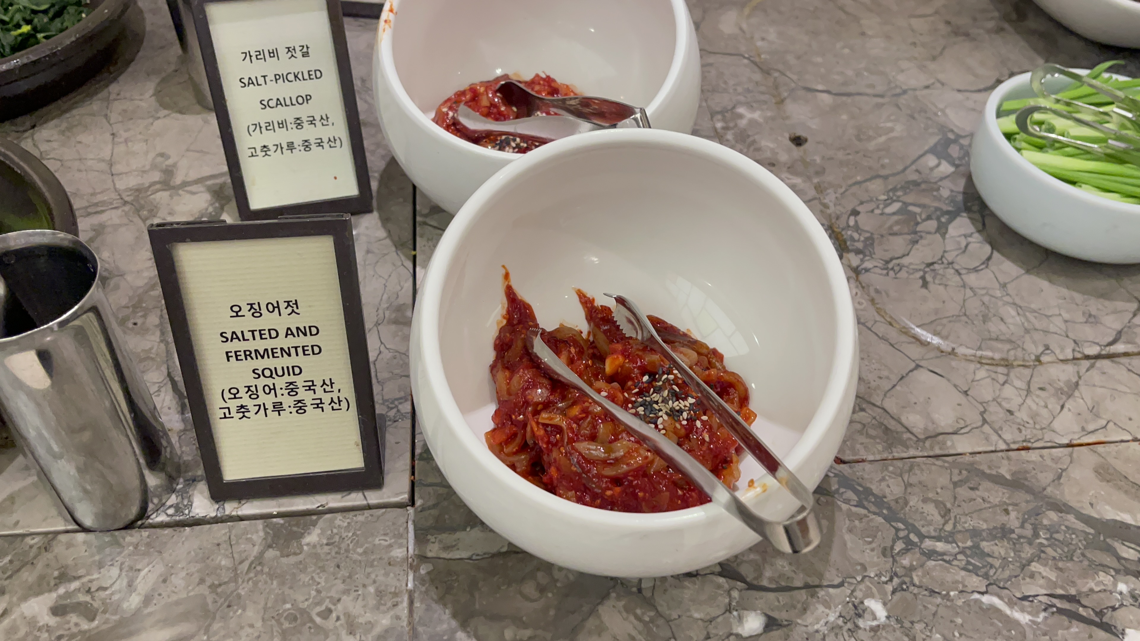 어리굴젓과 가리비젓갈, 오징어 젓갈도 준비되어 있다. 어리굴젓은 얼마전 광주출장 때 아주 맛있게 먹었던 추어탕 집의 그 맛처럼 맛깔낫다. 젓갈류들은 전체적으로 보통이상은 하는 맛. 뜨거운 밥 한큰술 떠서 얹어먹으면 꿀맛!