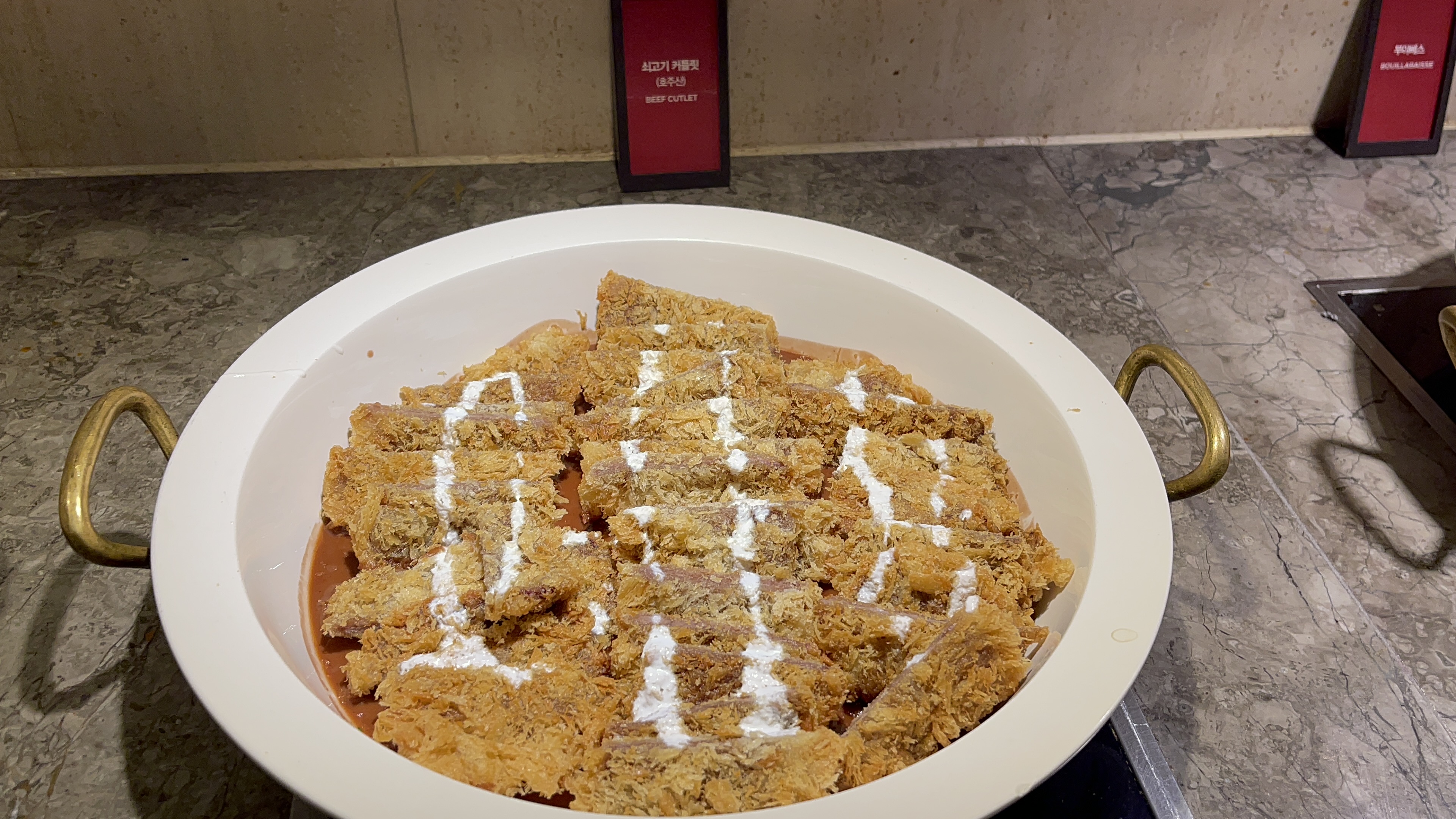 부야베스를 비롯해 중식류와 소고기커틀렛, 피자 등 무거운 음식들도 차례차례 퍼담아 날랐다. 너무 느끼한 음식들만 골라 담아왔네.