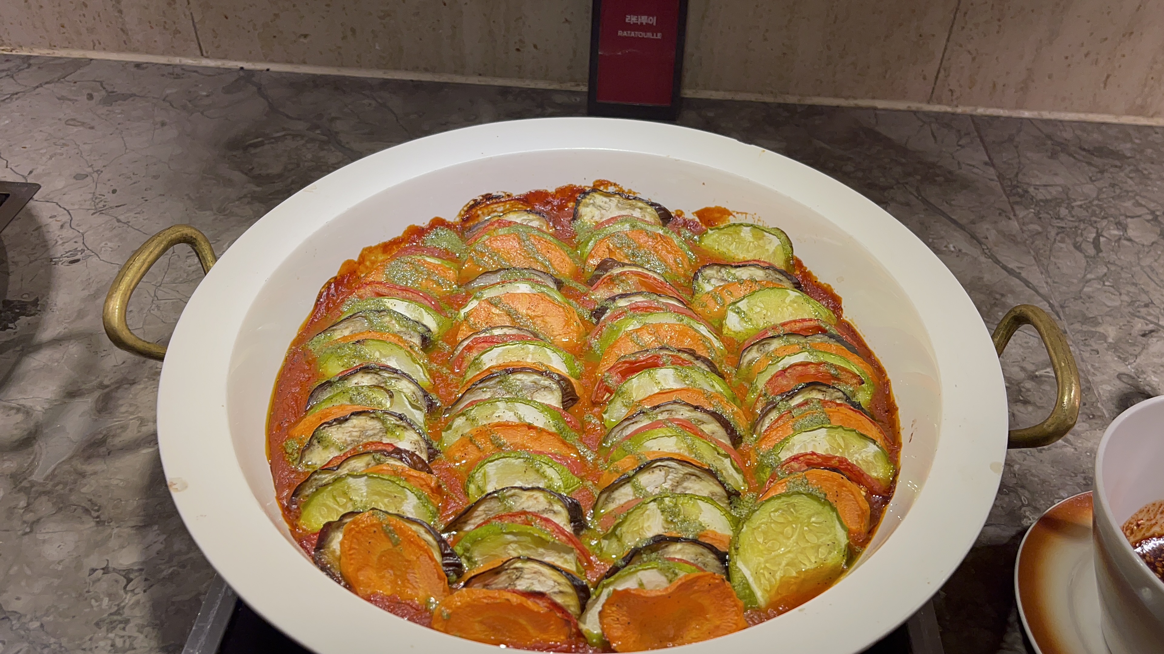 부야베스. 약간 색다른 음식이었던 것 같은데, 포스팅을 하는 오늘에서야 알게되었다. 랍스터가 올려져 있었다는 사실을!!!! 사진찍는다고 찍고 이동, 찍고 이동했더니만 세상에.. 저걸 놓치다니.. 제일 빨리 음식 앞에 있었음에도 불구하고 놓쳐버렸다.. 아오.. 아까워! 재료들이 아주 호화롭다.
