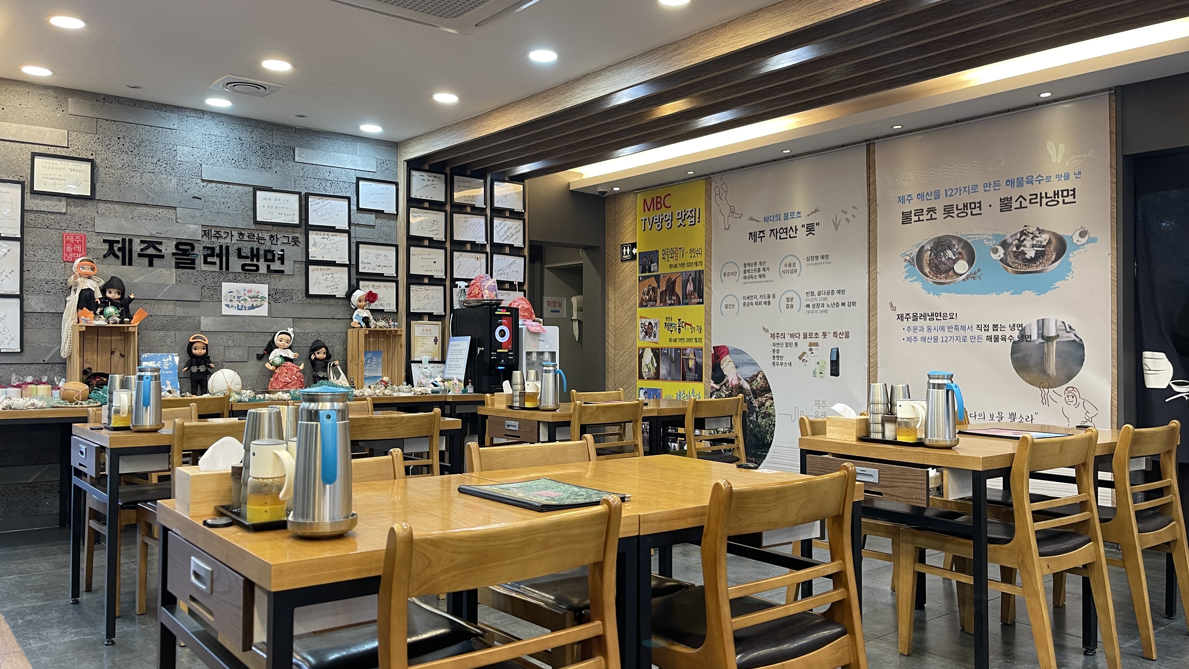 확실히 비수기인데다 눈까지 내린 탓에 관광객으로 가득차 있던 식당 내부는 한산해 보인다. 제주 특유의 톳냉면, 뿔소라 냉면에 대한 소개와 해녀관련 인형들 장식이 이채롭다. 제주맛집이지만 도민보다는 주로 관광객들에게 많이 알려진 곳이다. 오늘도 제주냉면을 맛보러 온 관광객들 일부가 자리를 잡고 식사중이다.