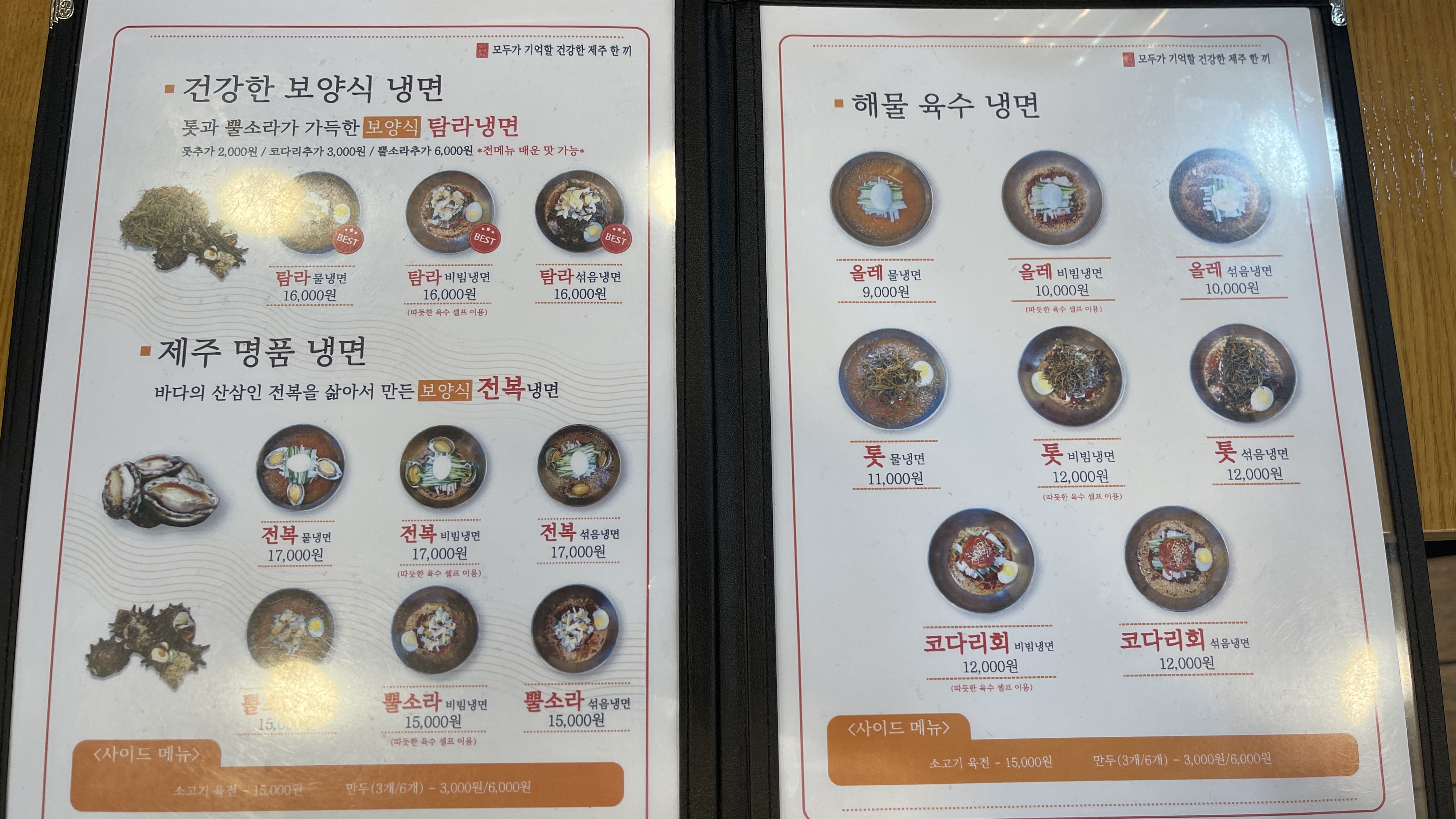 제주올레냉면 메뉴판. 제주올레면옥이었다가 냉면으로 이름이 바뀌었던데, 메뉴판은 아직 올레면옥으로 표기되어 있다. 뭐가 맞는 것인지 아직도 알쏭달쏭..