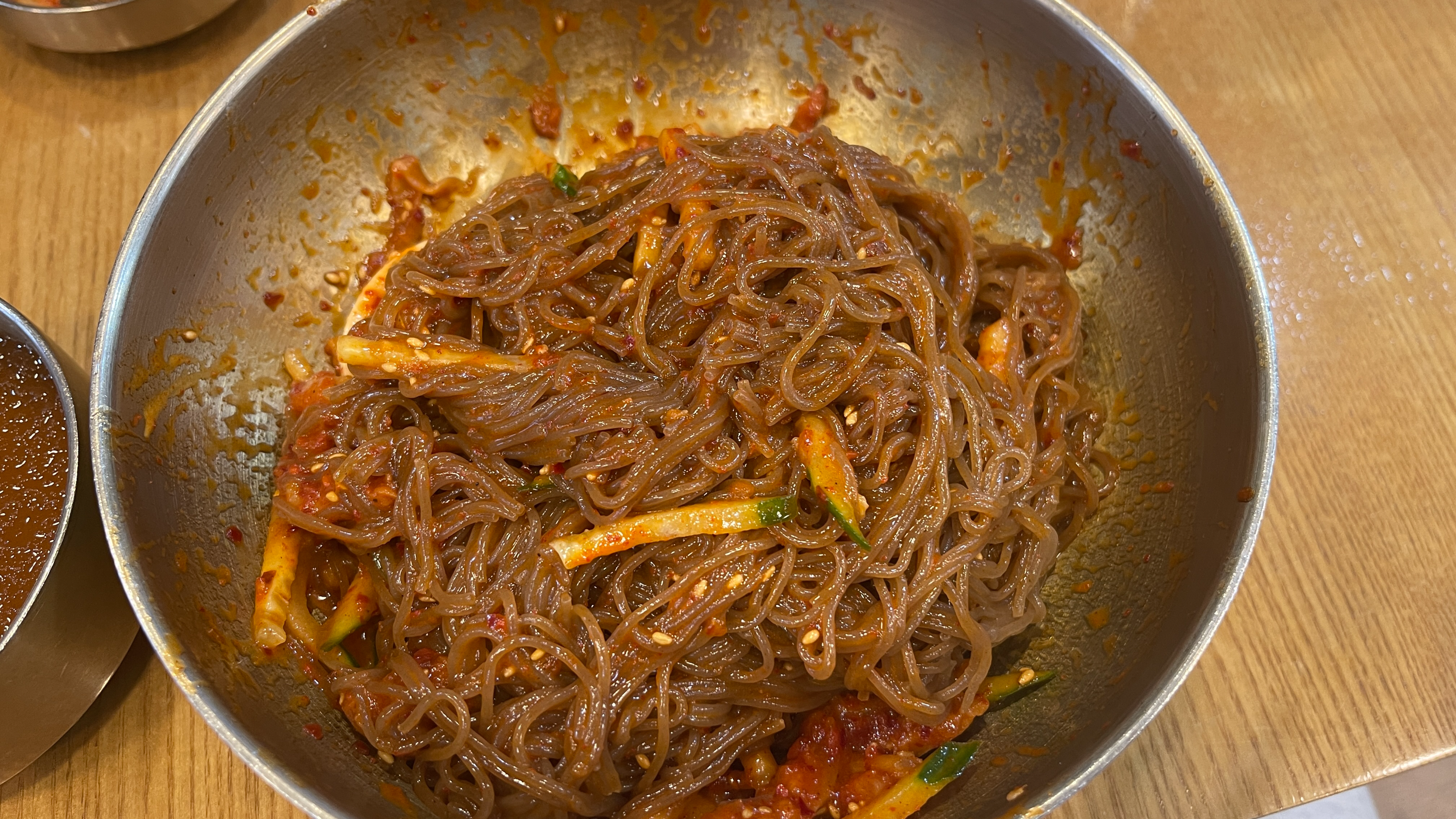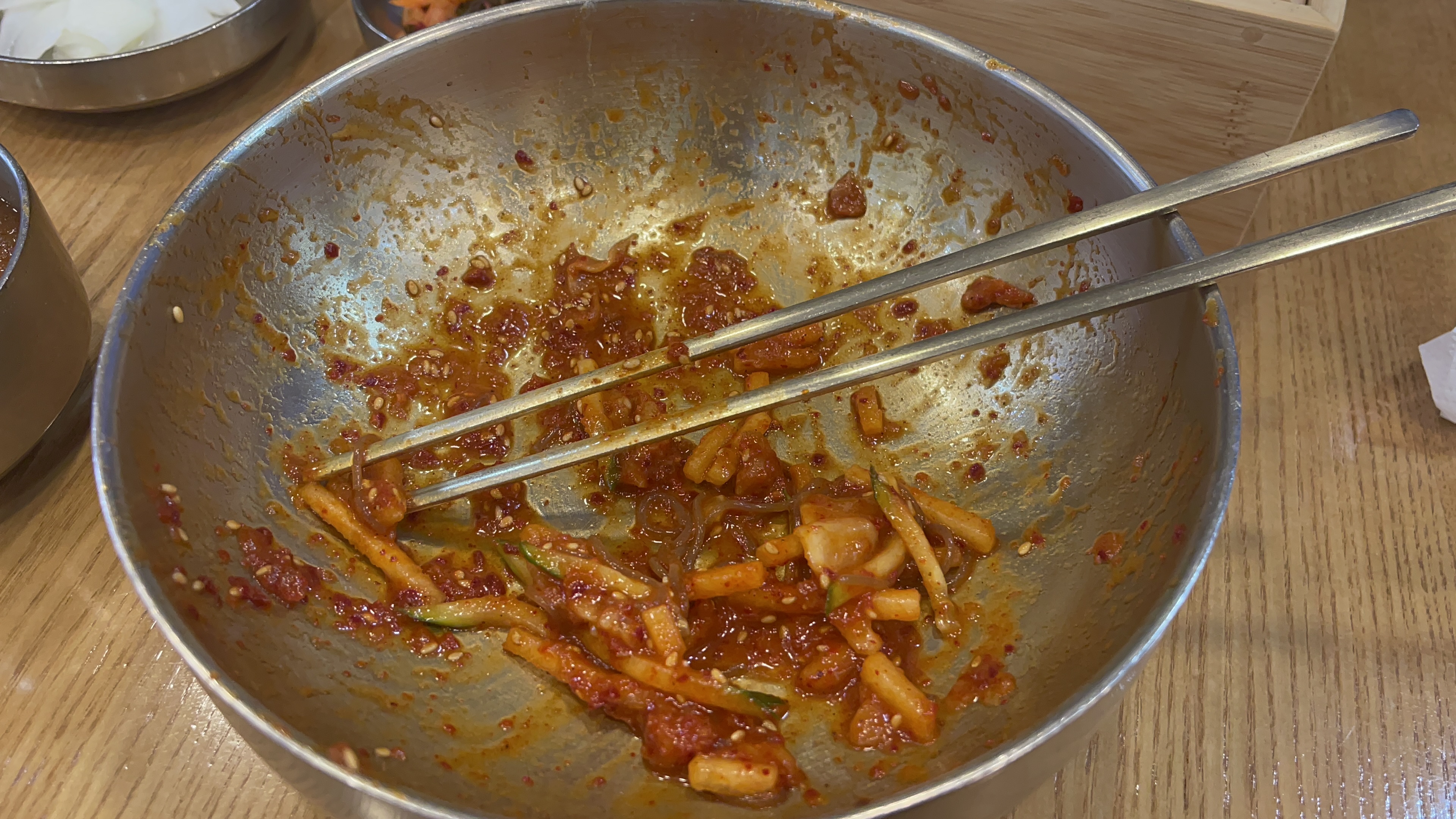 생각보다 너무 괜찮아서였을까? 아니면 배가 많이 고팠던 것일까? 두세번 밖에 안 먹었던 것 같은데 비빔냉면이 사라졌다. 남는 것은 코다리회와 고명으로 얹어진 오이와 배뿐... 어디갔니? 곱배기 냉면아~