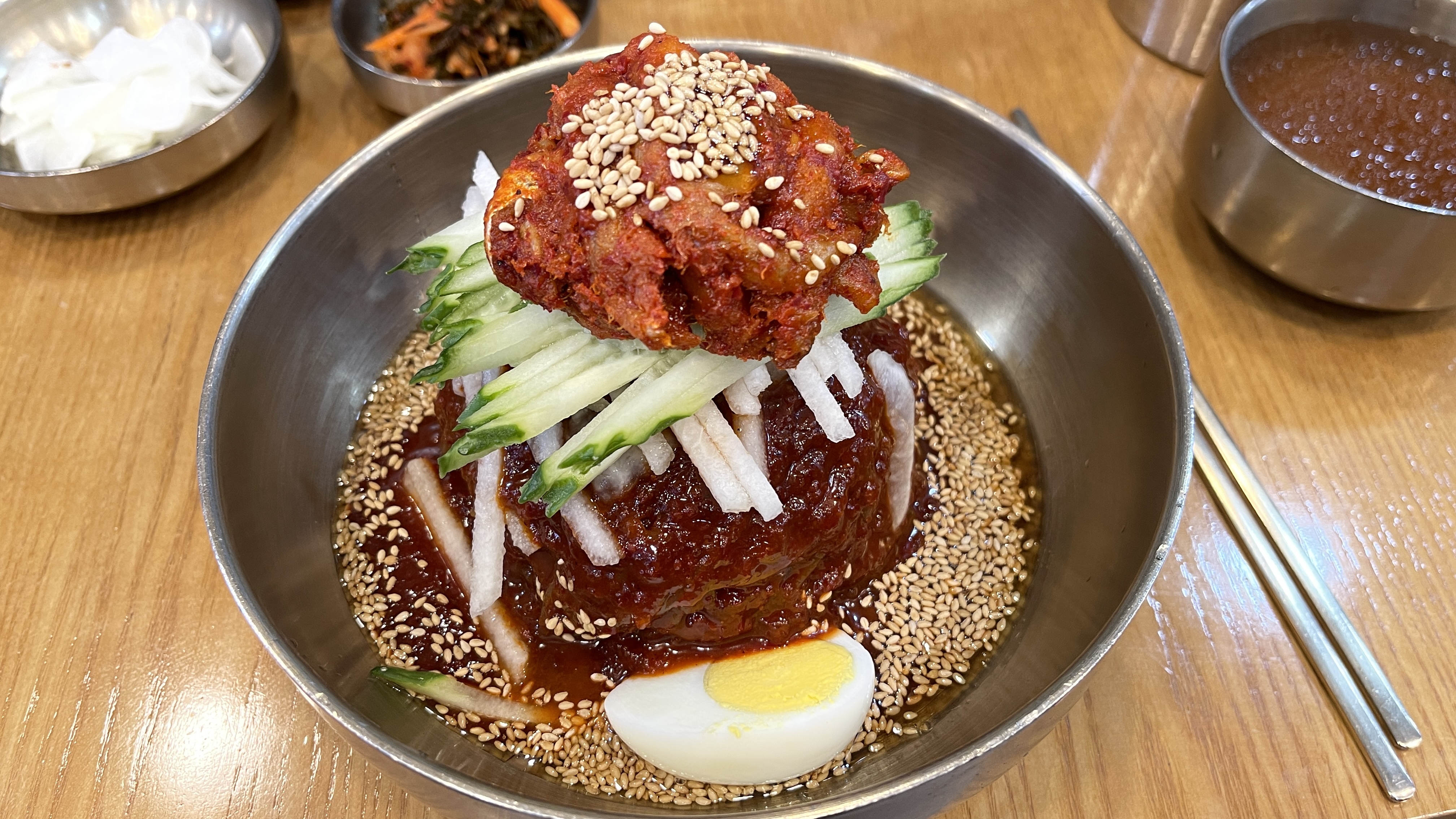 코다리회비빔냉면(곱배기)과 살얼음 육수가 나왔다. 비빔냉면 위에 배와 오이 고명이 올려져 있고, 그 위에 코다리회무침이 올려져 있다. 속초의 명태회냉면 비쥬얼과는 약간 차이가 있다. 모양자체가 아래의 냉면 양념보다 약간 건조한 느낌이어서 과연 속초의 그 맛이 날까 싶긴 했다. 제주에서 속초의 맛을 찾는 내가 어리석은걸까..