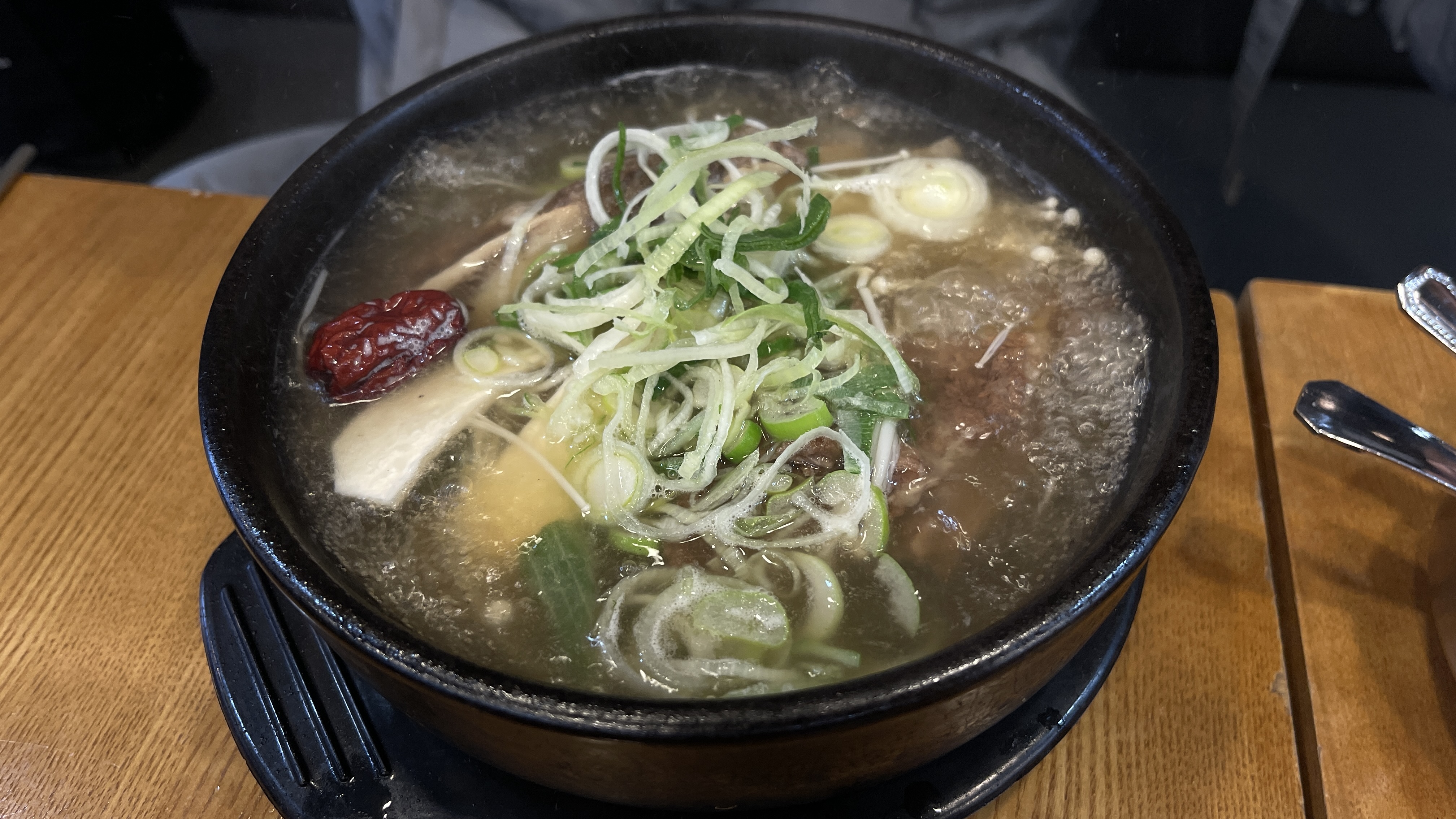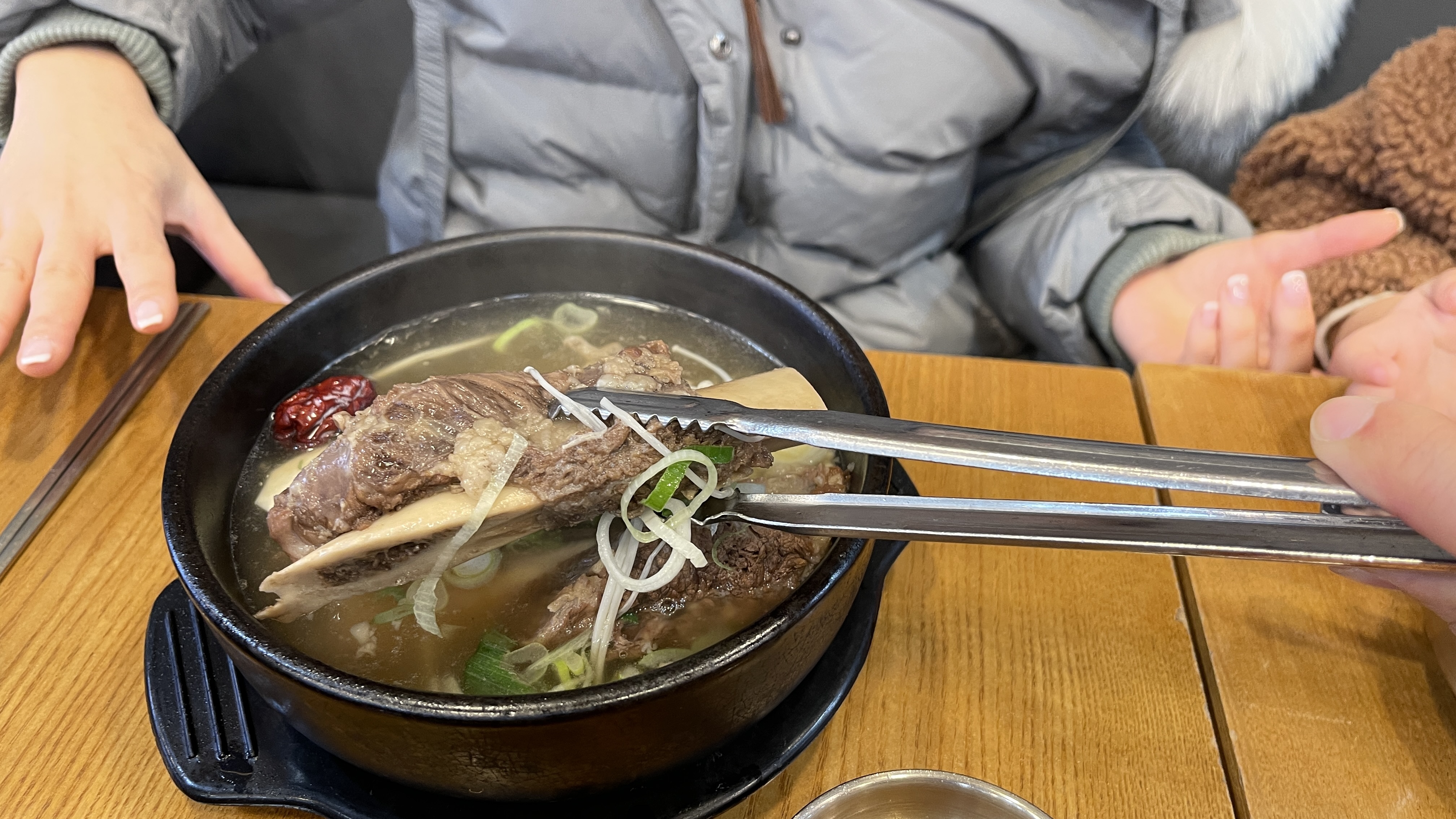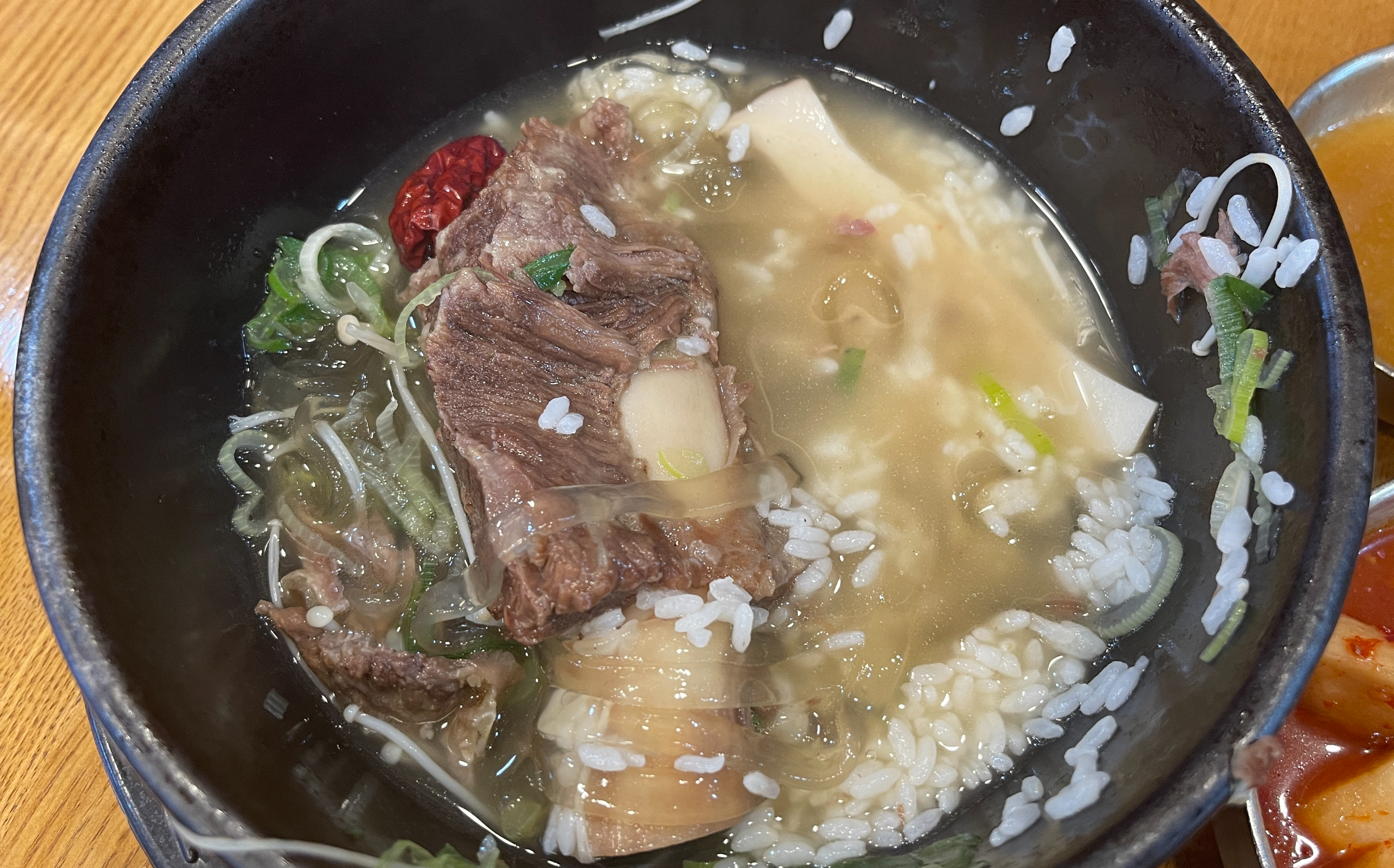 보글보글 끓여나온 갈비탕. 전에는 큰 갈빗대가 뚝배기 밖으로 튀어나올 정도로 큼직했는데, 이제는 육수 속에 파묻혀 있다. 하긴 뼈대만 큰 갈빗대여서 모양만 그럴싸해보여서 실속을 챙기는 방향으로 바꾸었을 수도 있겠다.