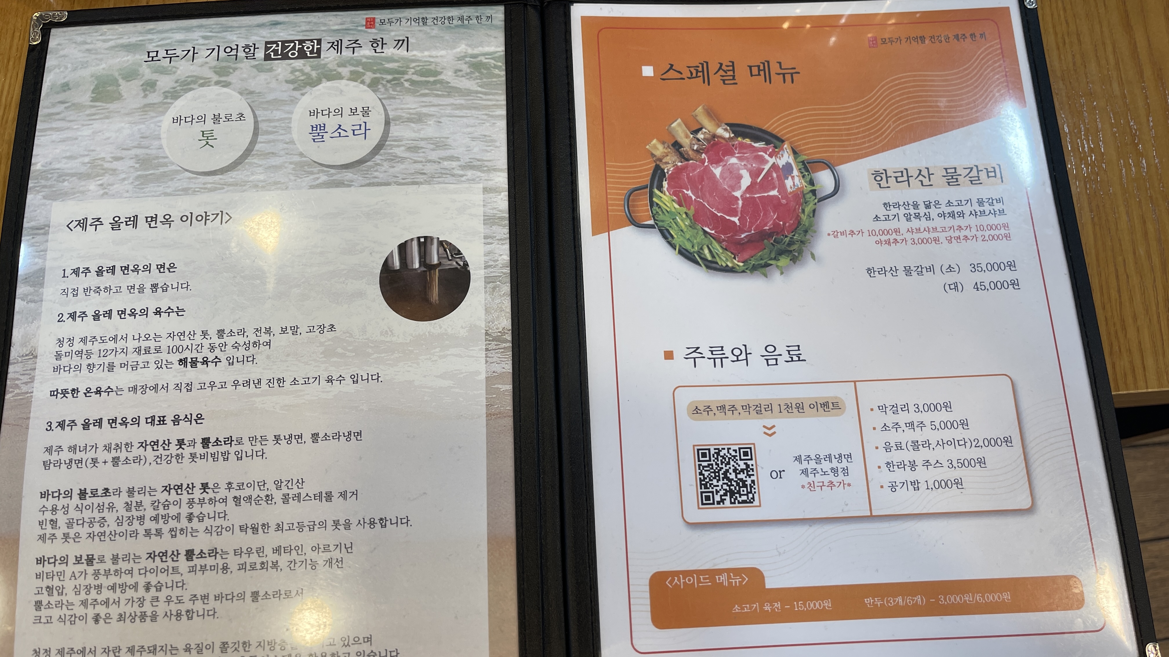 바다의 불로초 톳, 바다의 보물 뿔소라. 제주올레냉면의 면과 육수에 대한 이야기가 나온다. 처음 먹어보면 늘 먹던 맛과는 달라.. 뭐지?라며 의아해 할 수 있지만, 계속 먹다보면 마치 평양냉면처럼 그 독특한 맛에 매료되기도 한다. 톳냉면은 호불호가 갈릴 수 있긴 하지만, 다른 고명이 올라간 냉면으로 선택하면 해물육수맛의 제주냉면을 즐길 수 있다.