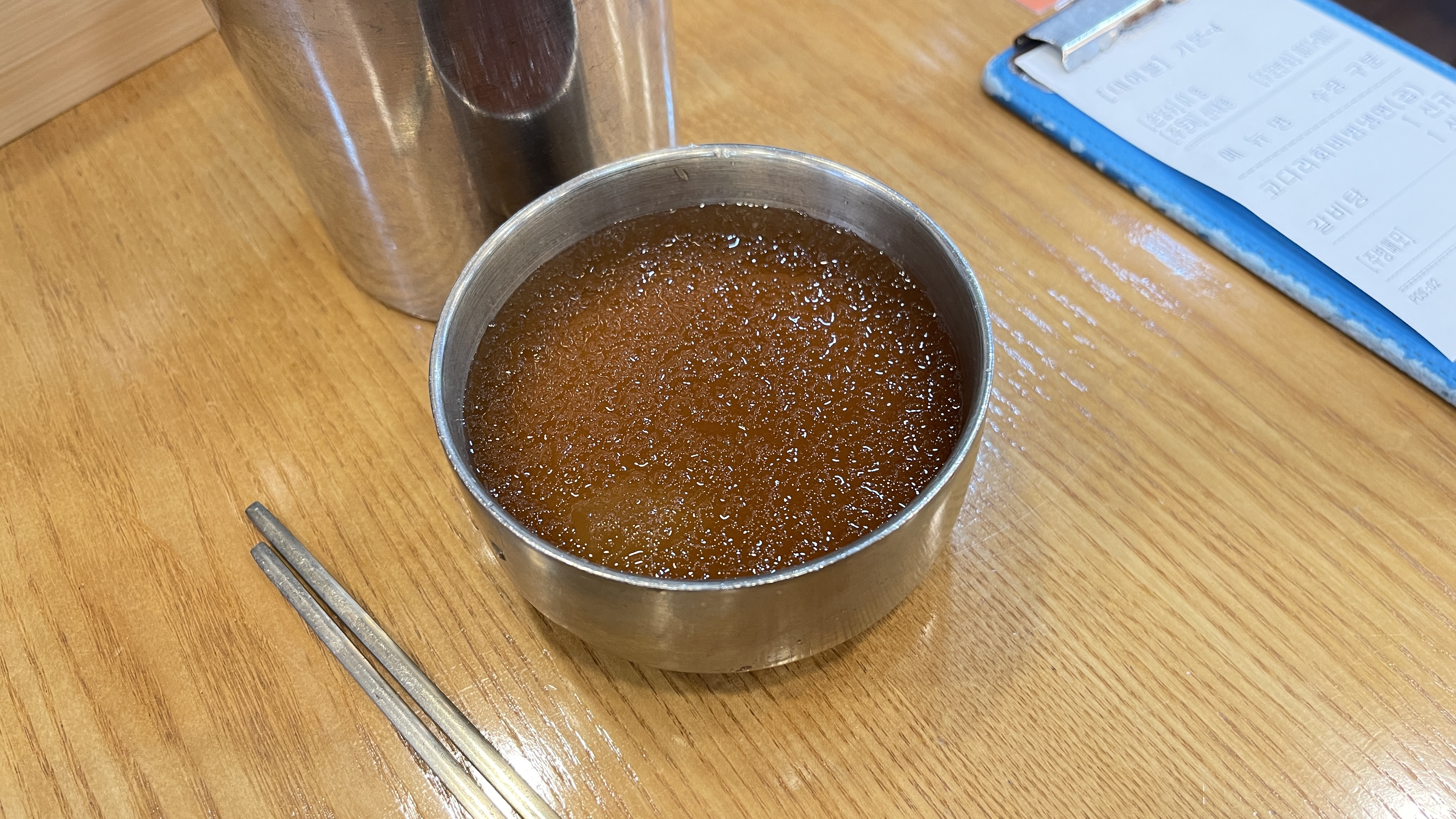 냉면집답게 육수를 떠다가 마실 수 있도록 셀프코너가 준비되어 있다. 가게에서 갈비탕을 직접 판매하고 있어서 같이 푹 고아낸 사골 육수라고 한다. (기름이 떠있는 게 아니라 LED조명이 반사된 것이다)
