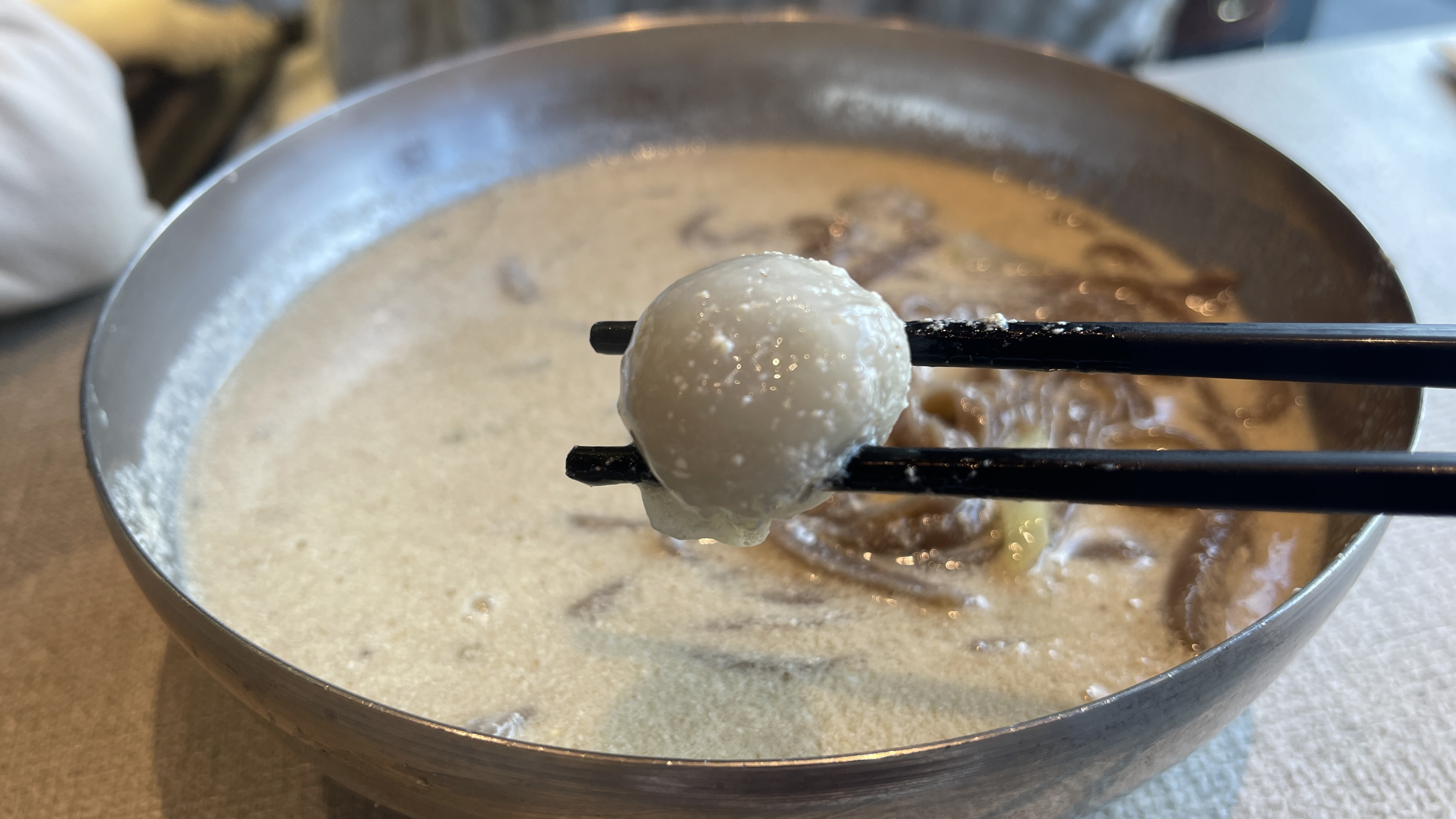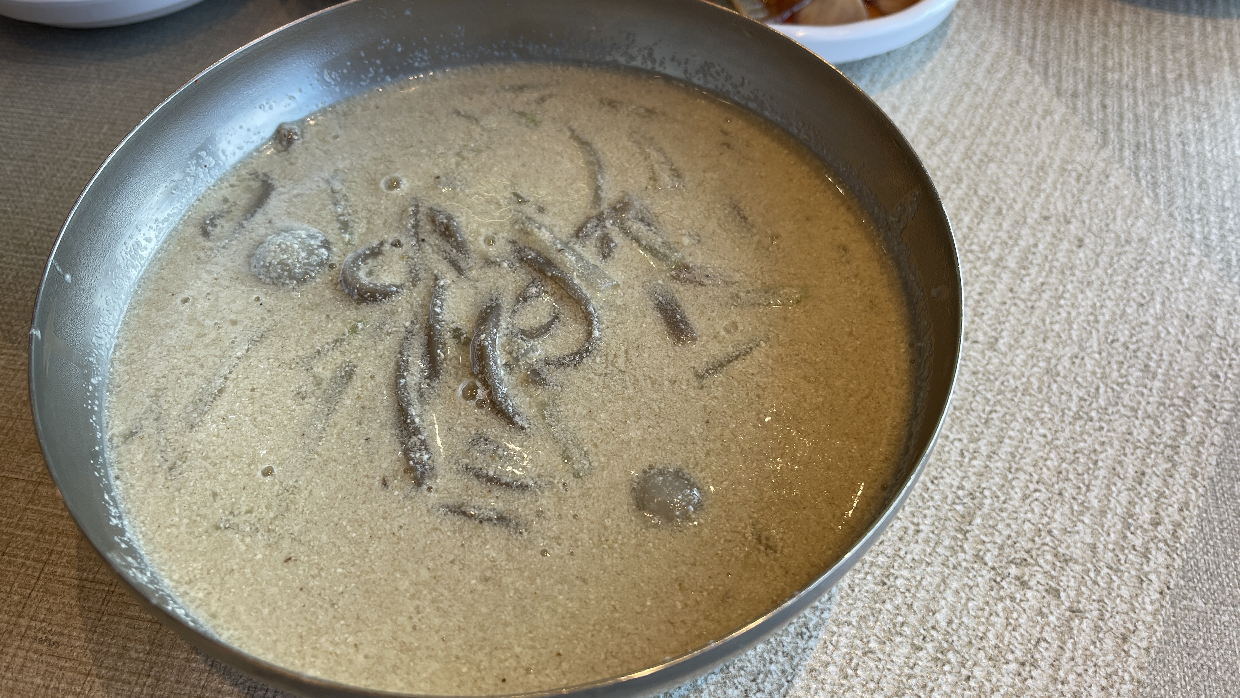 더 오랜 기다림끝에 드디어 보말 전복 칼국수가 나왔다. 처음 받아보고.. 엉? 이게 뭐지? 싶었다. 늘상 보이던 거무튀튀한 육수 국물이 아니라 미소된장국 같은 노란 빛깔의 육수. 그리고 면보다 많아 보이는 미역. 그리고 들깨???