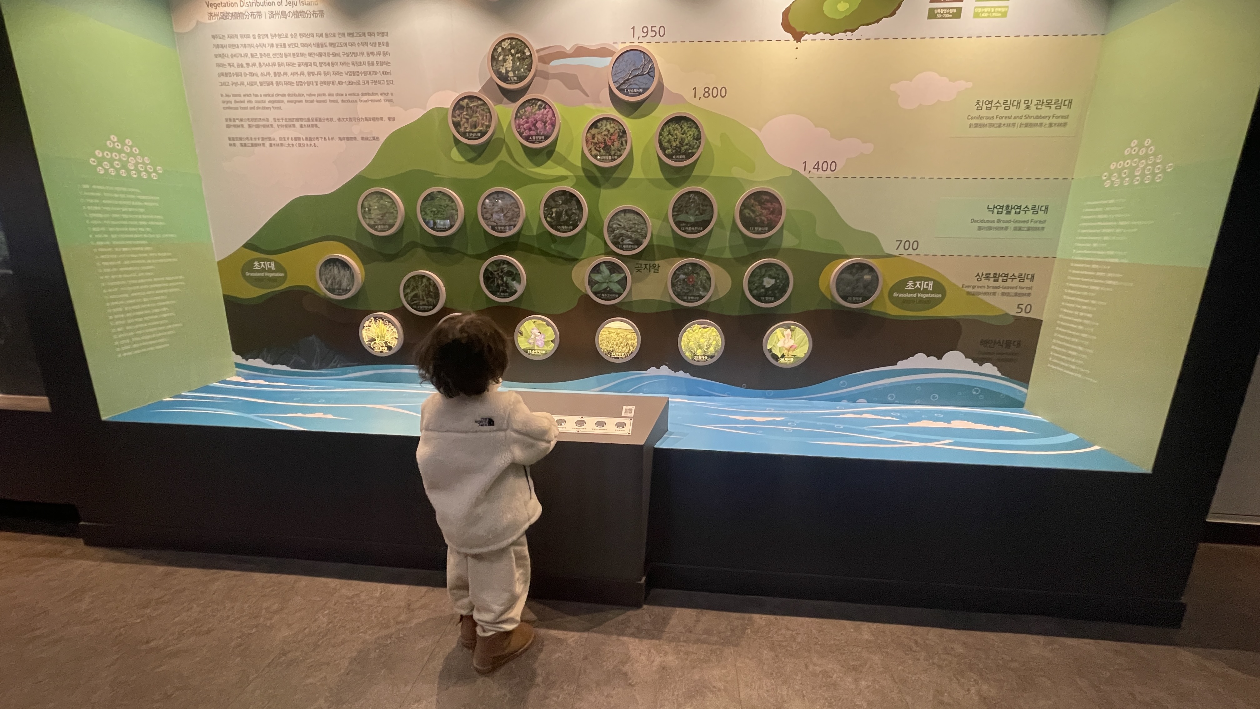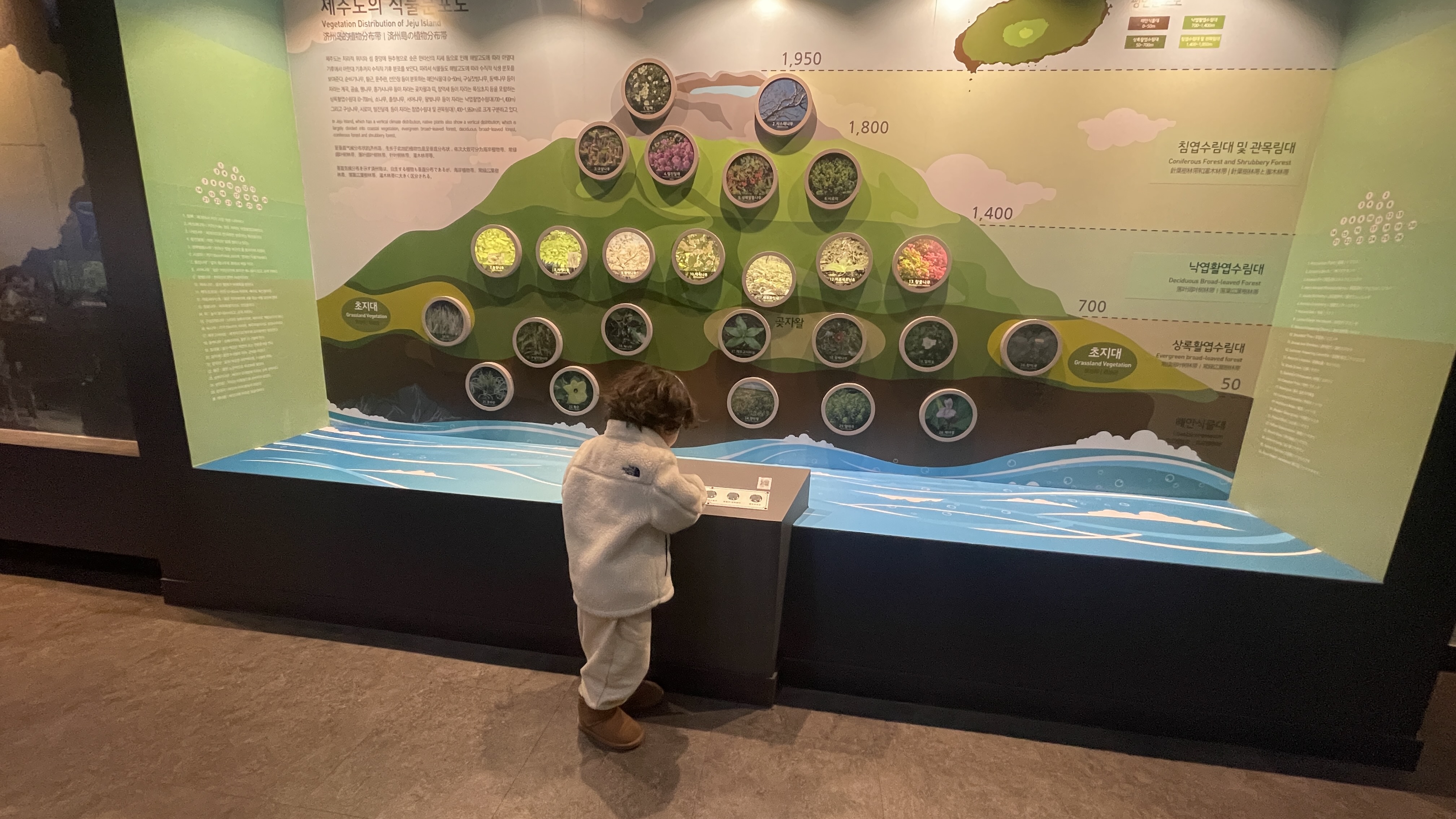 식물의 분포는 잘 모르지만, 버튼을 누를때마다 불빛이 들어오는 모양이 신기해서 눌러보는 라온. 조금 더 커야 이해하겠지?