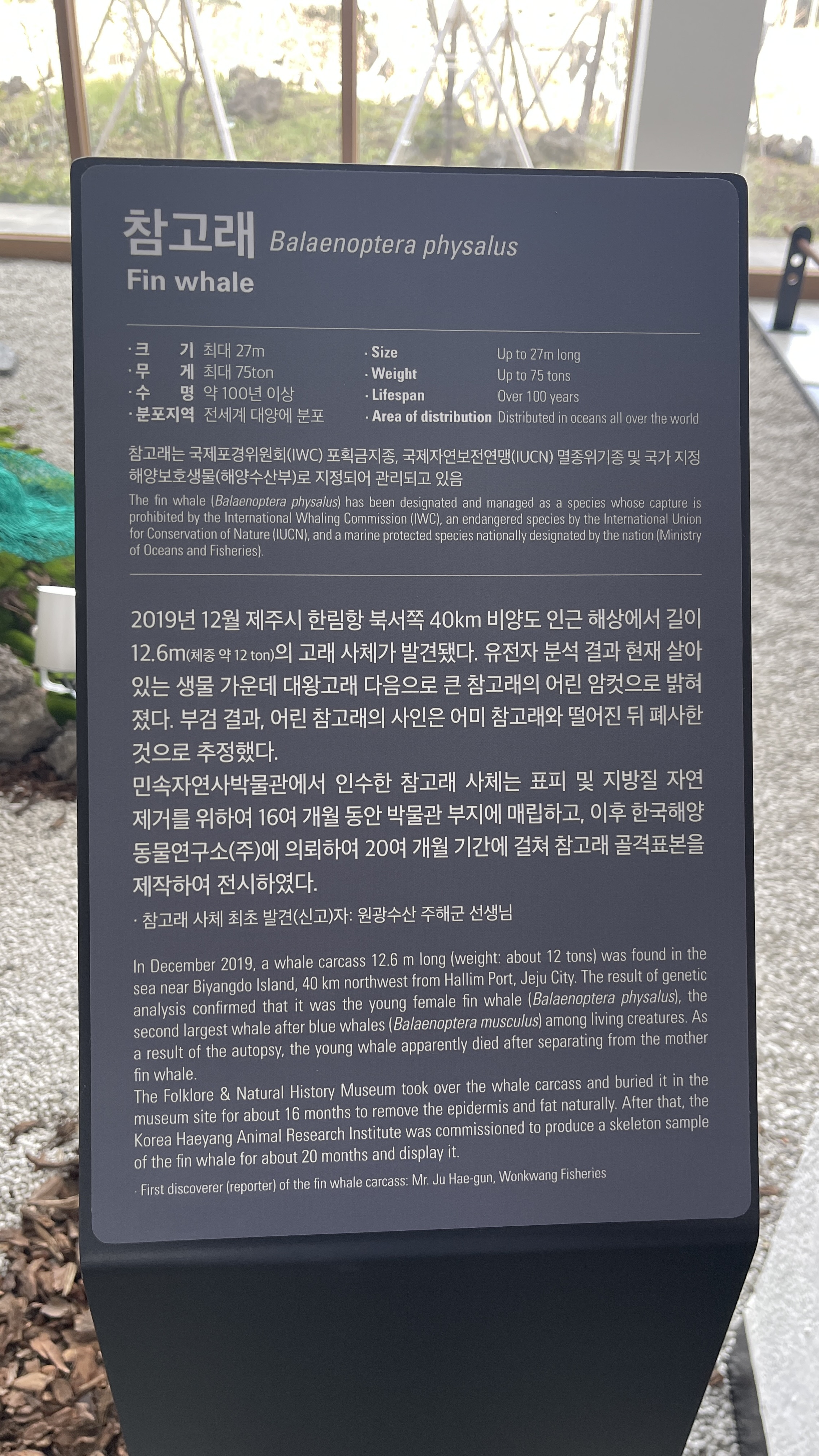 엄청나게 큰 참고래 뼈대가 전시되어 있다. 처음엔 공룡뼈인줄 알았는데.. 고래라니.. 2019년에 비양도 인근 해상에서 길이 12.6m 몸무게 약 12톤의 고래사체가 발견되었다고 한다. 대왕고래 다음으로 큰 생물이 참고래라고 하는데 조사결과 어린암컷이라고 하며 어미 참고래와 떨어진 뒤 폐사한 것으로 추정된다고 한다. 어미를 잃고 얼마나 외로웠을까.. 지금은 아이들의 호기심을 위해 이렇게 또 제대로 쉬지 못하고 있구나.