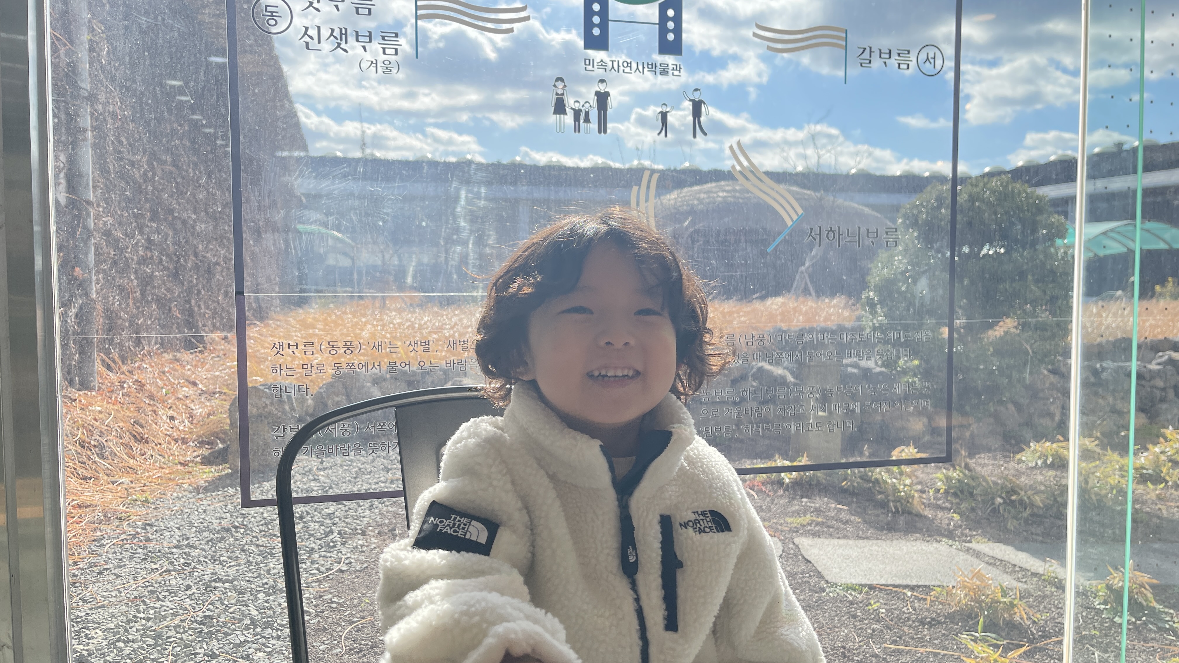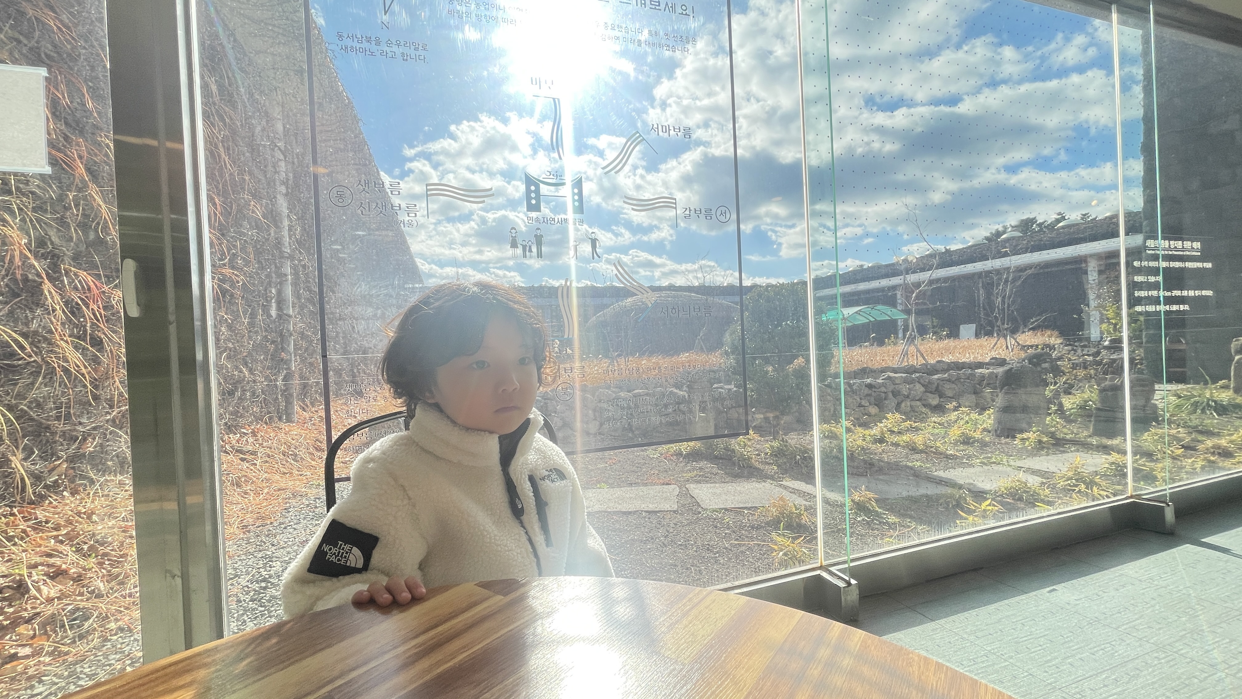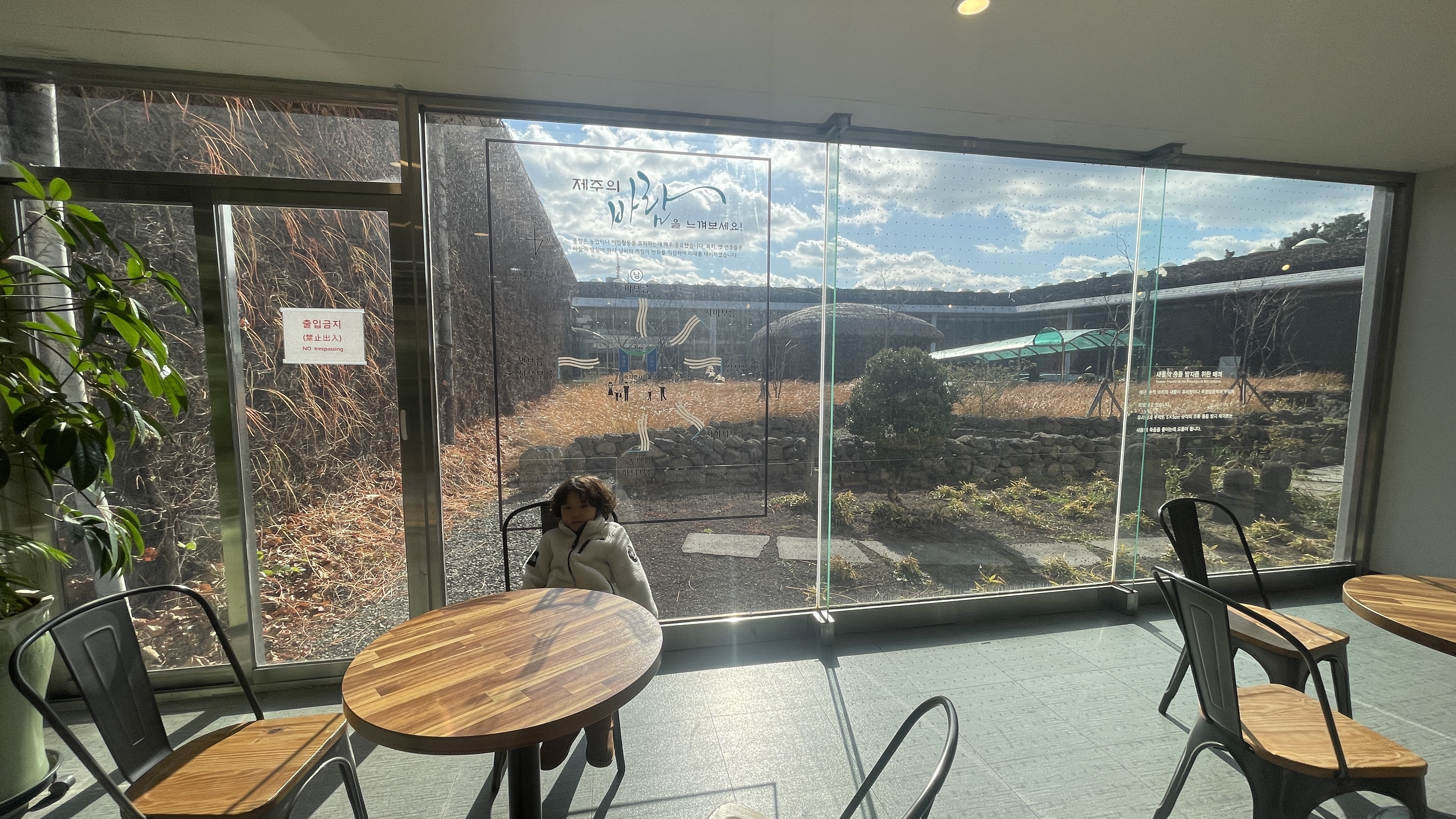 박물관의 외부 전경이 고스란히 보이는 통유리창. 그리고 따뜻한 햇살. 얼마전 강릉의 한 카페에서 보았던 것과 비슷한 느낌이 나서인지 라온이가 자리를 잡고 앉아본다.